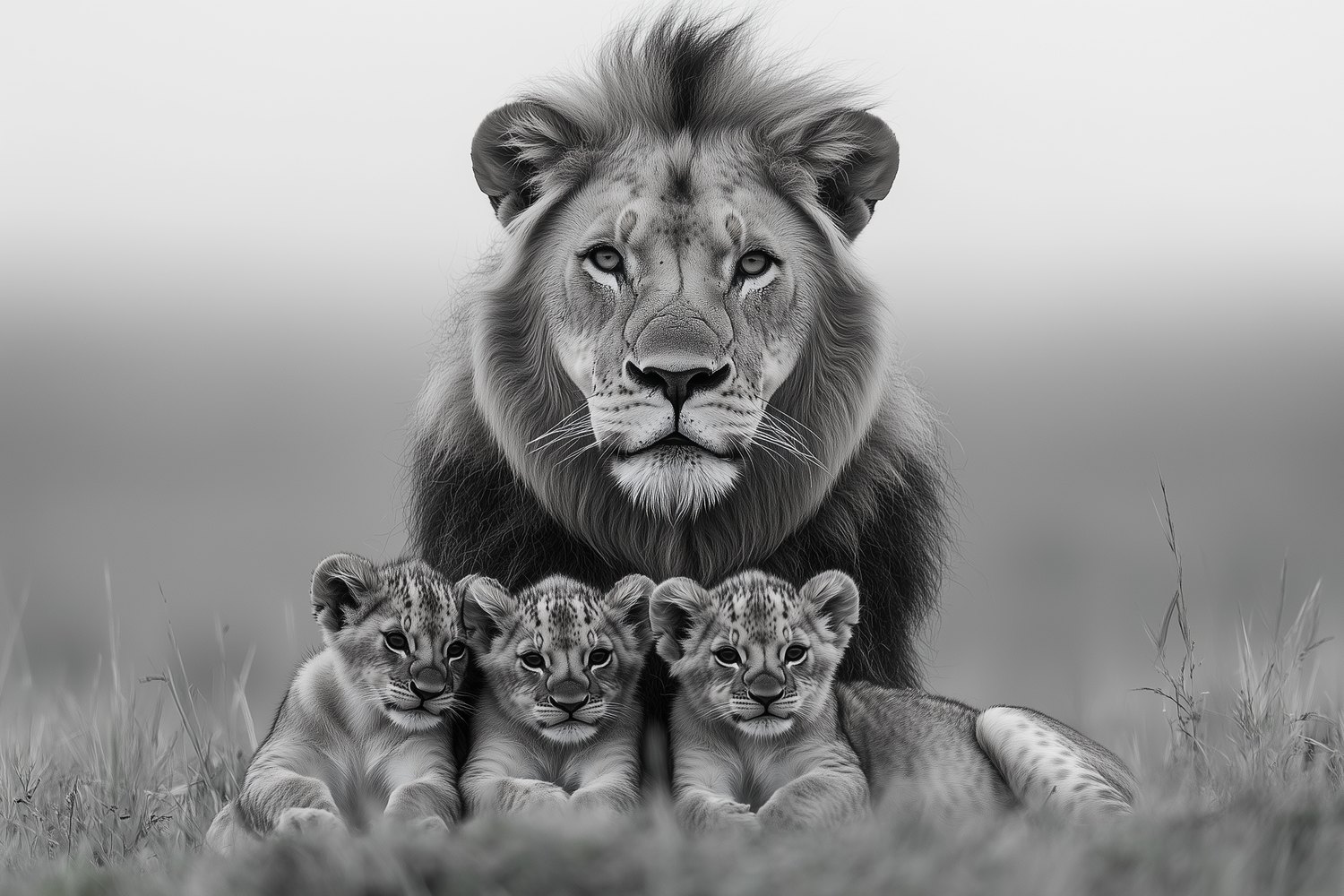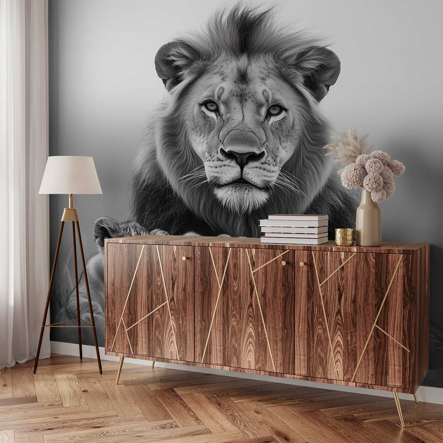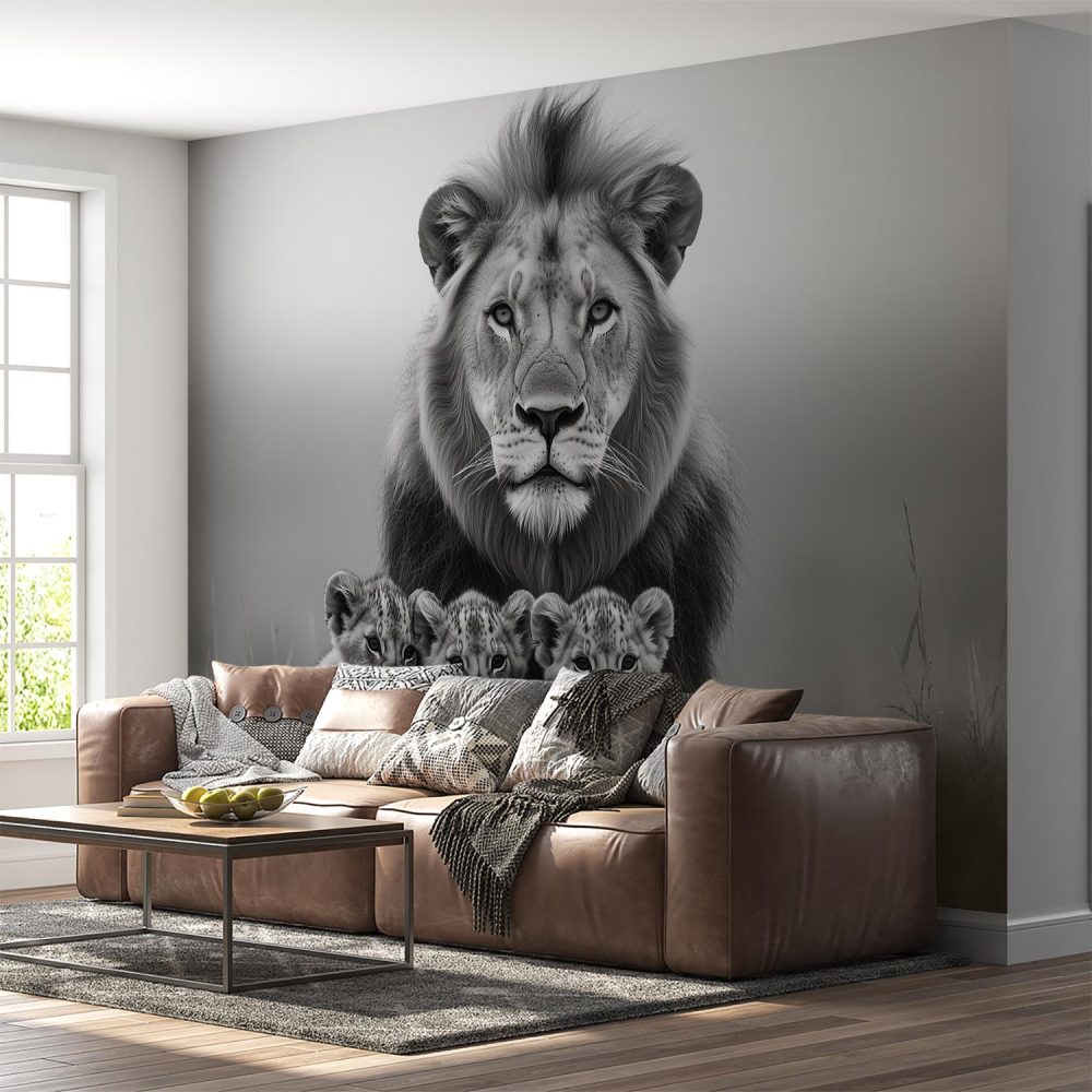 Terug naar collectie / Behang / Machtige leeuwenfamilie in zwart-wit behang