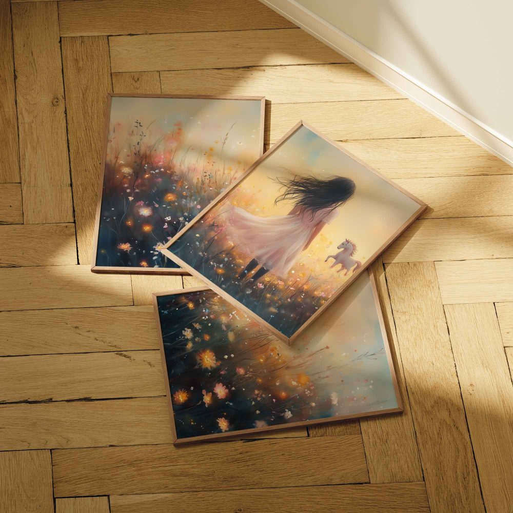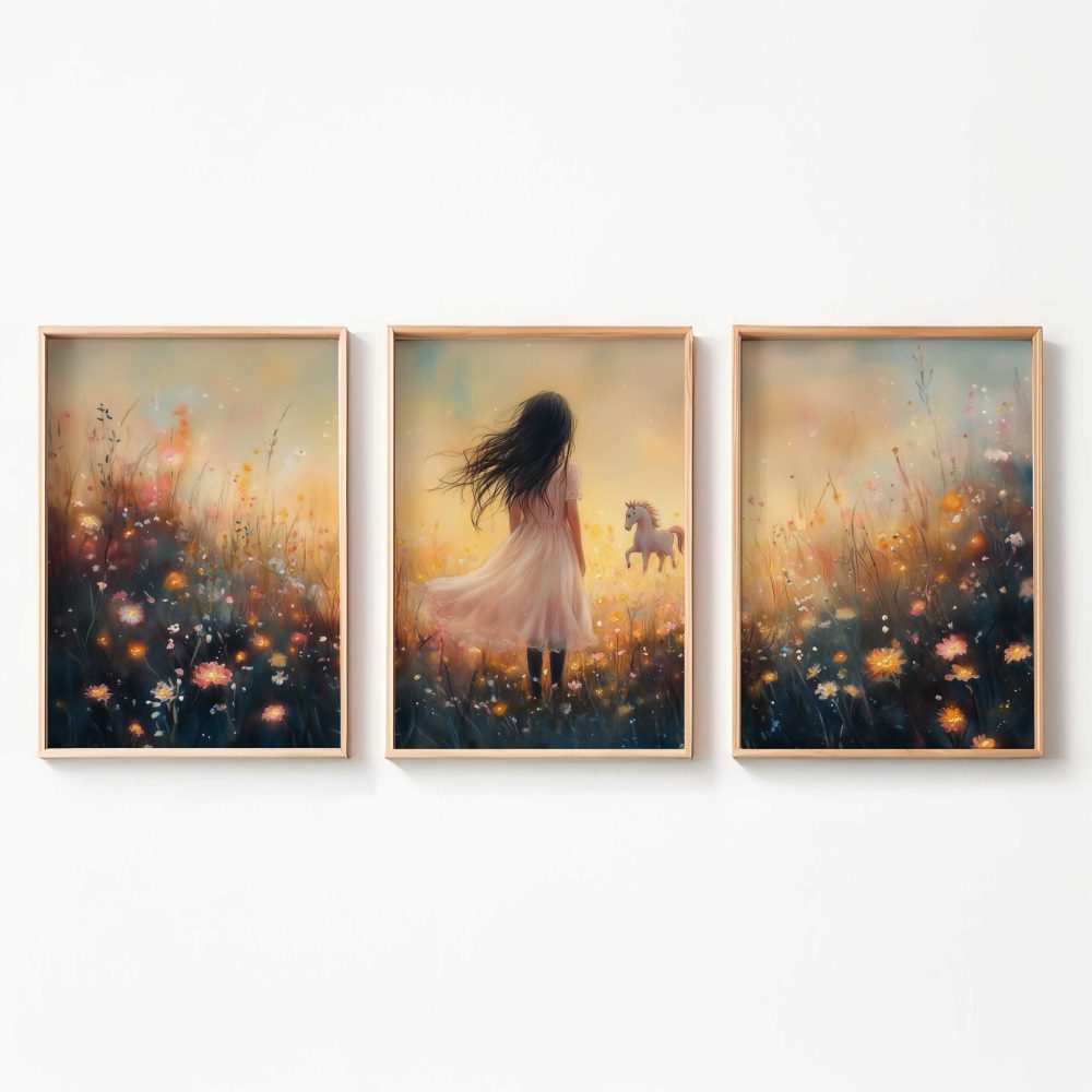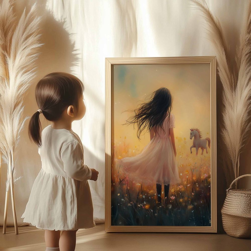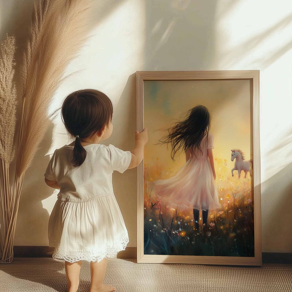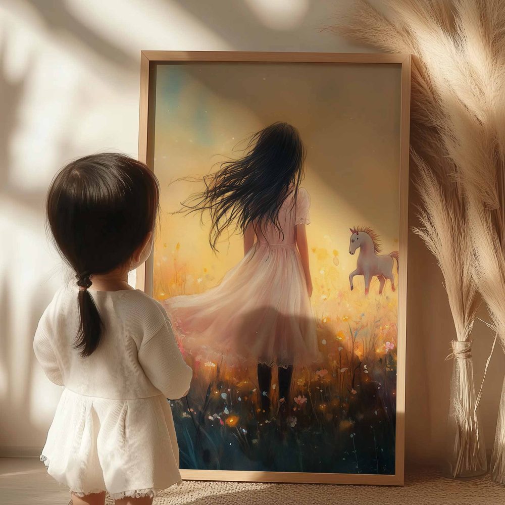 Terug naar collectie / Uncategorized / Magisch Meisje en Eenhoorn in Pastel Bloemenveld