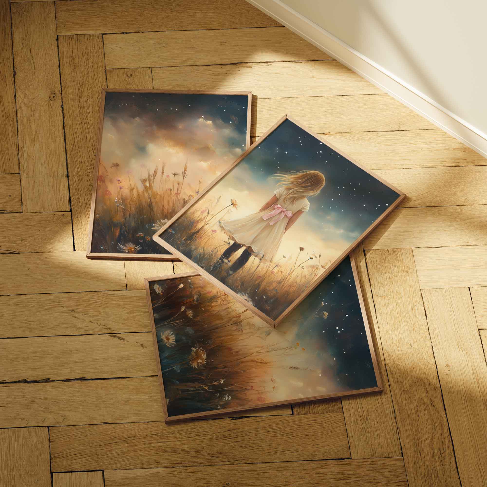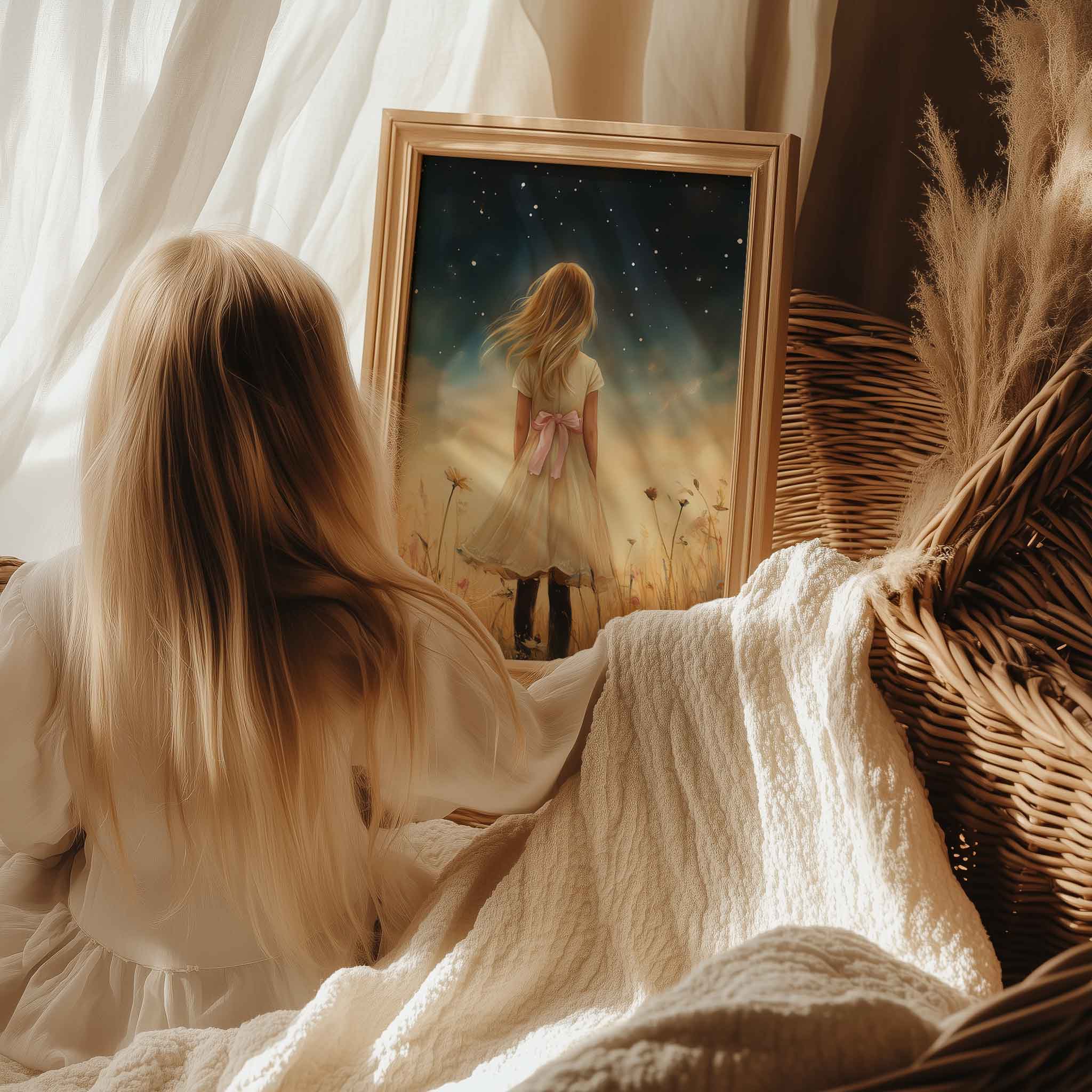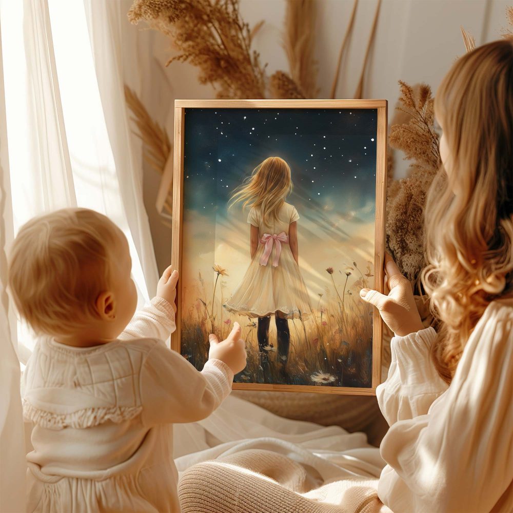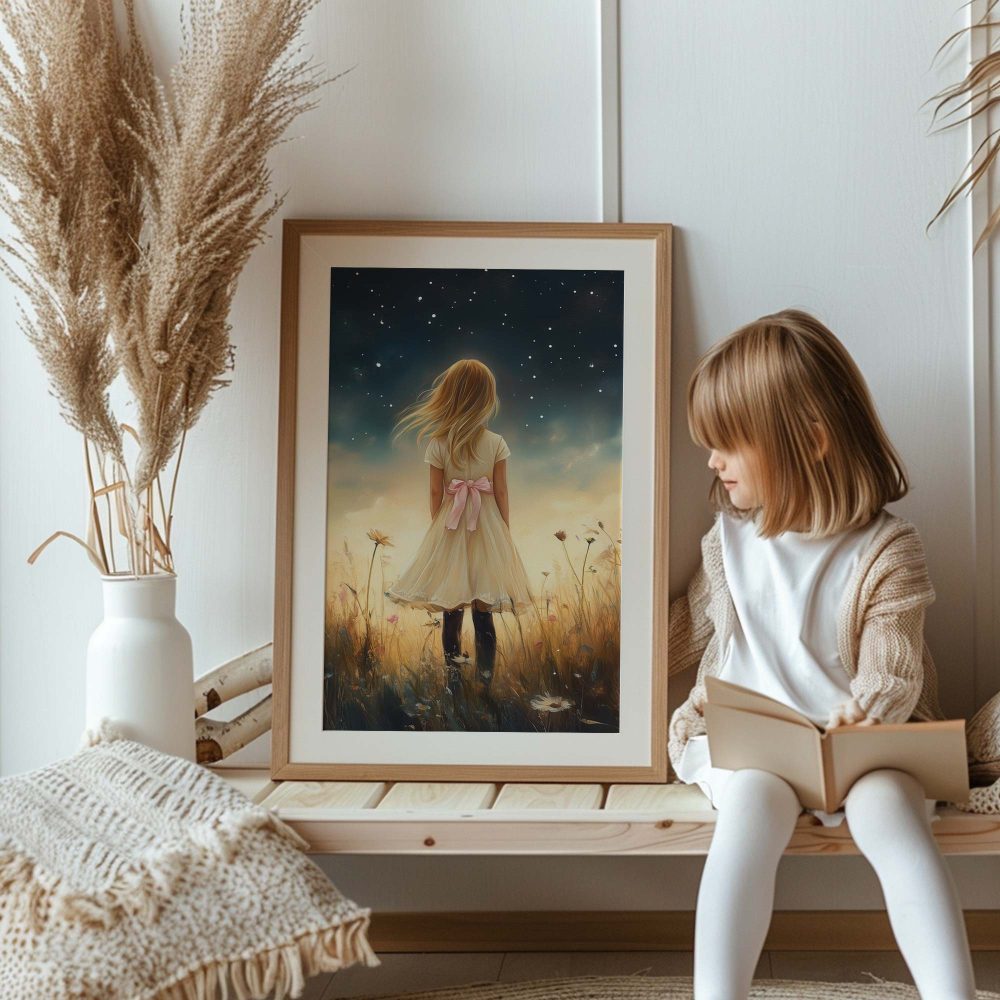 Terug naar collectie / Uncategorized / Magisch Meisje in Bloemenveld onder Sterrenhemel