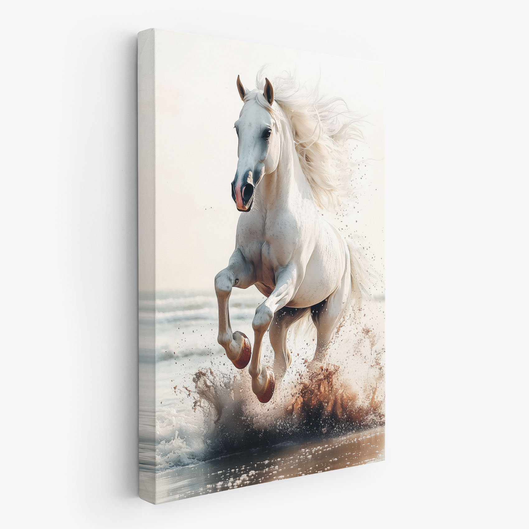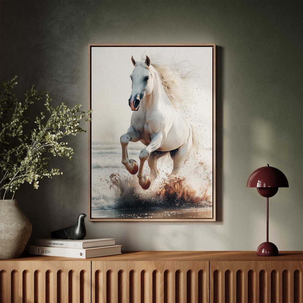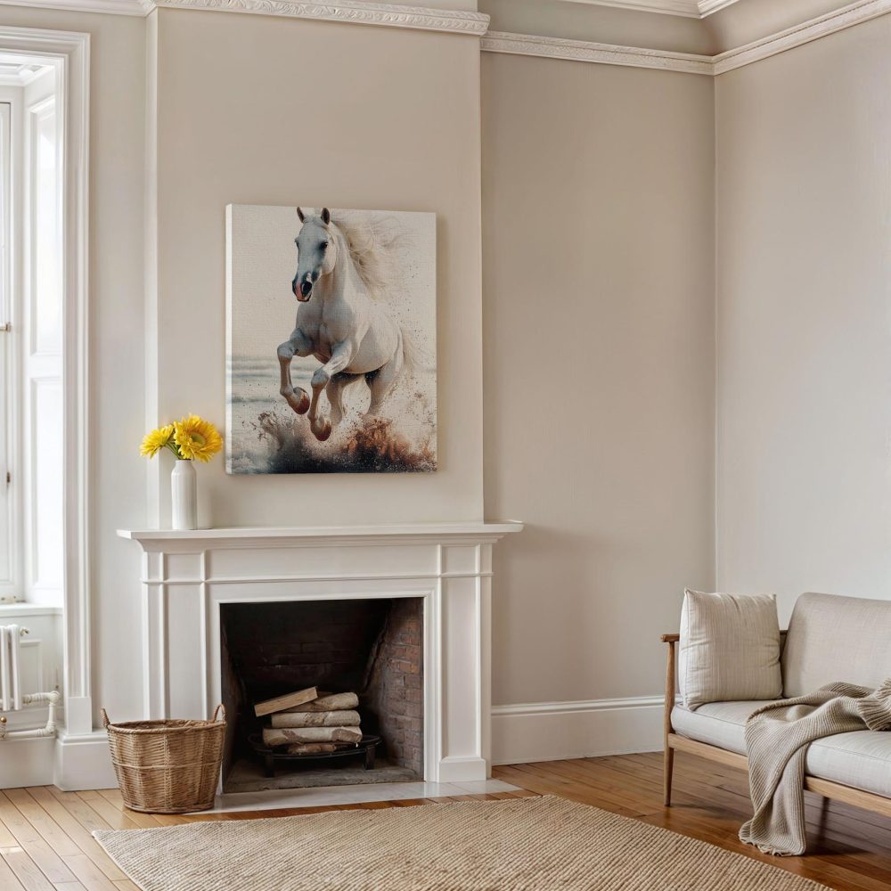 Terug naar collectie / Schilderijen / Dieren Schilderij / Majestueus wit paard strandgalop