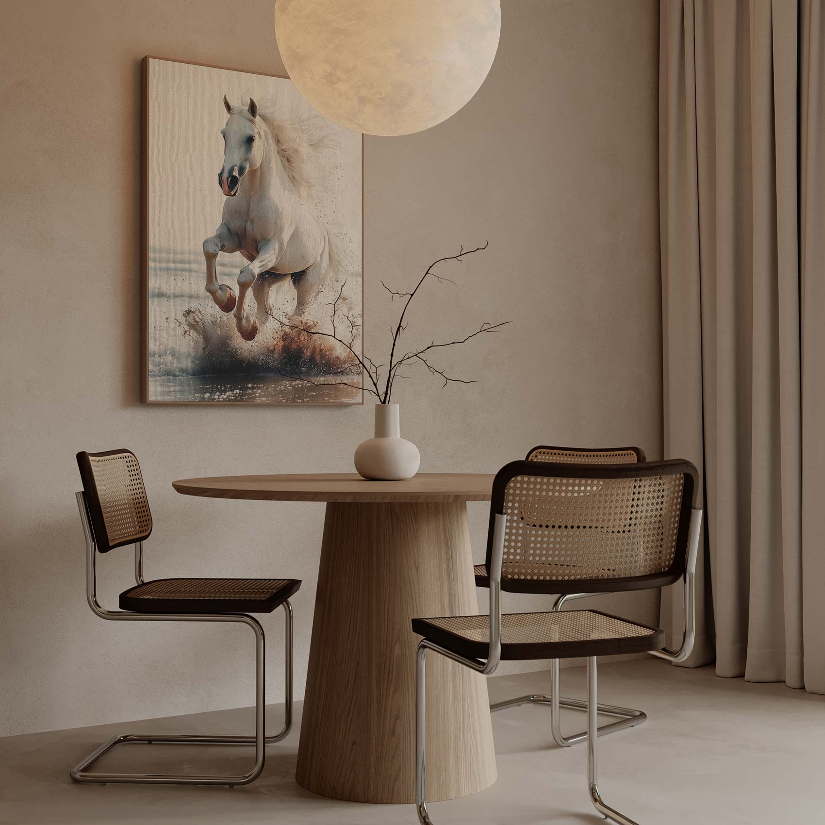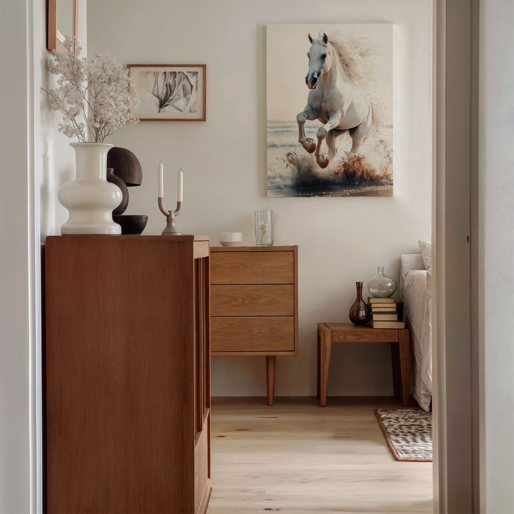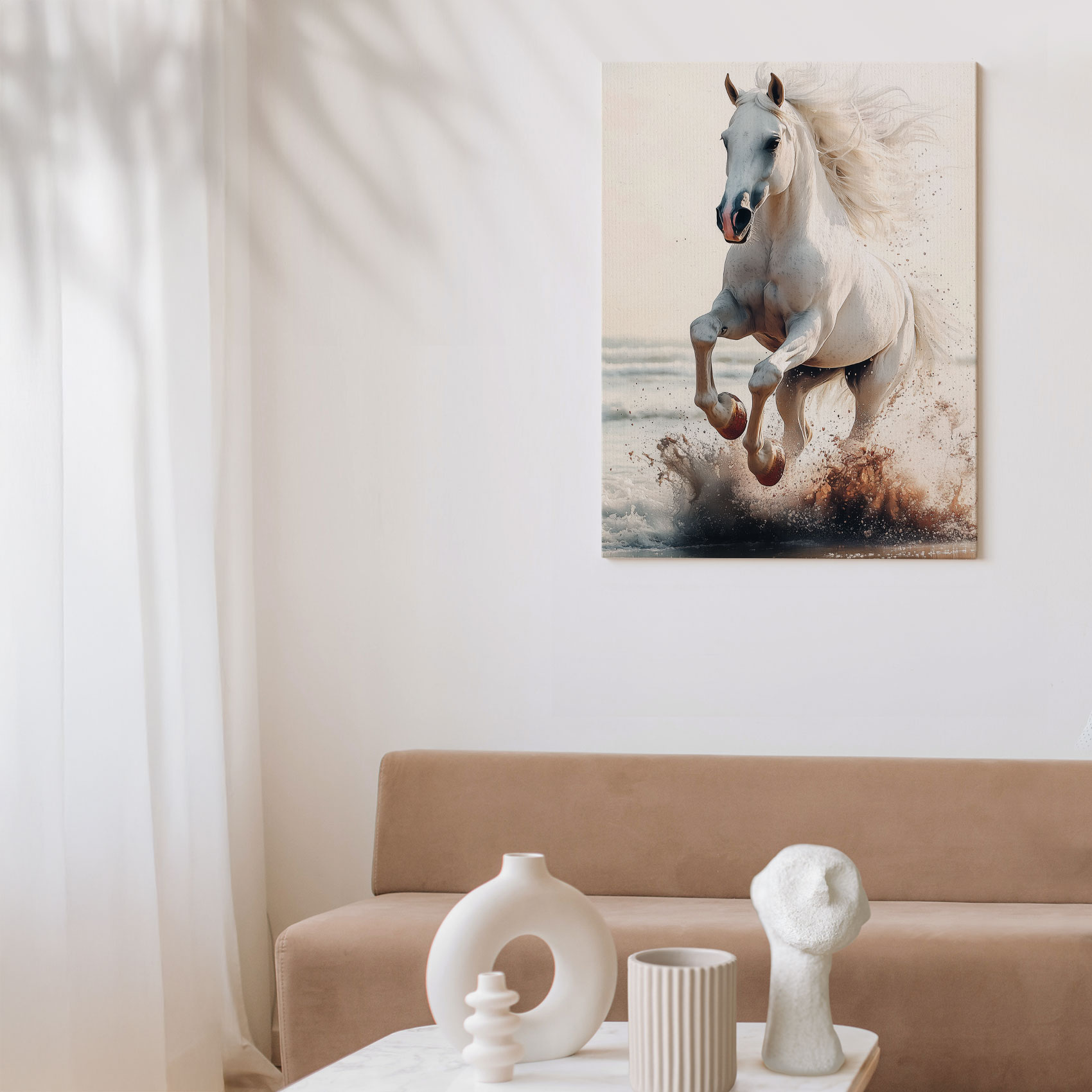 Terug naar collectie / Schilderijen / Dieren Schilderij / Majestueus wit paard strandgalop