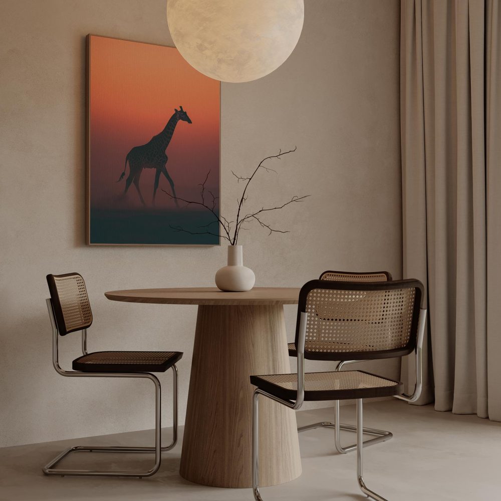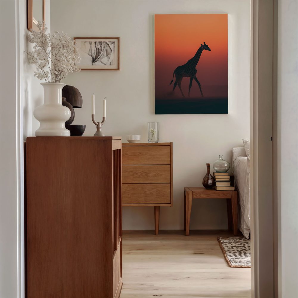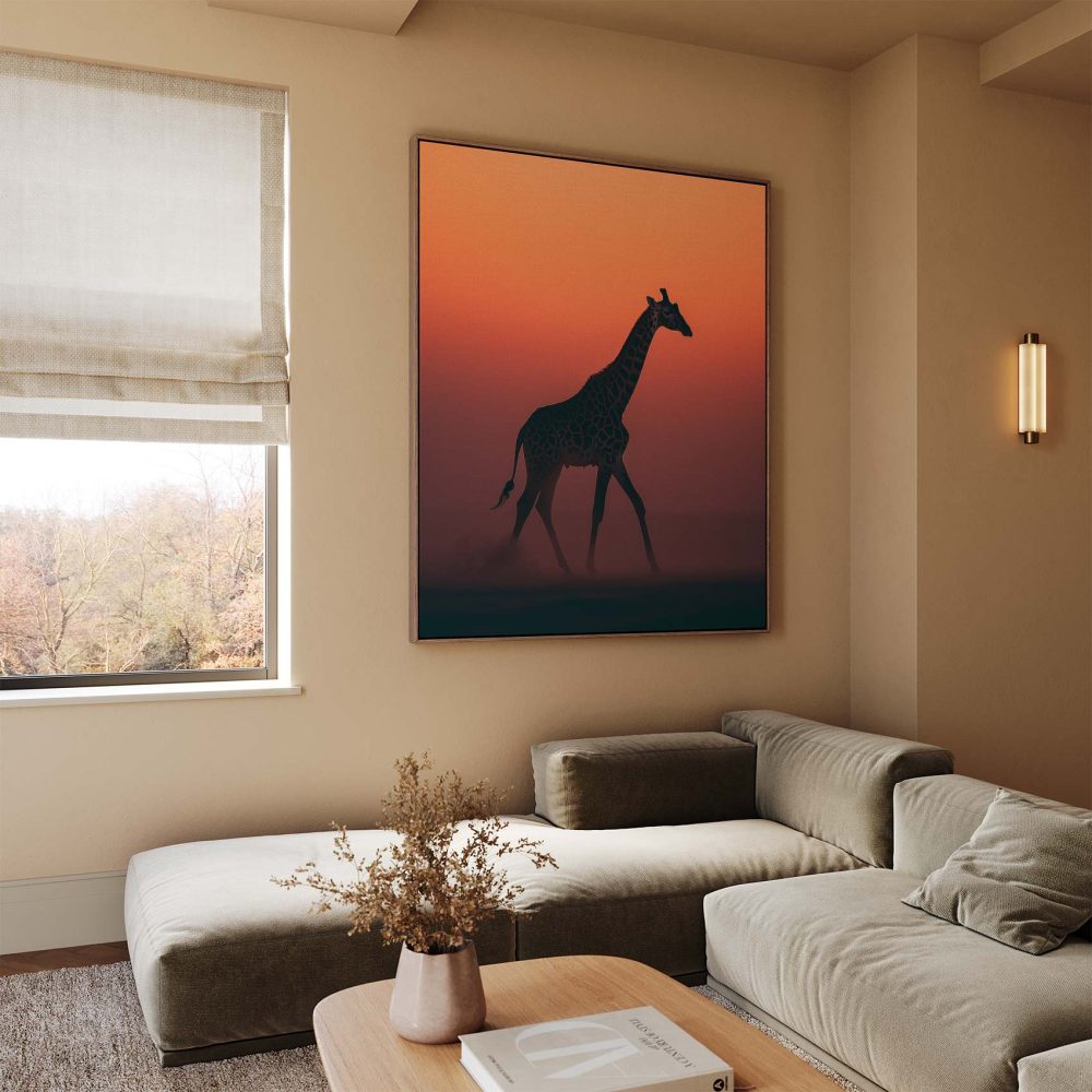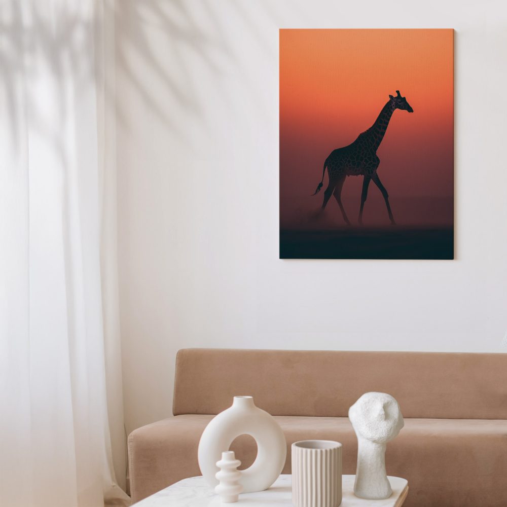 Terug naar collectie / Schilderijen / Dieren Schilderij / Majestueuze giraf bij zonsondergang