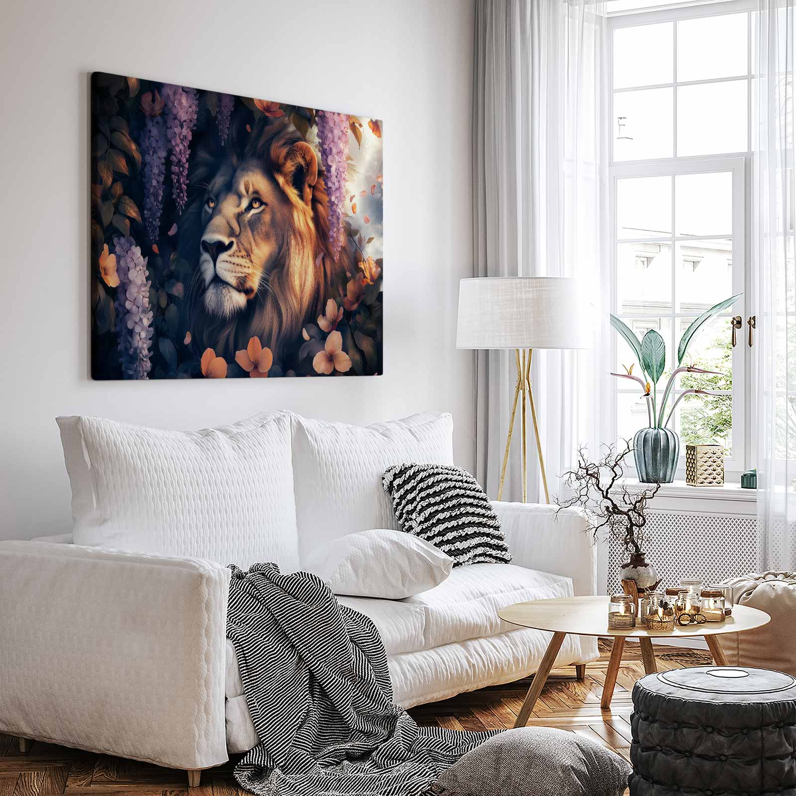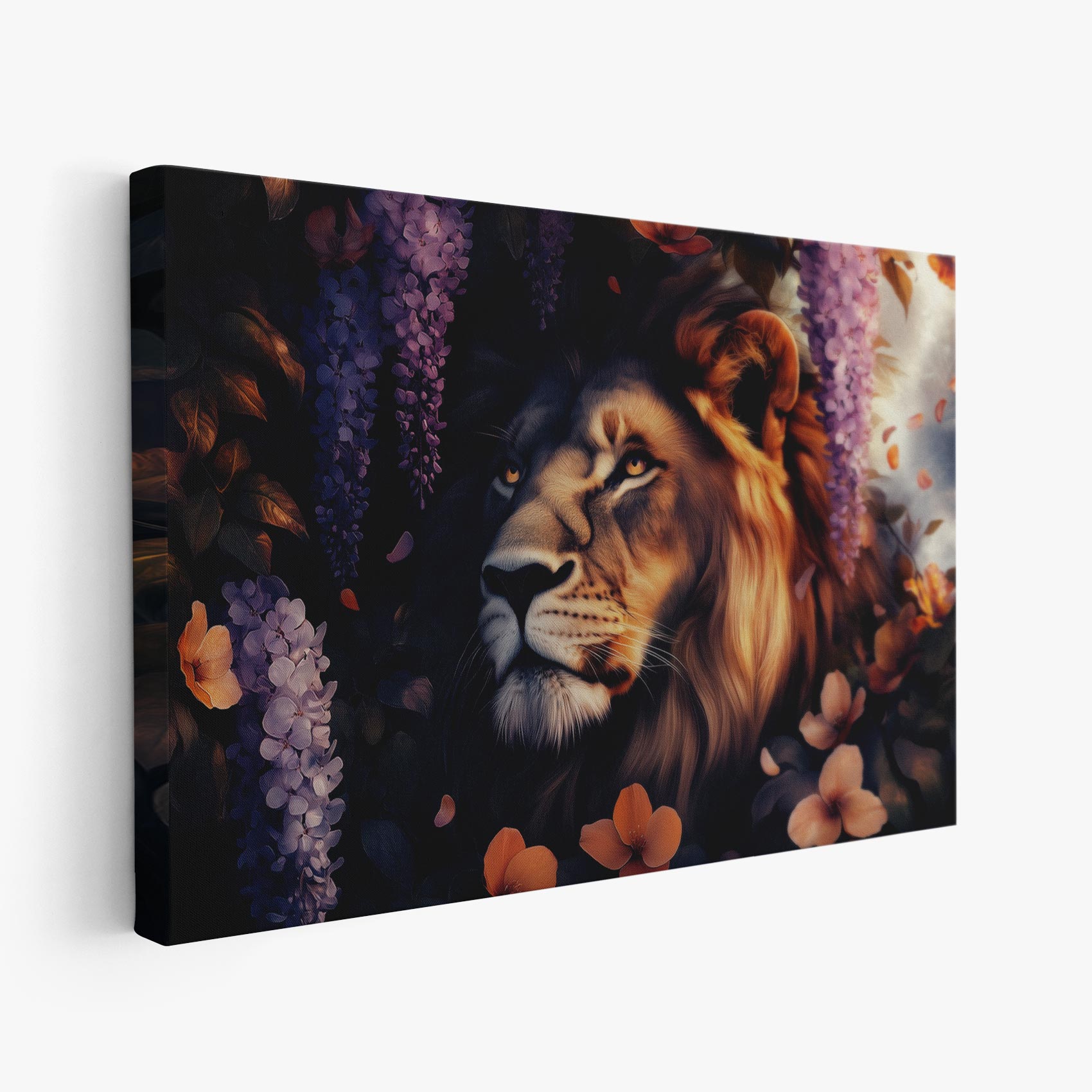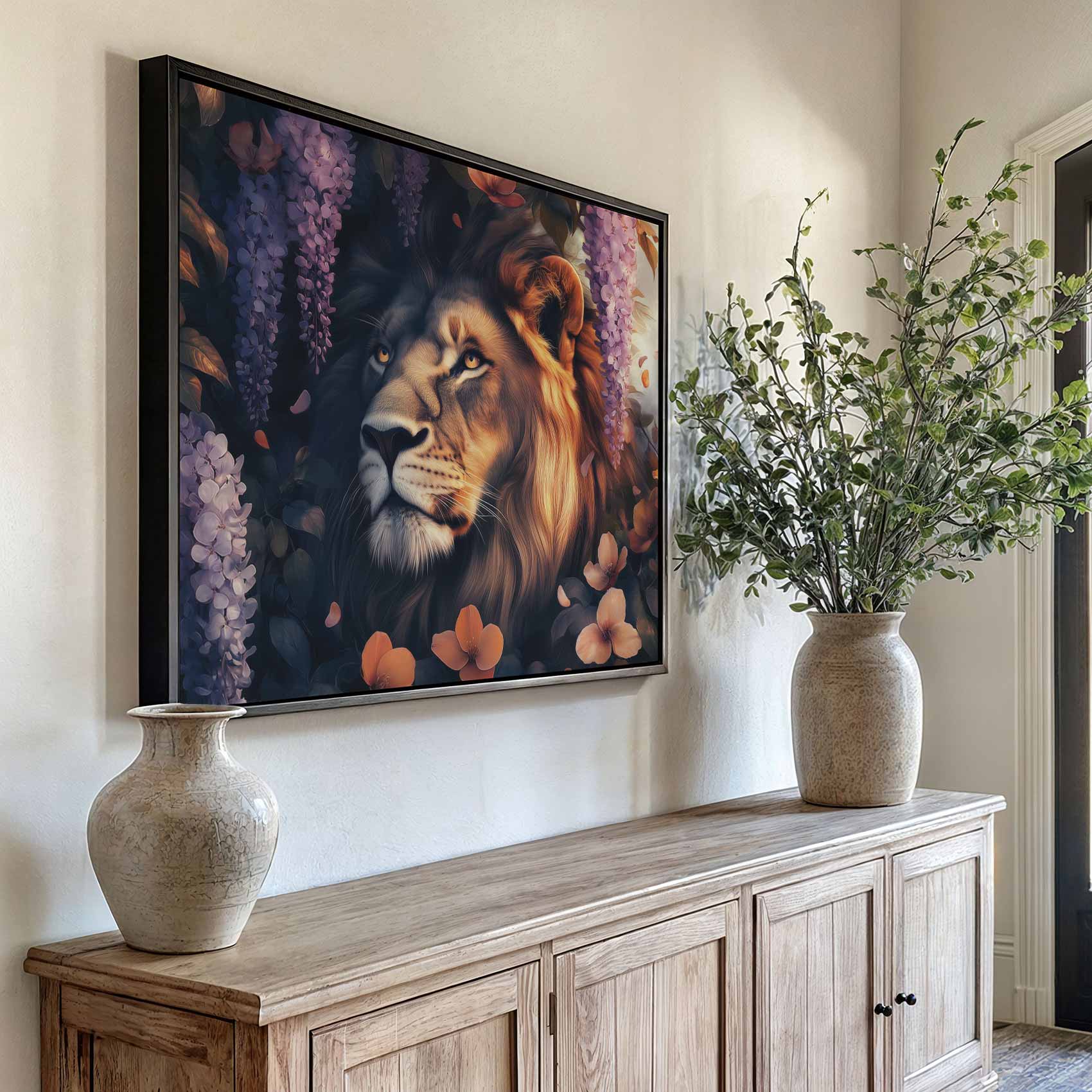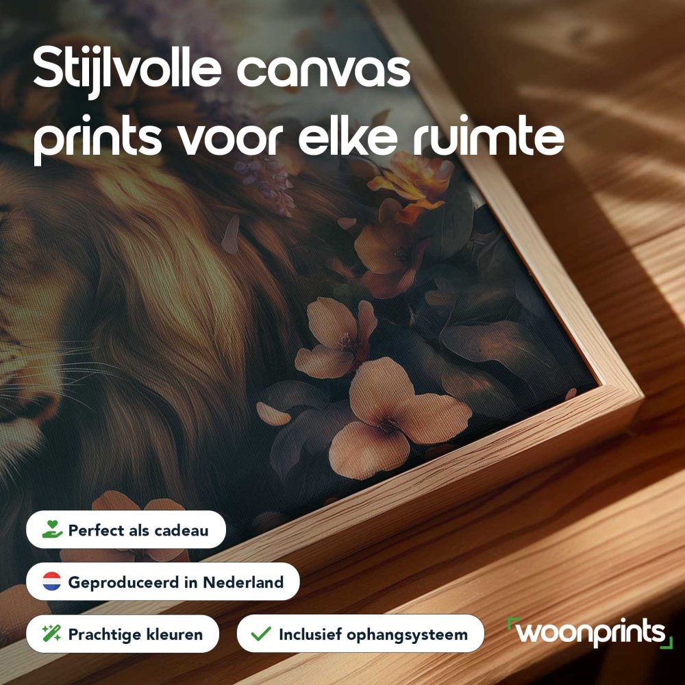 Terug naar collectie / Schilderijen / Bloemen Schilderij / Majestueuze leeun in bloementuin