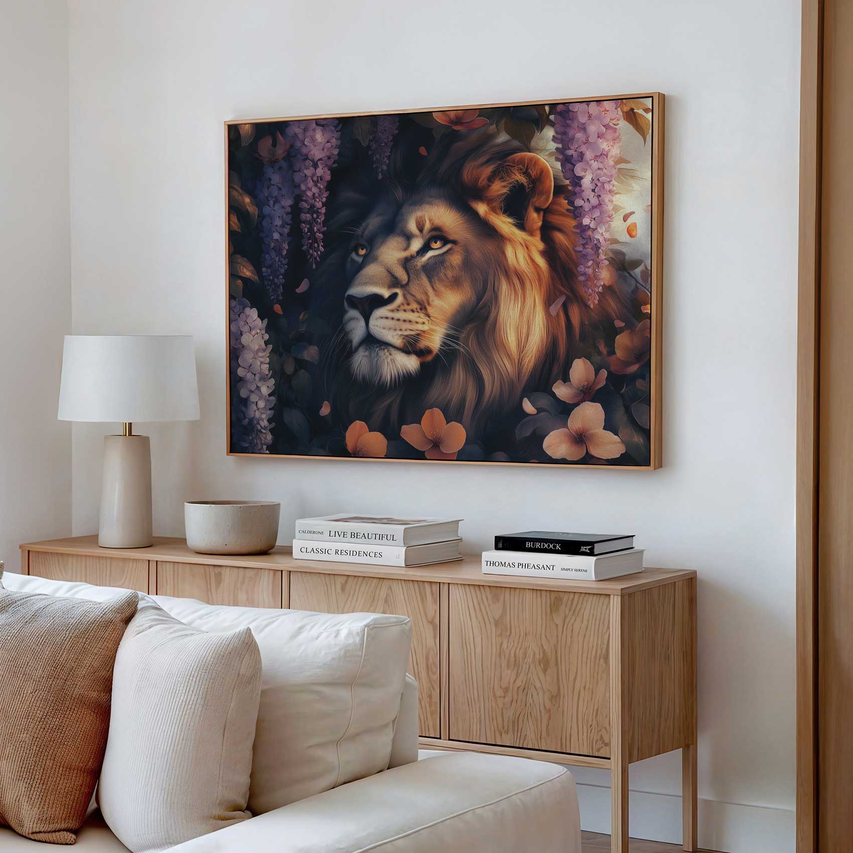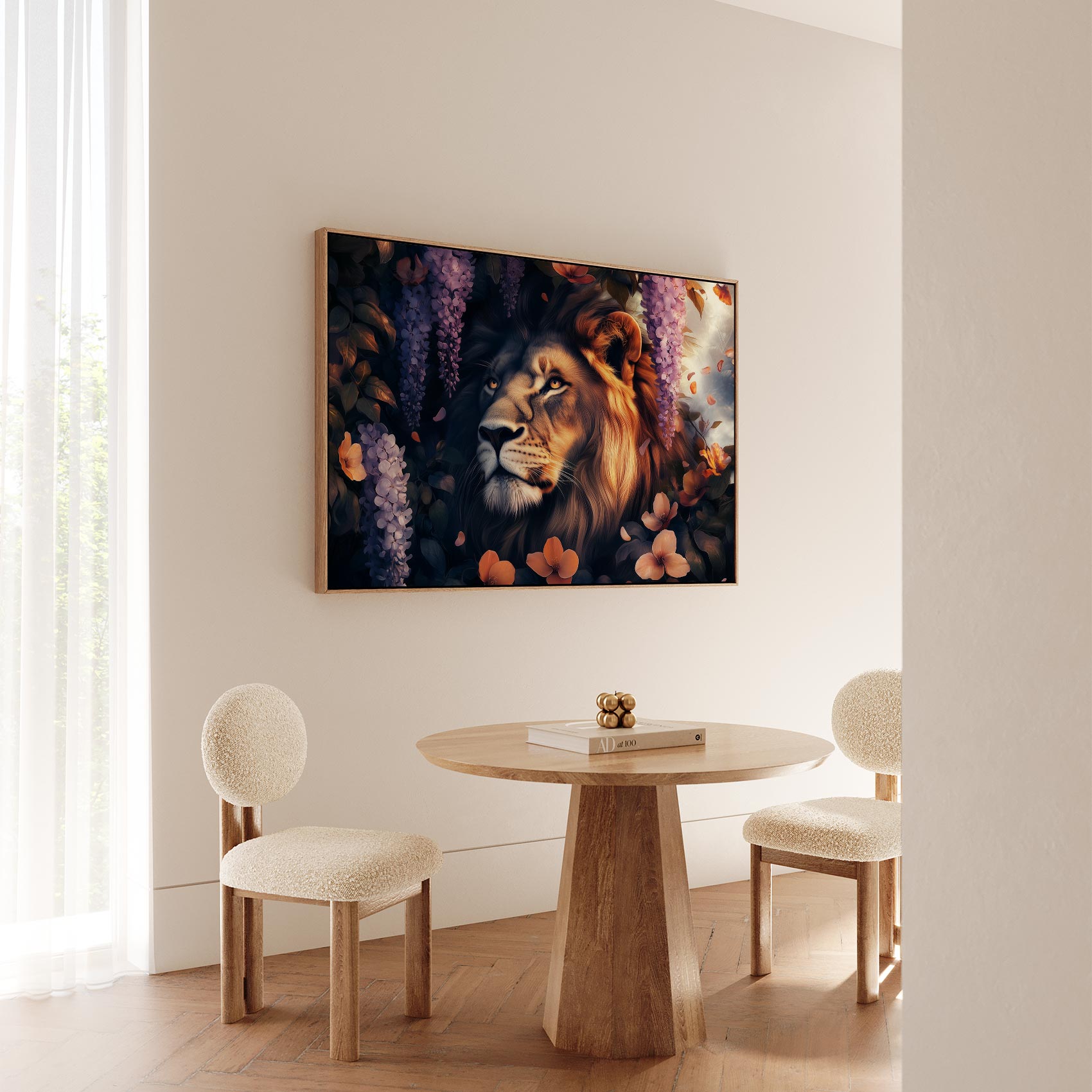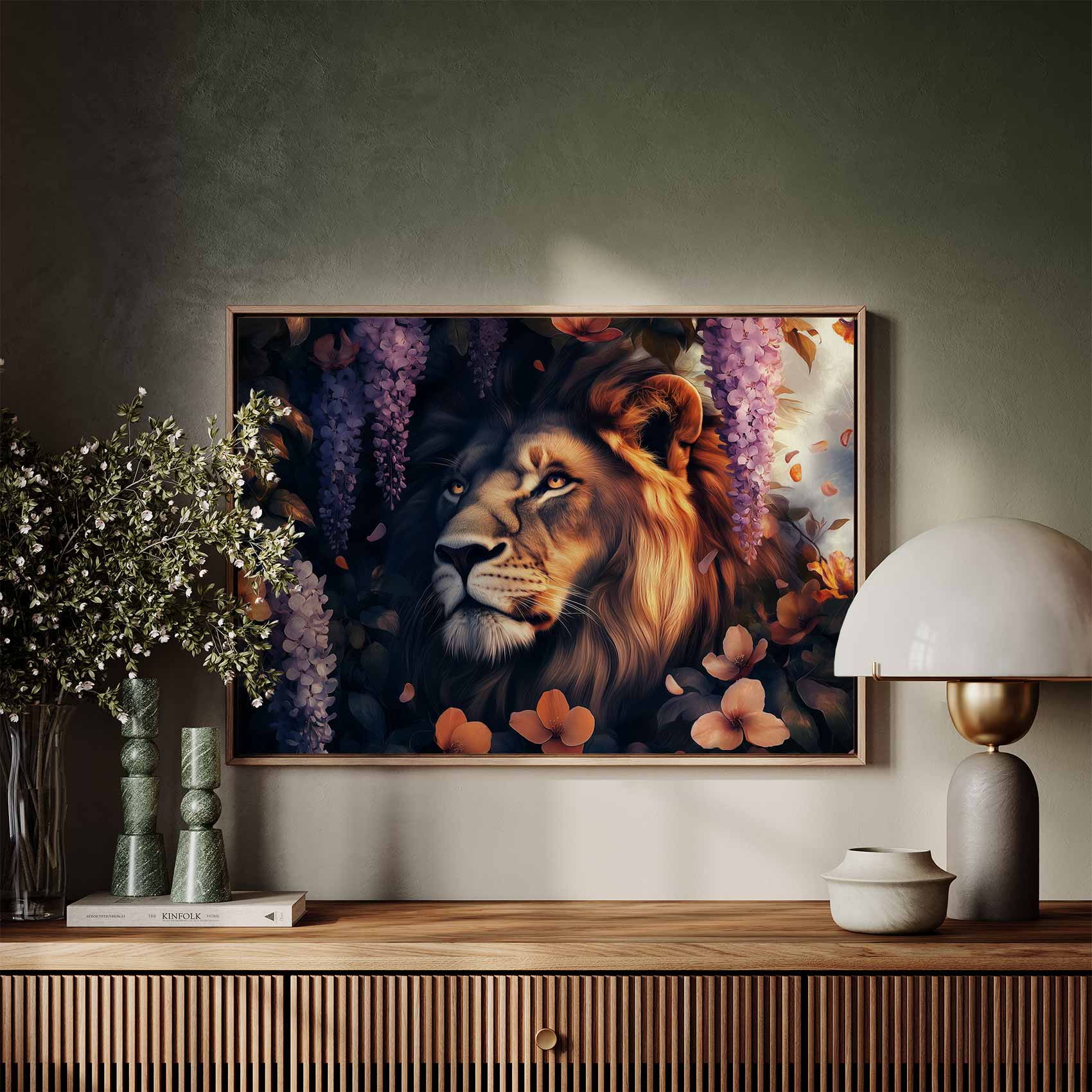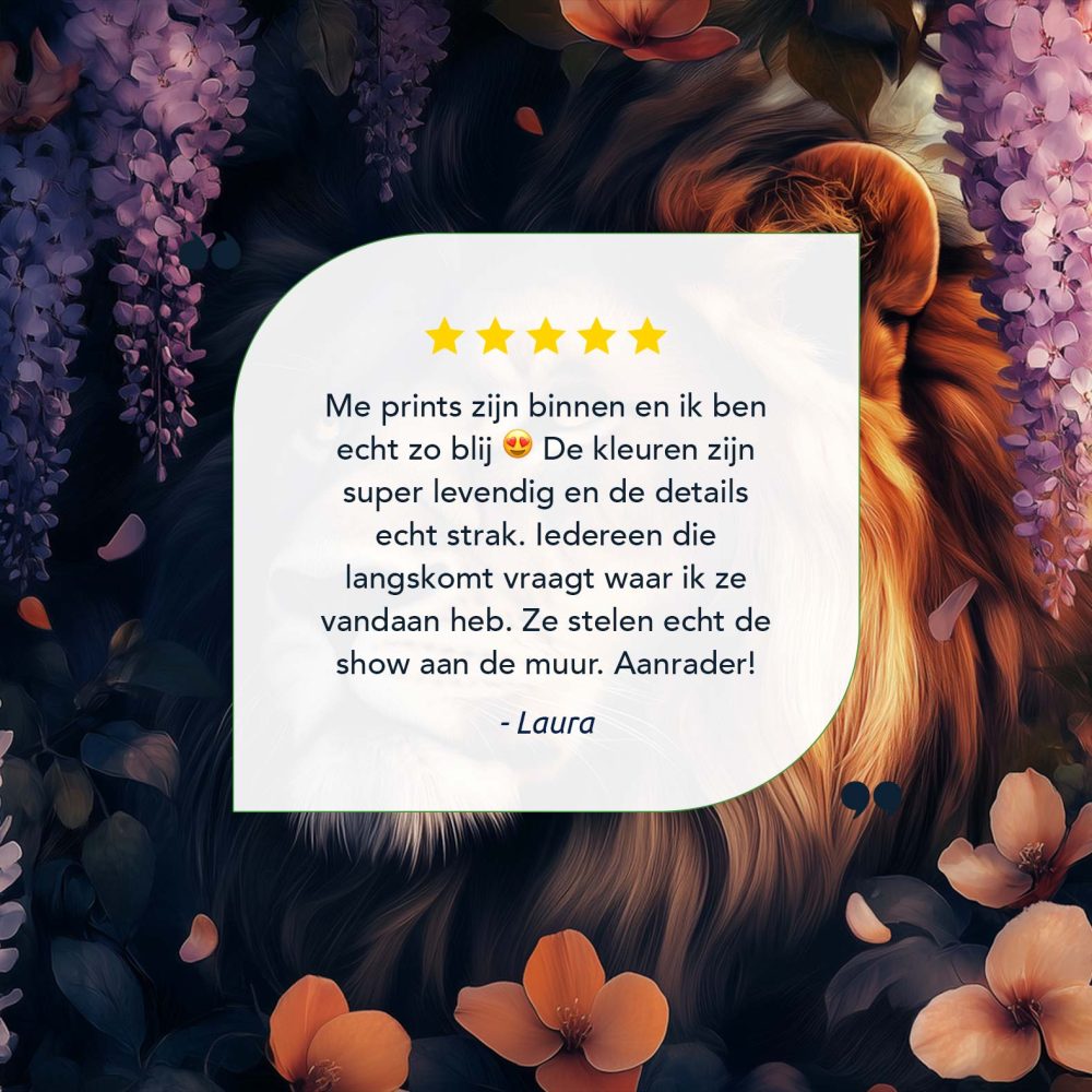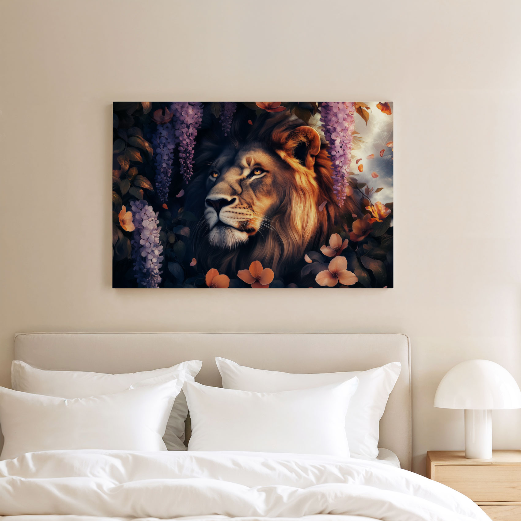 Terug naar collectie / Schilderijen / Bloemen Schilderij / Majestueuze leeun in bloementuin