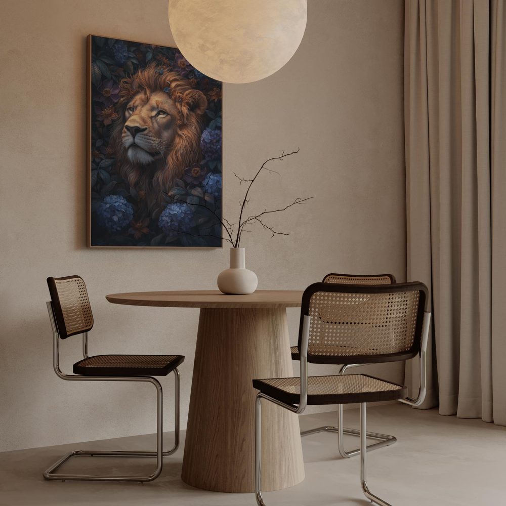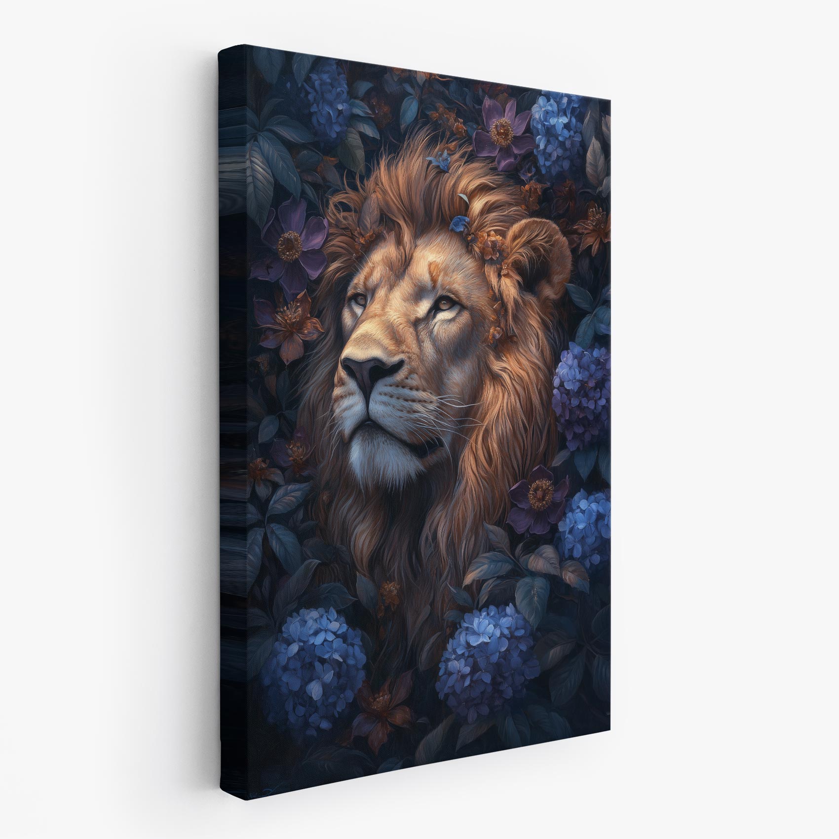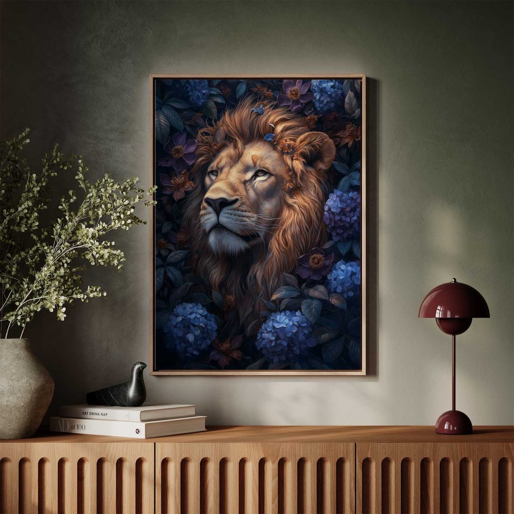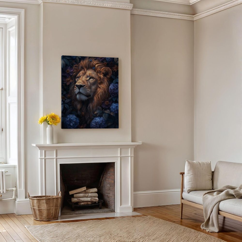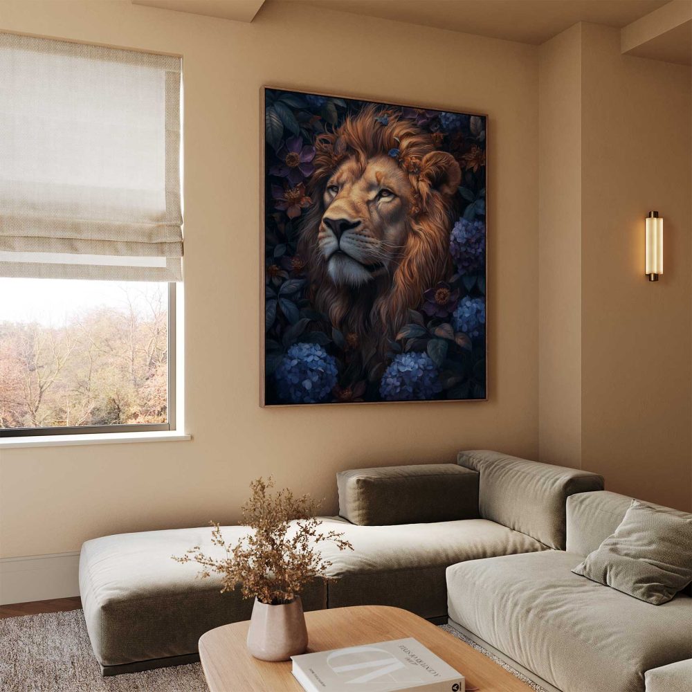 Terug naar collectie / Schilderijen / Bloemen Schilderij / Majestueuze leeuw in bloemenpracht