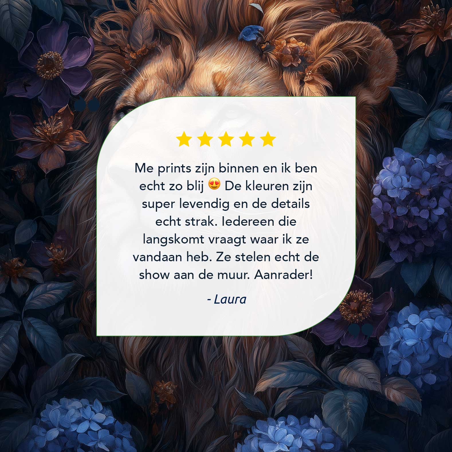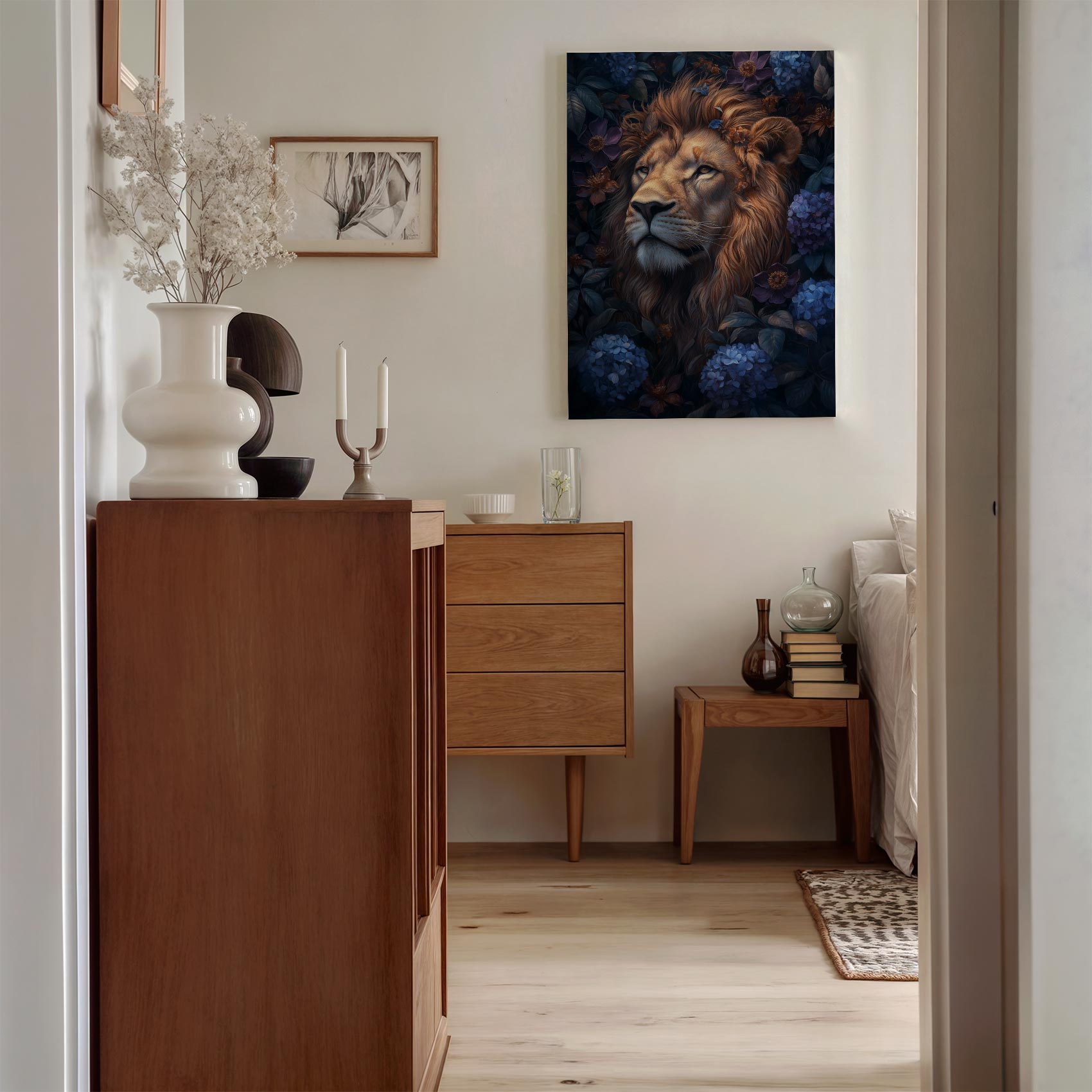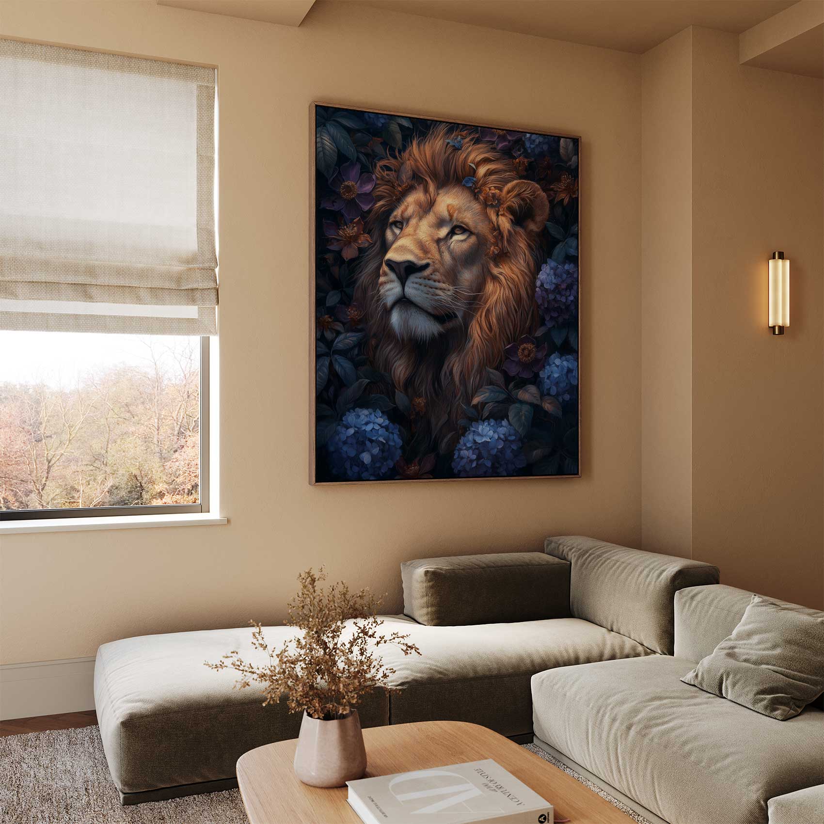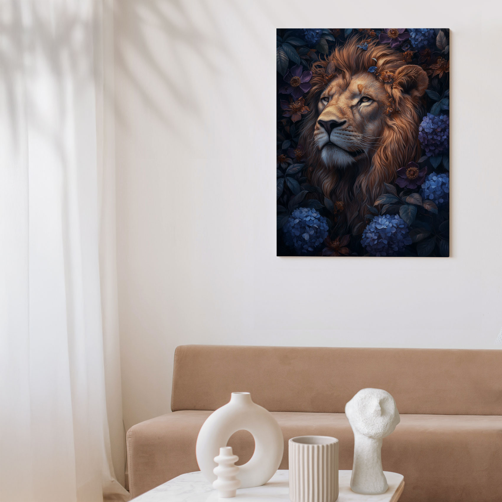 Terug naar collectie / Schilderijen / Bloemen Schilderij / Majestueuze leeuw in bloemenpracht