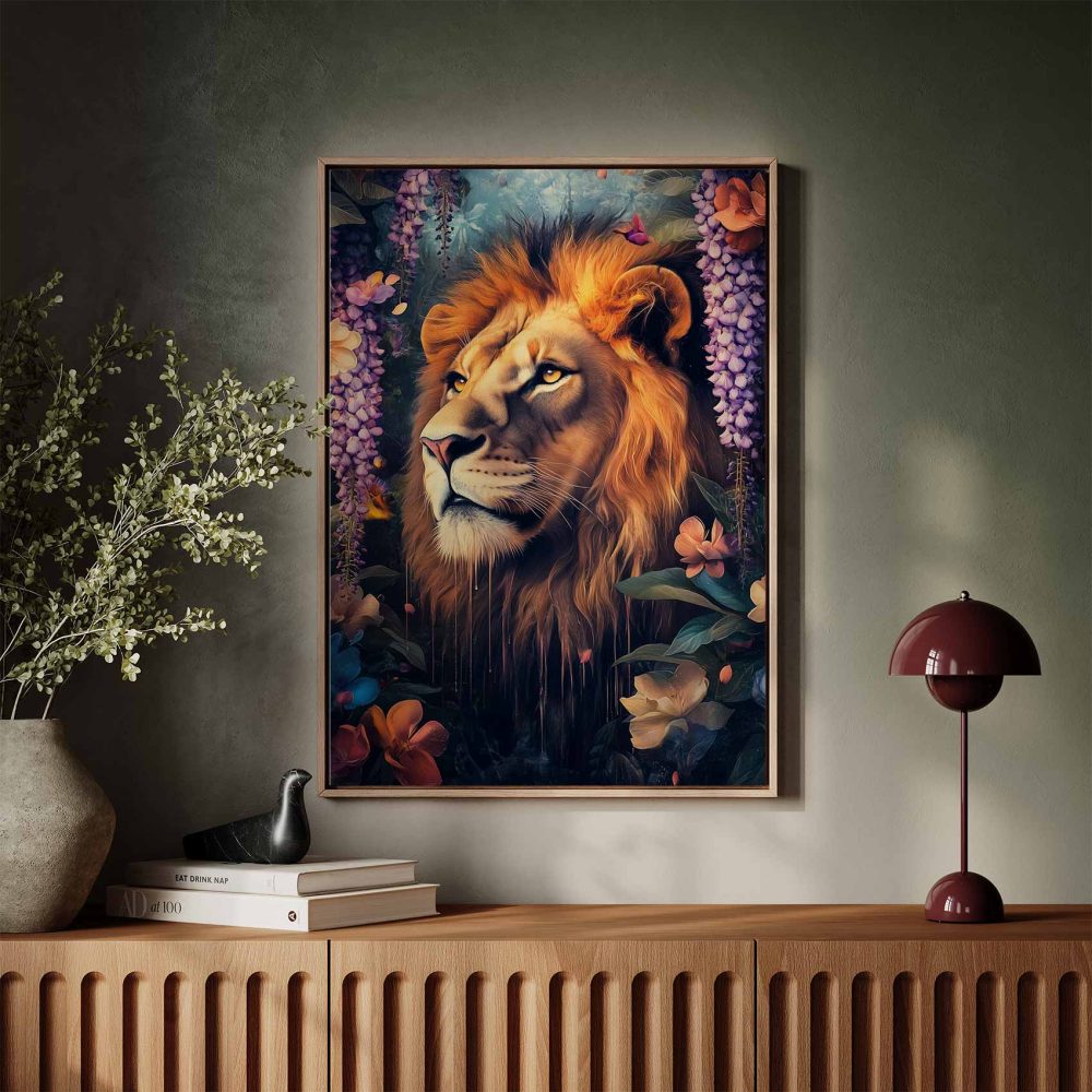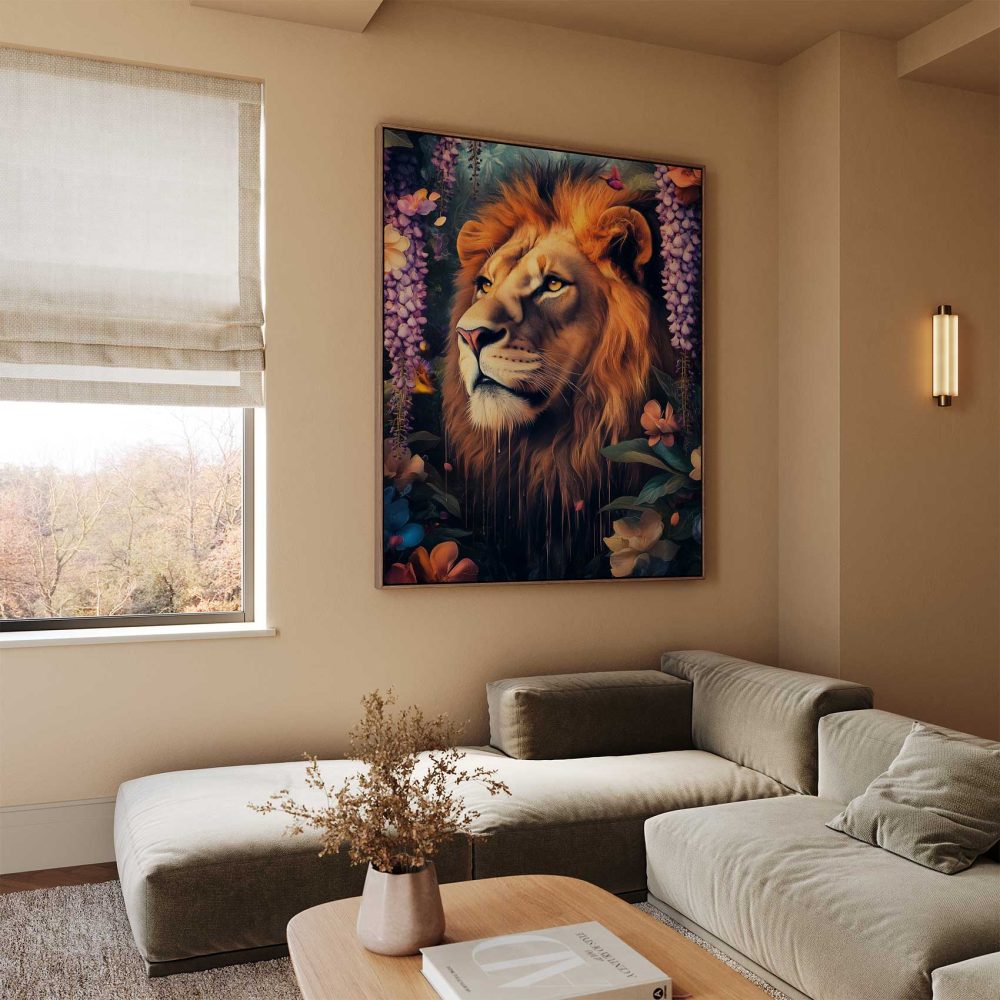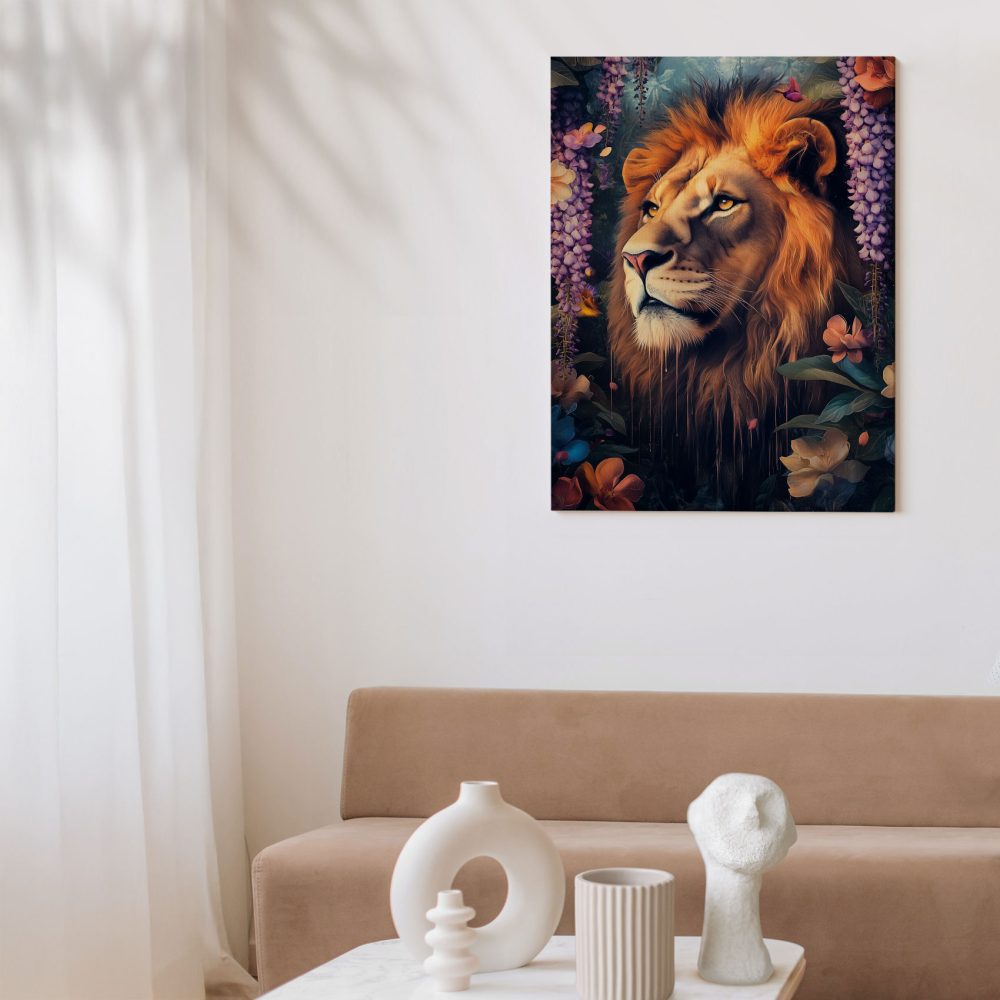 Terug naar collectie / Schilderijen / Bloemen Schilderij / Majestueuze leeuw in bloementuin
