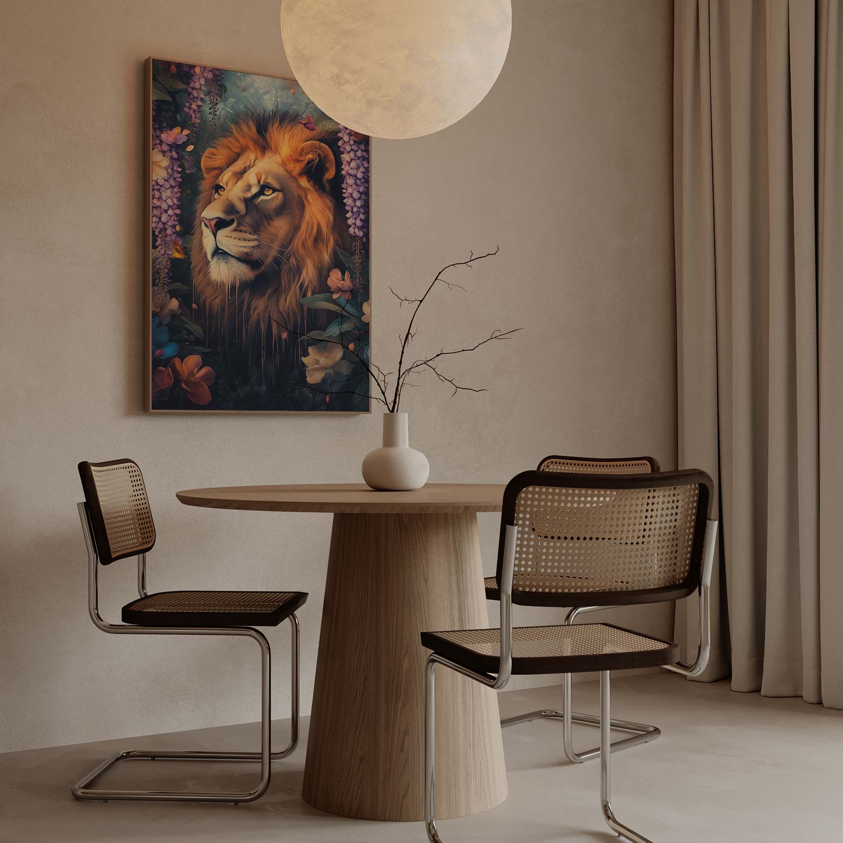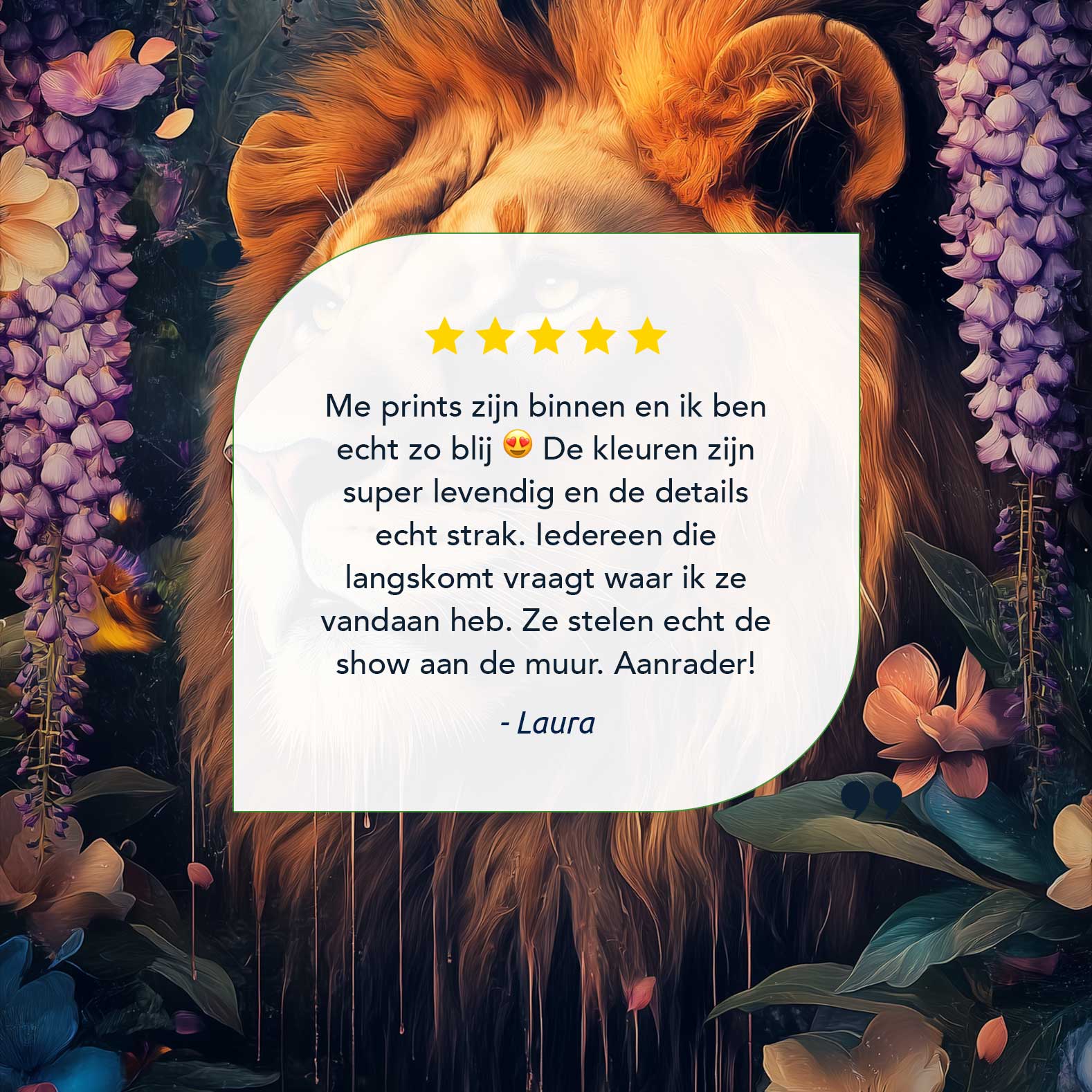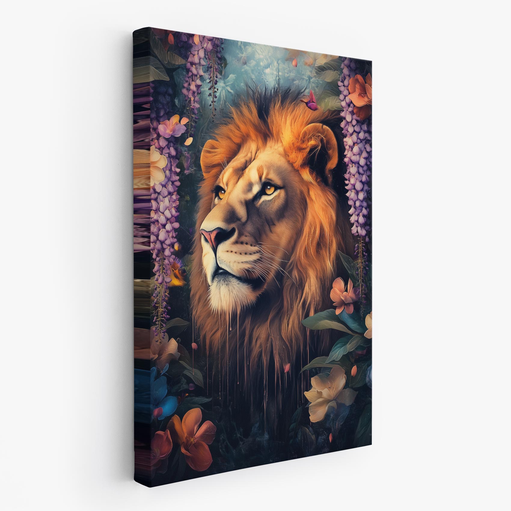 Terug naar collectie / Schilderijen / Bloemen Schilderij / Majestueuze leeuw in bloementuin
