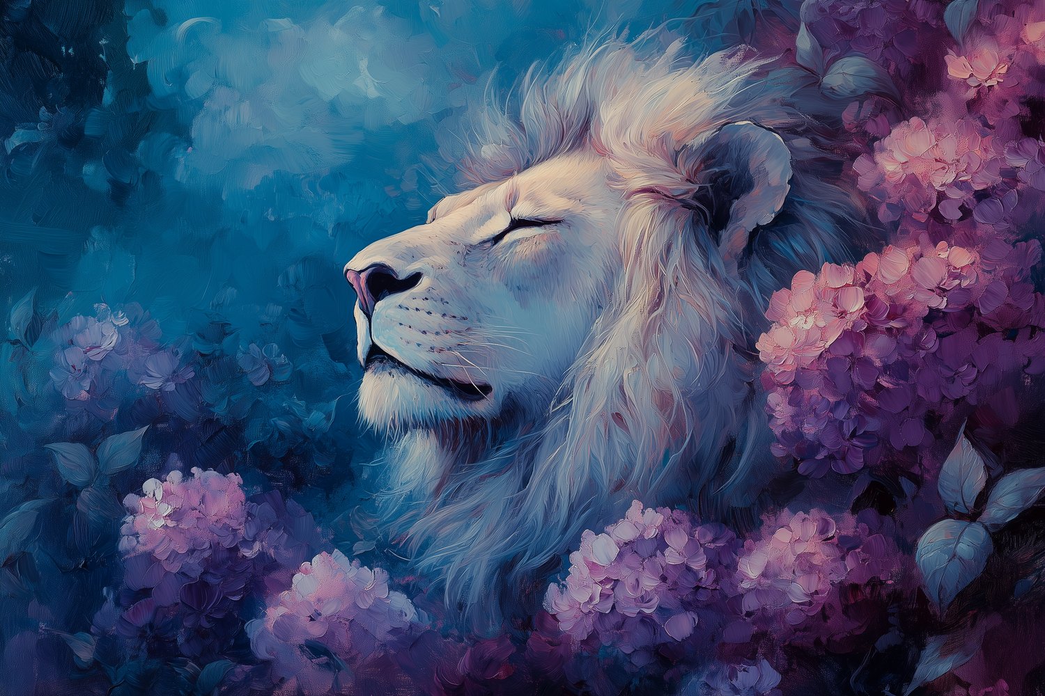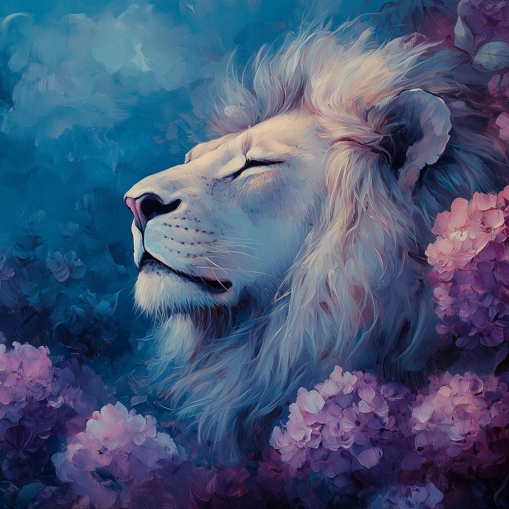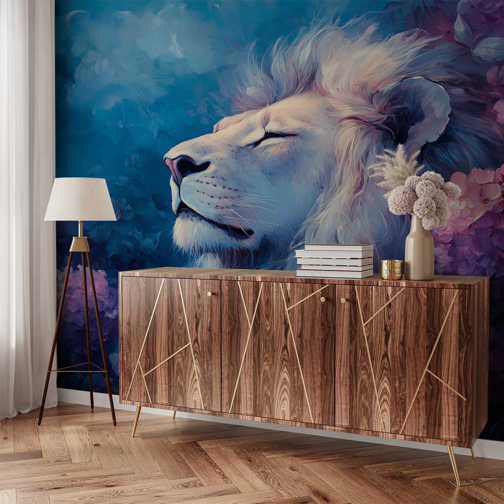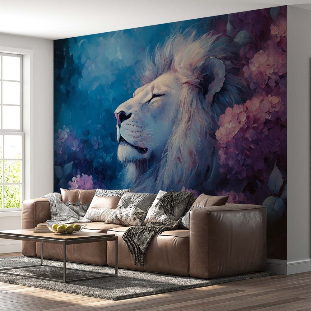 Terug naar collectie / Behang / Majestueuze leeuw in bloementuin behang