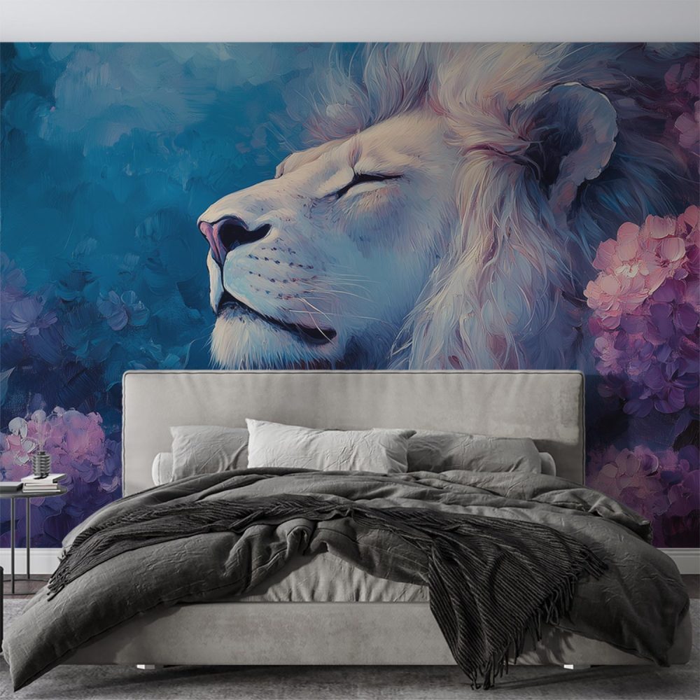 Majestueuze leeuw in bloementuin behang