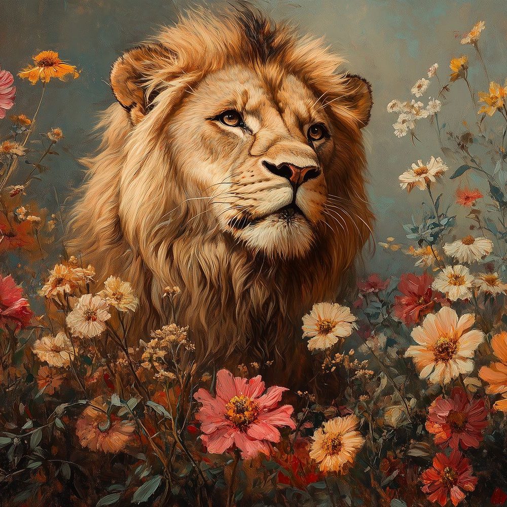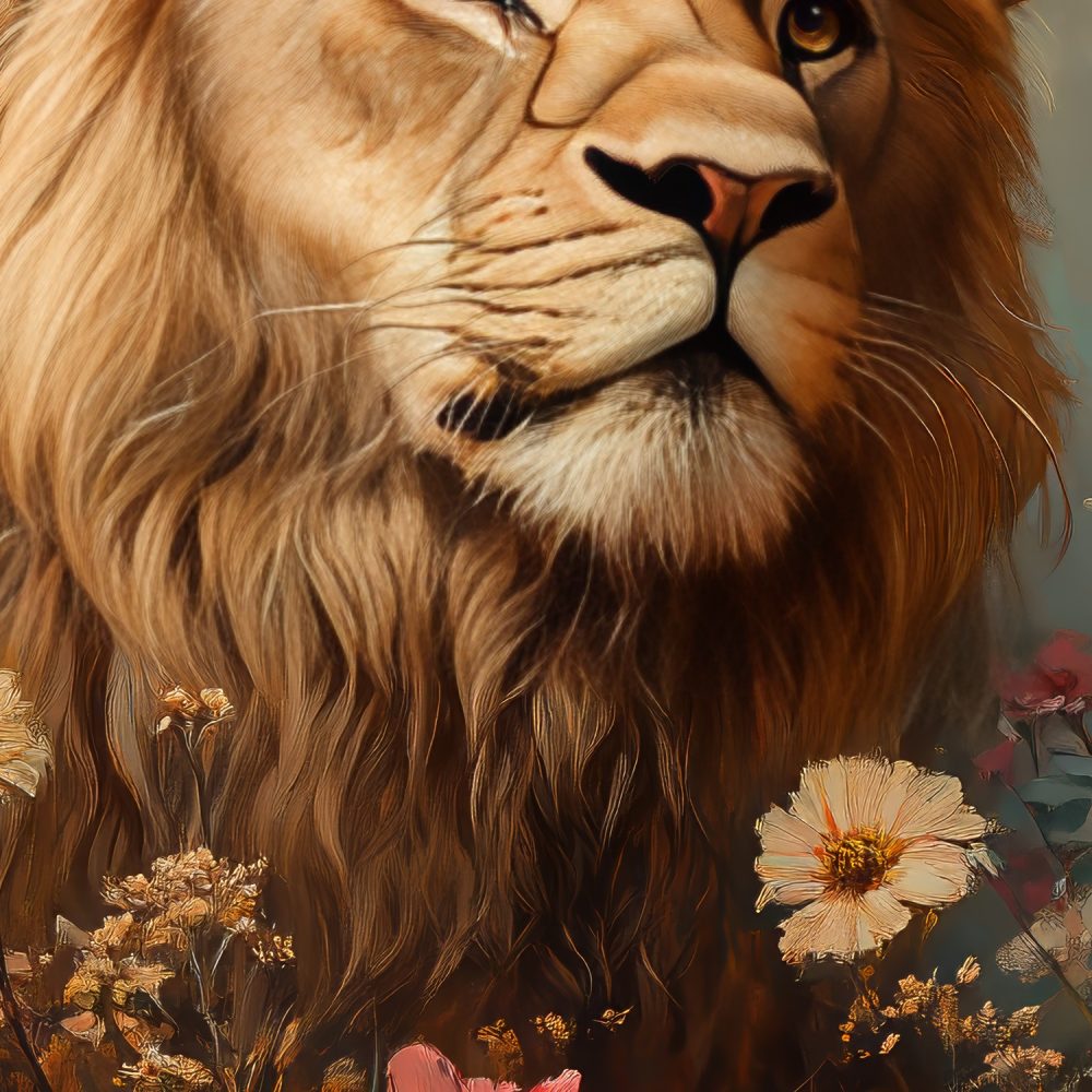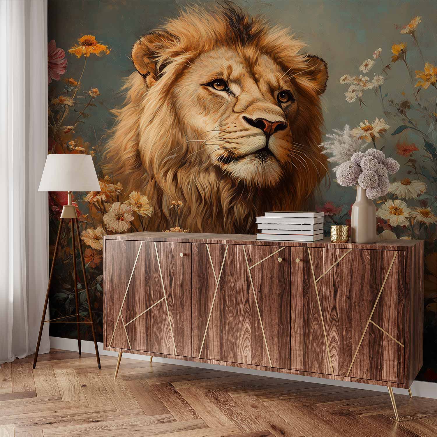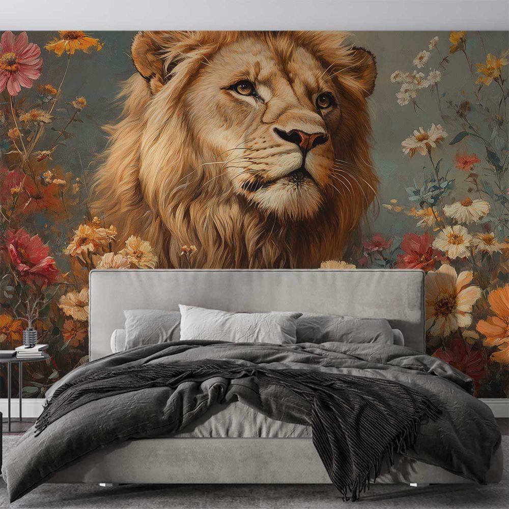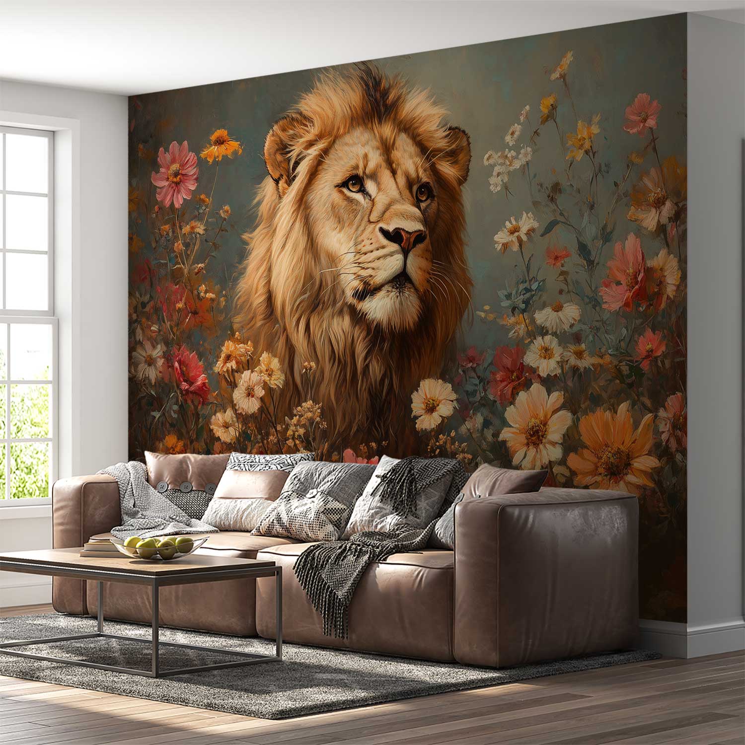 Terug naar collectie / Behang / Majestueuze leeuw in bloemenveld behang