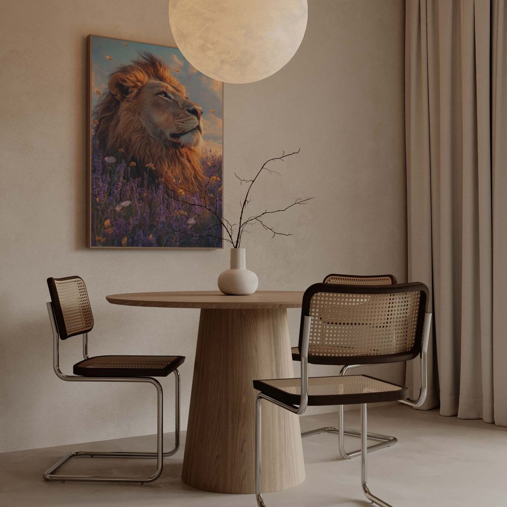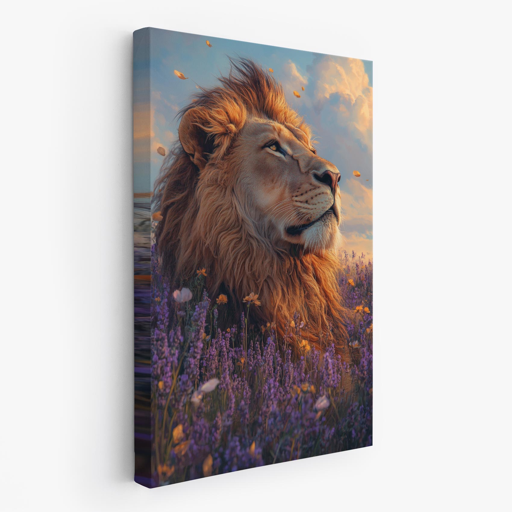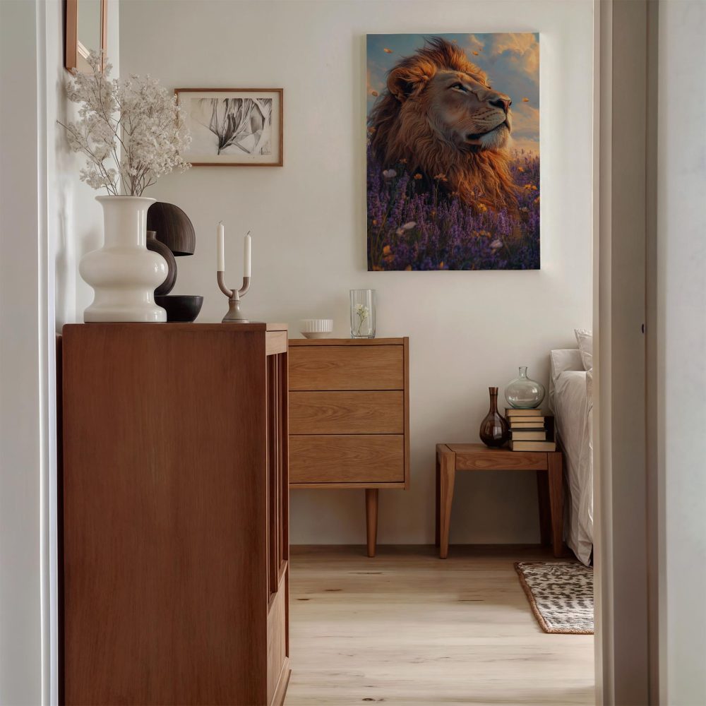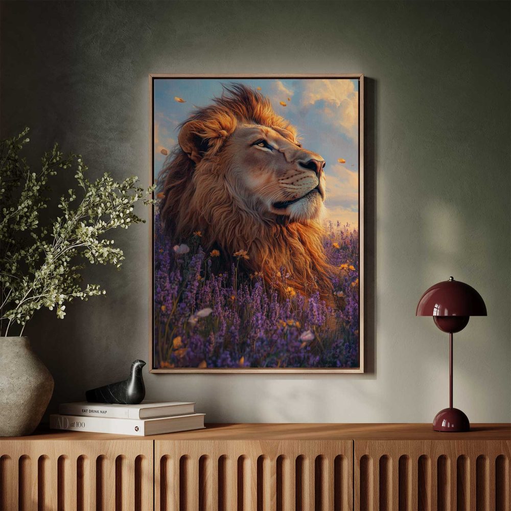 Terug naar collectie / Schilderijen / Bloemen Schilderij / Majestueuze leeuw in purperbloemen