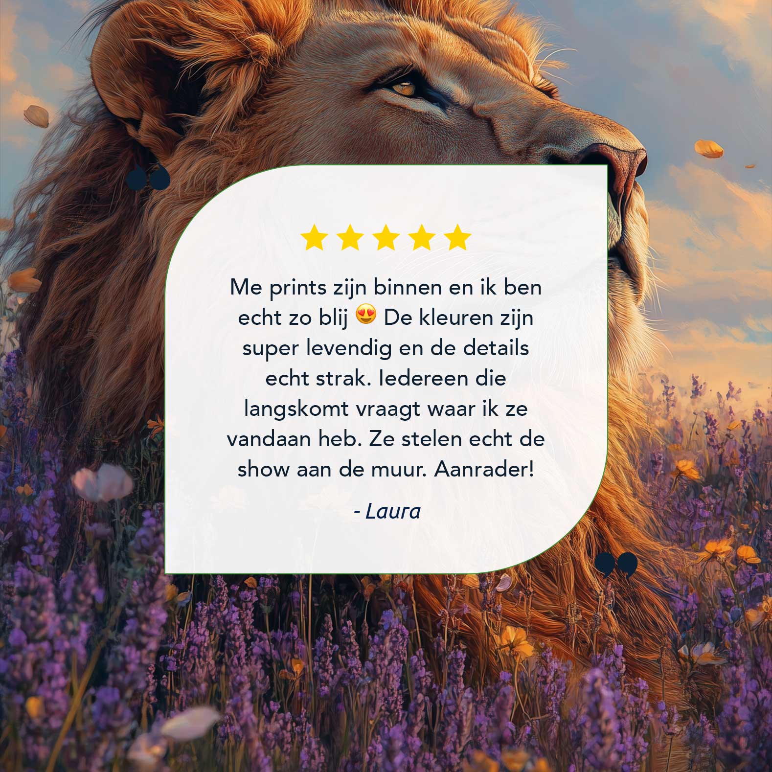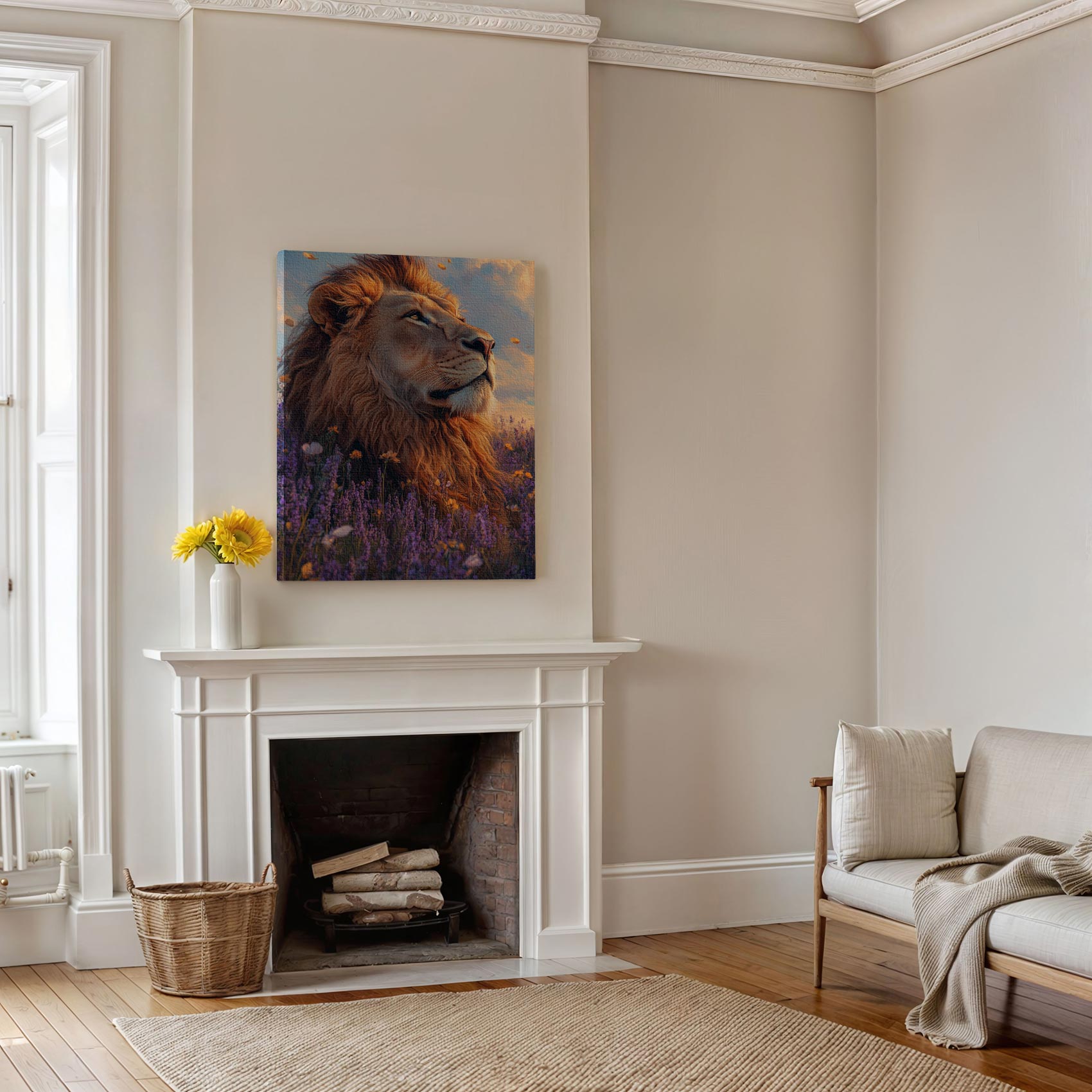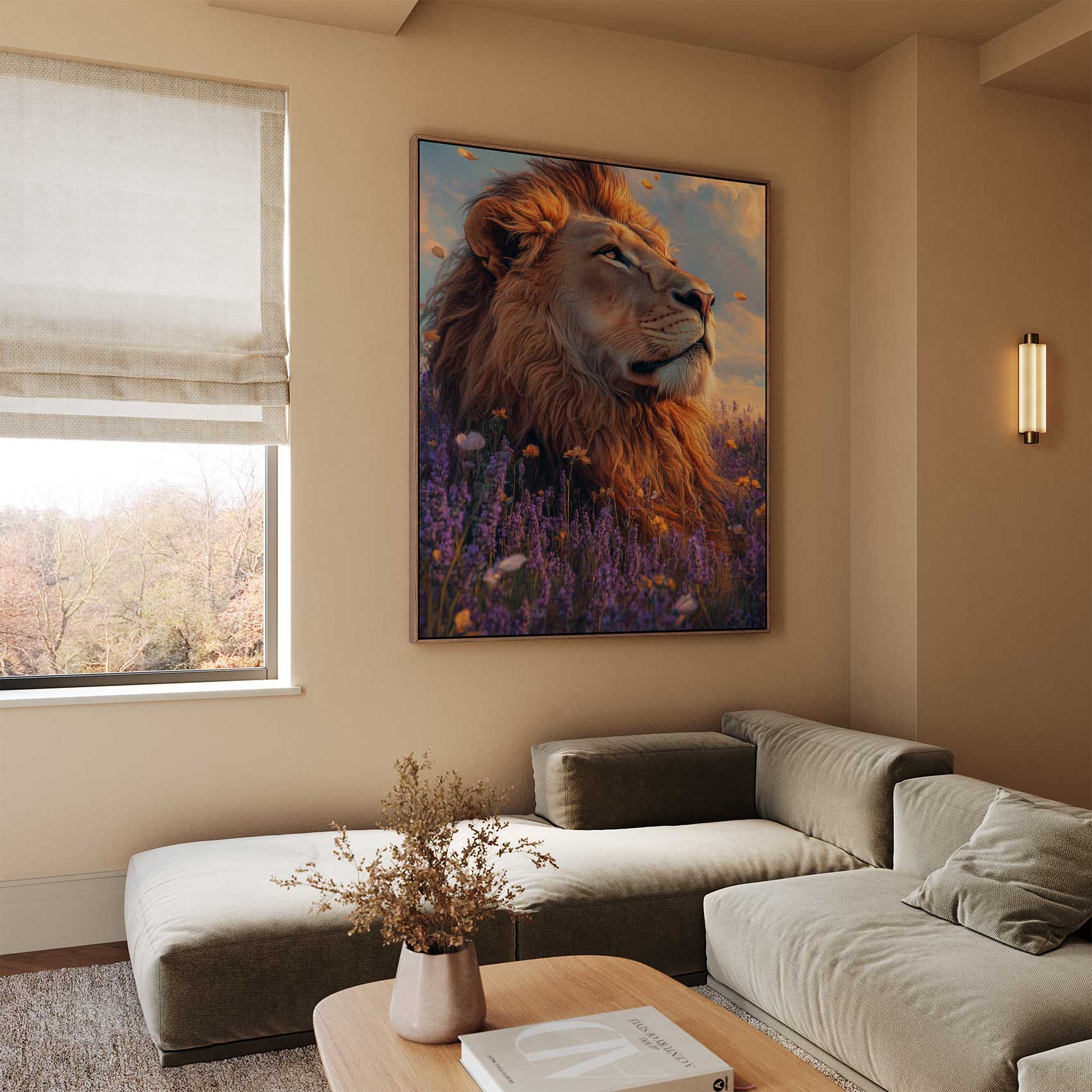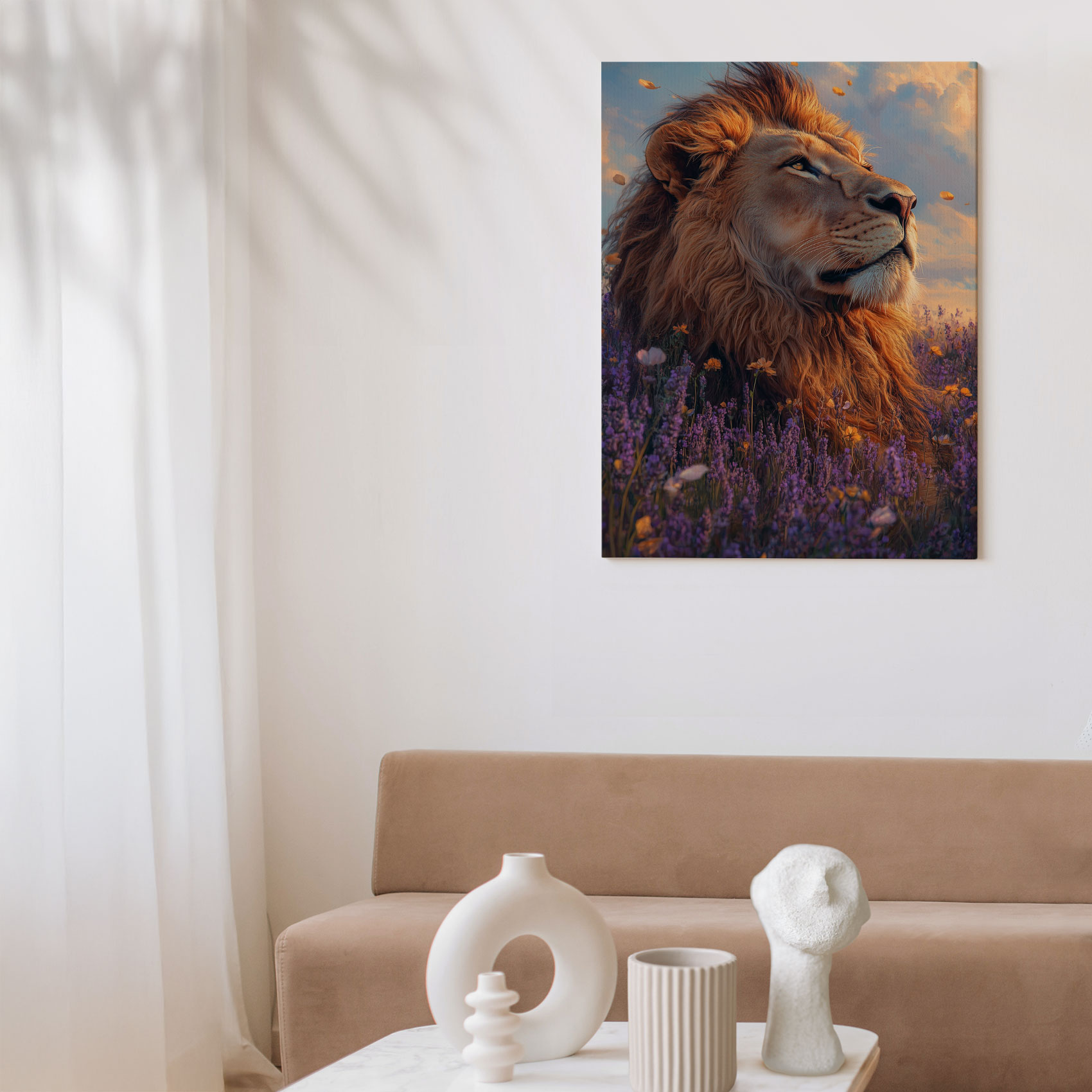 Terug naar collectie / Schilderijen / Bloemen Schilderij / Majestueuze leeuw in purperbloemen