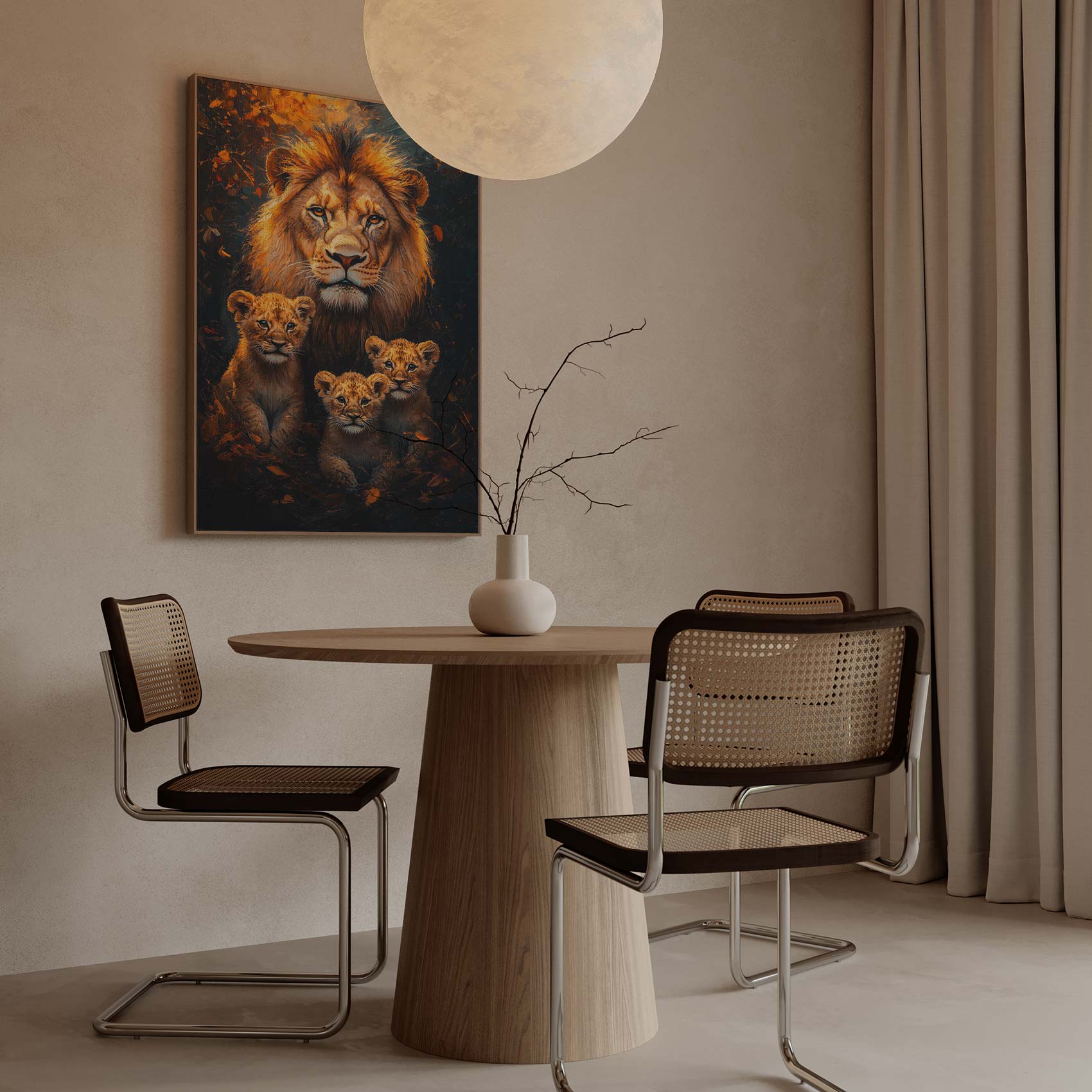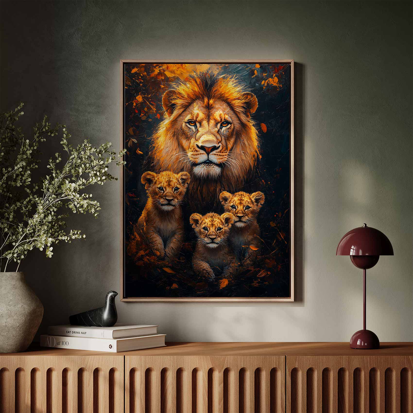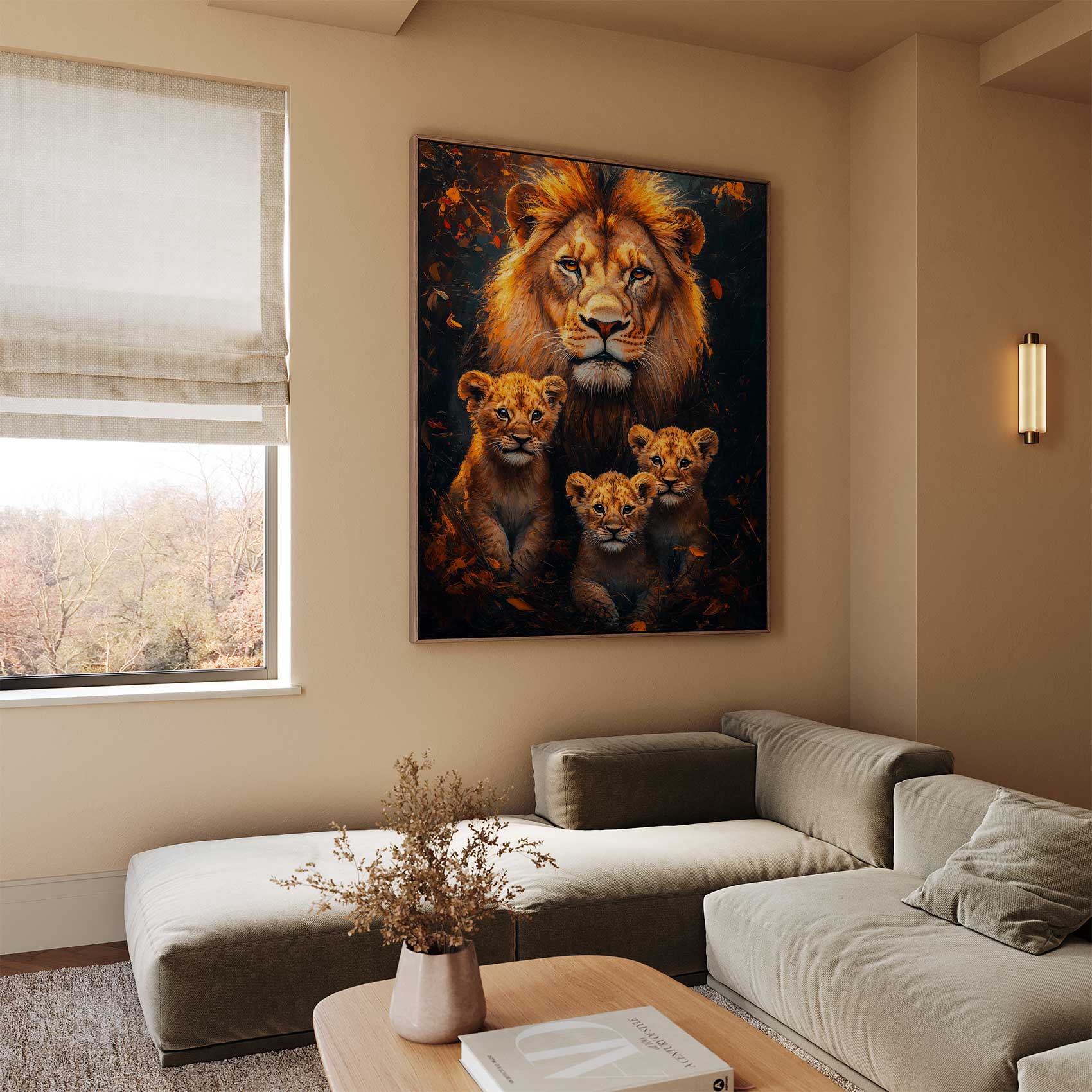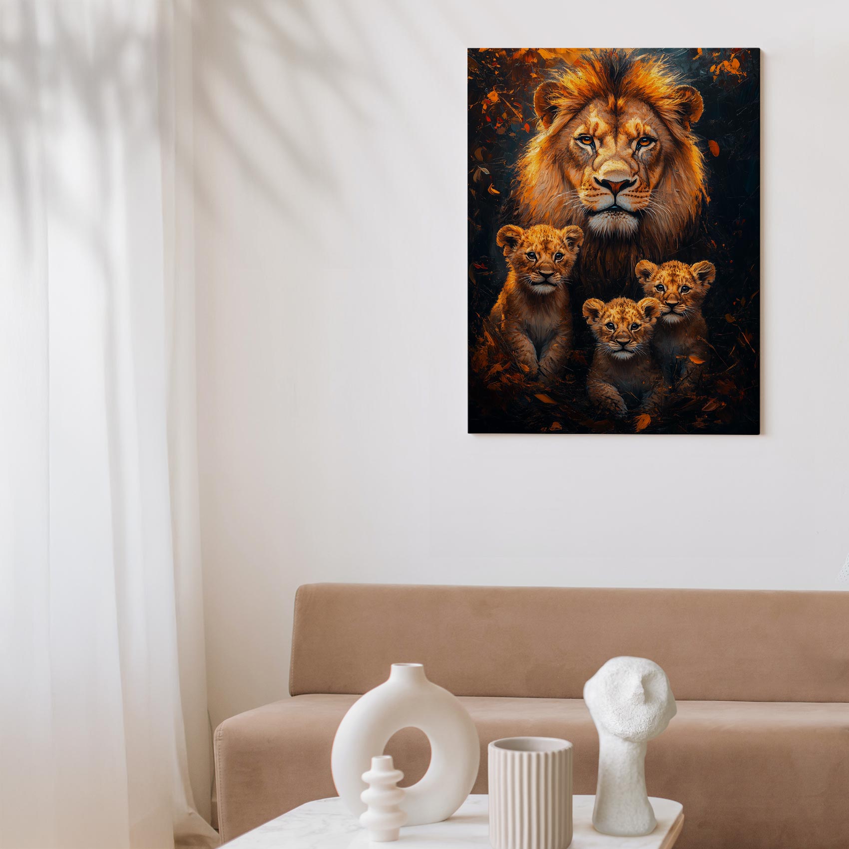 Terug naar collectie / Schilderijen / Bossen Schilderij / Majestueuze leeuw met welpen