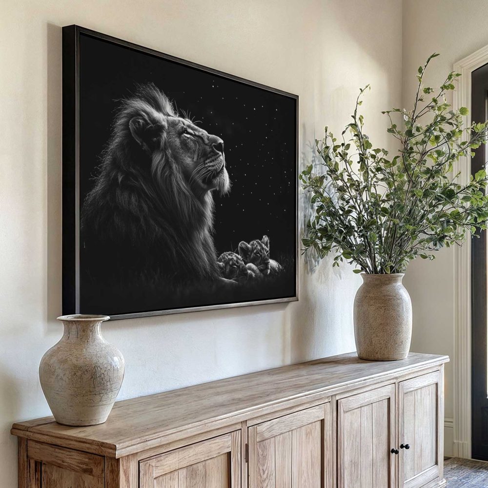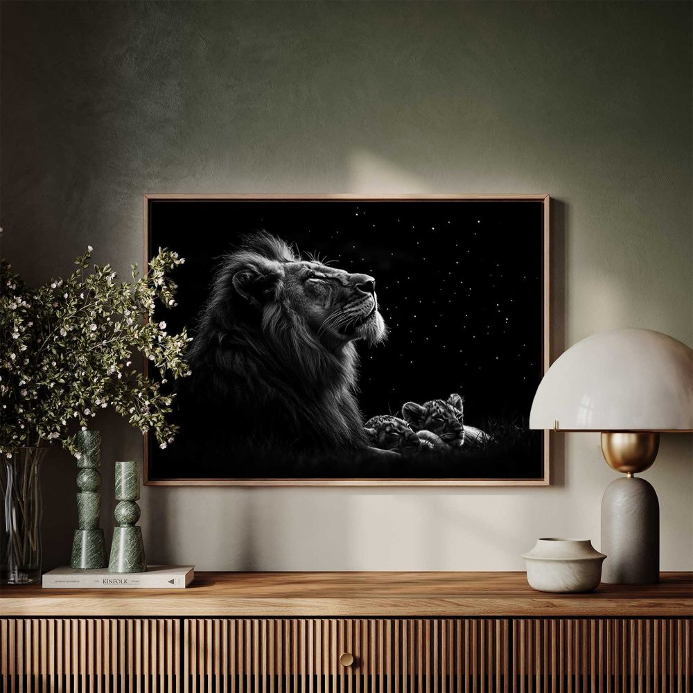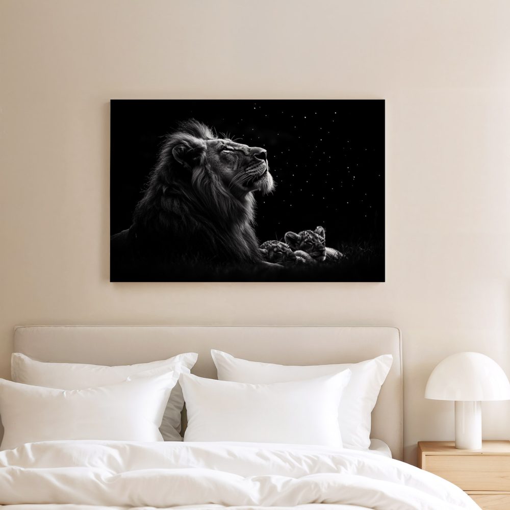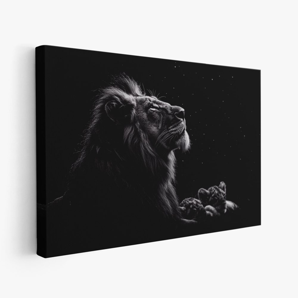 Terug naar collectie / Schilderijen / Dieren Schilderij / Majestueuze leeuw onder sterrenhemel