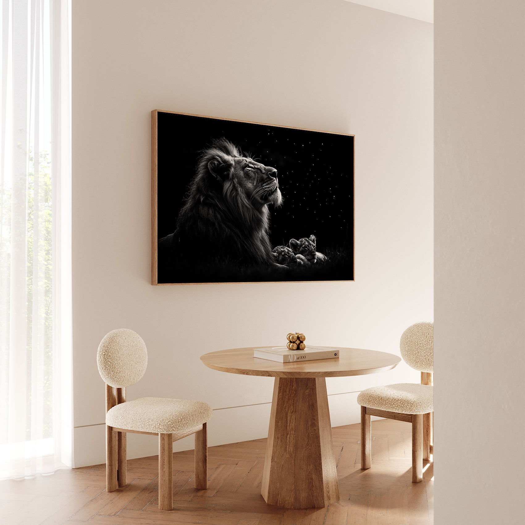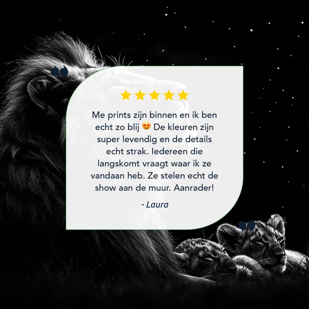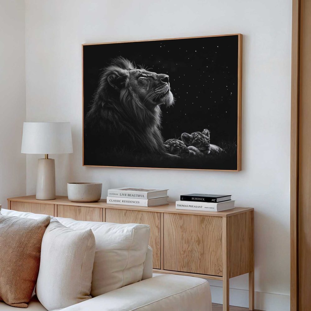 Terug naar collectie / Schilderijen / Dieren Schilderij / Majestueuze leeuw onder sterrenhemel