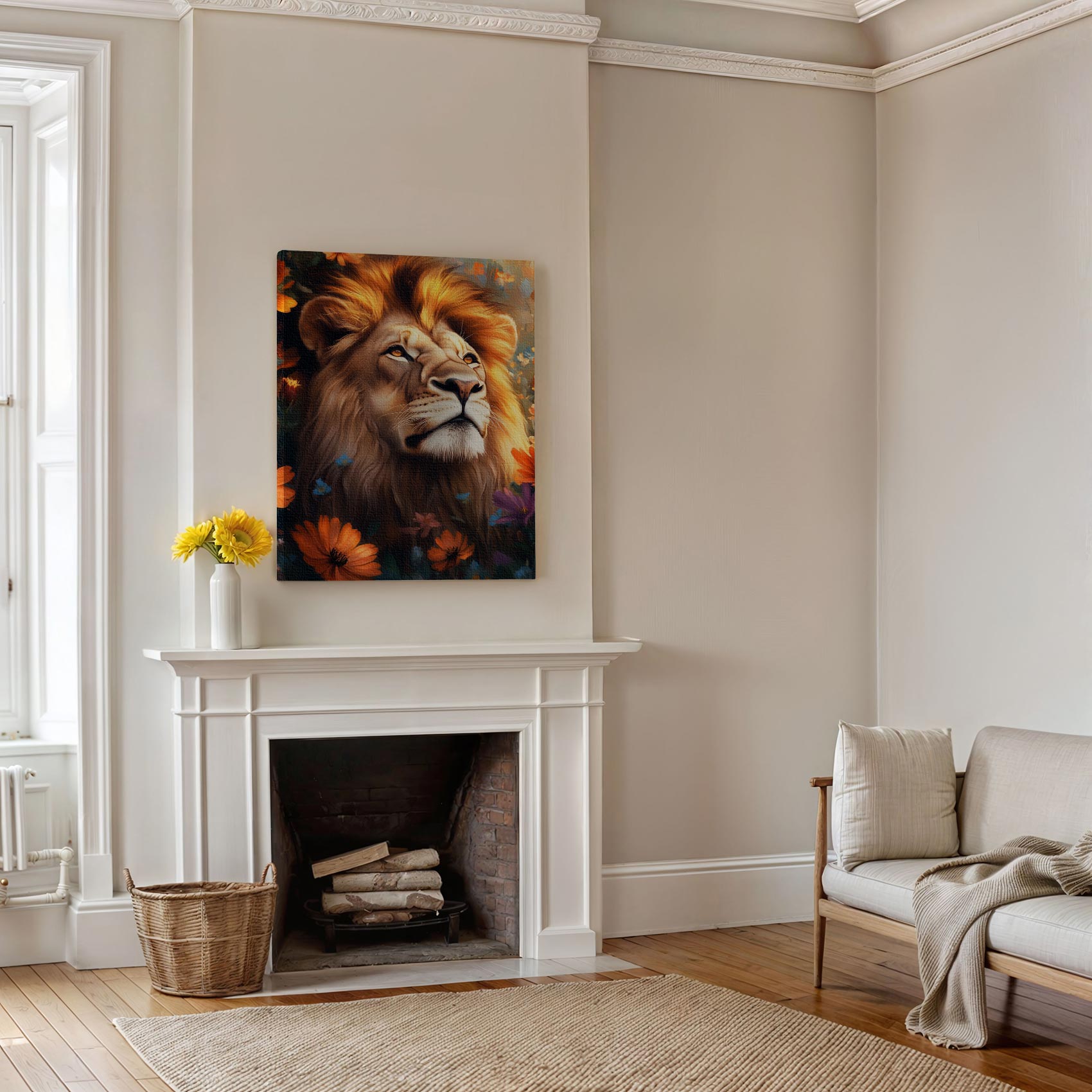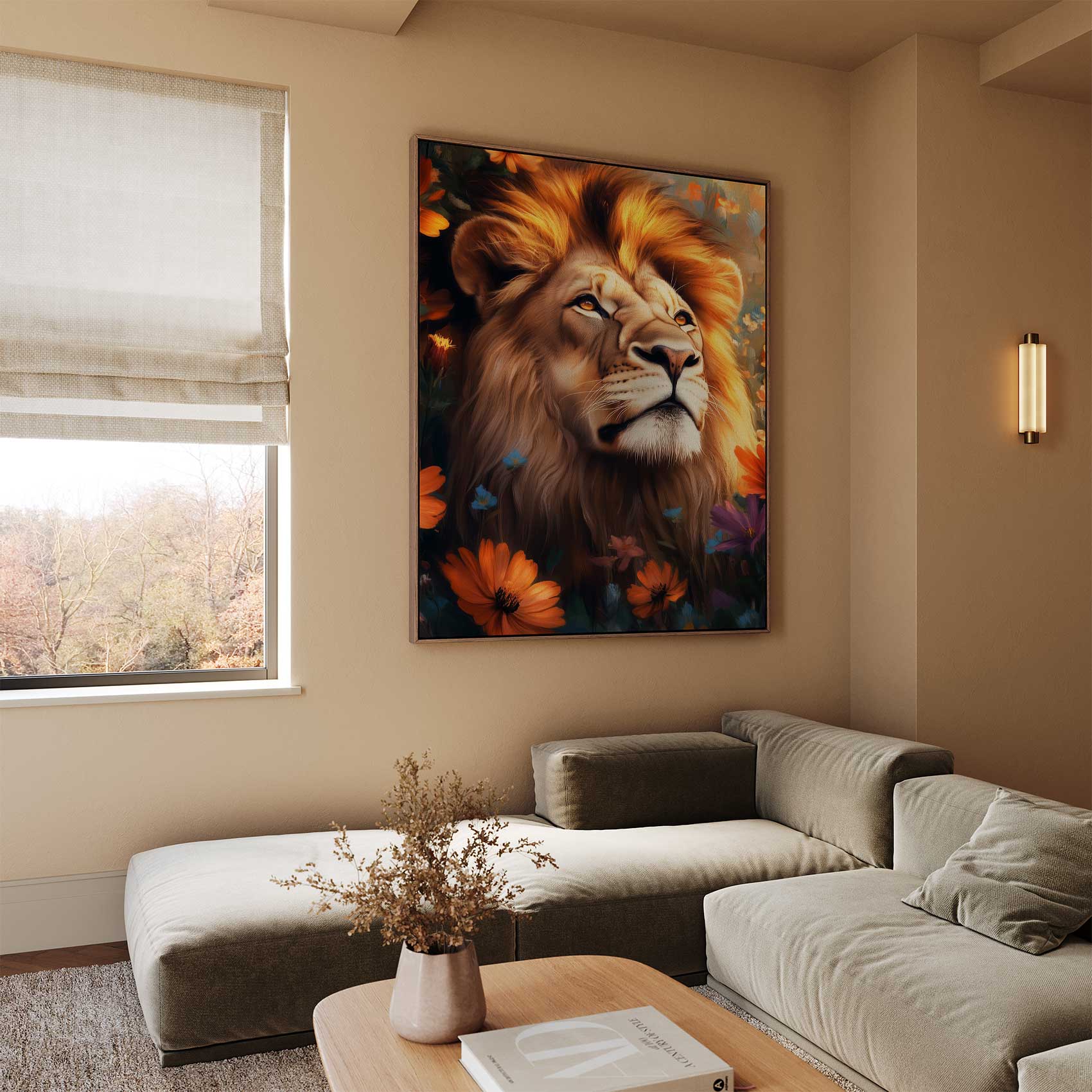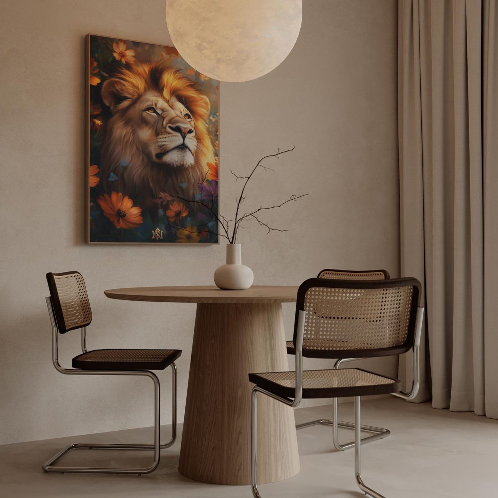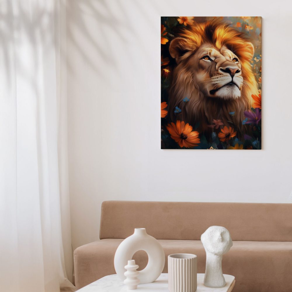 Terug naar collectie / Schilderijen / Bloemen Schilderij / Majestueuze leeuw tussen bloemen