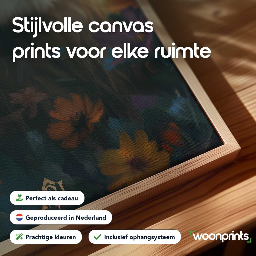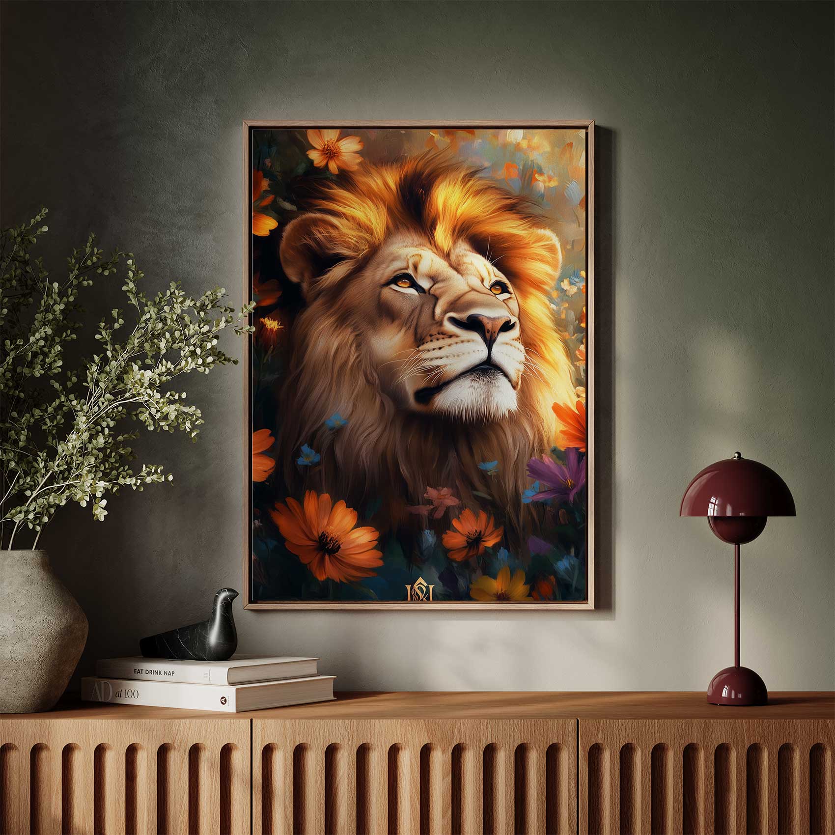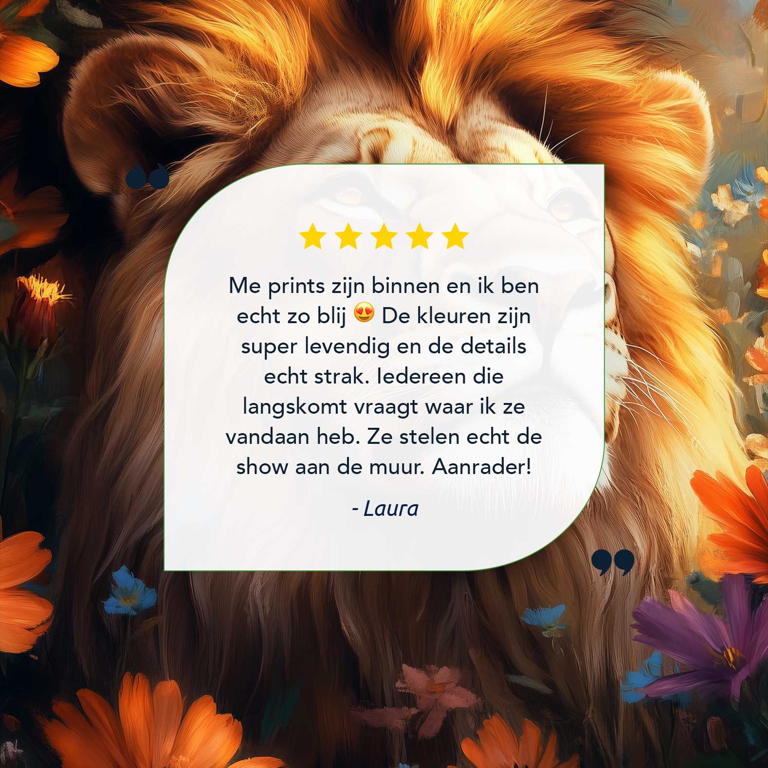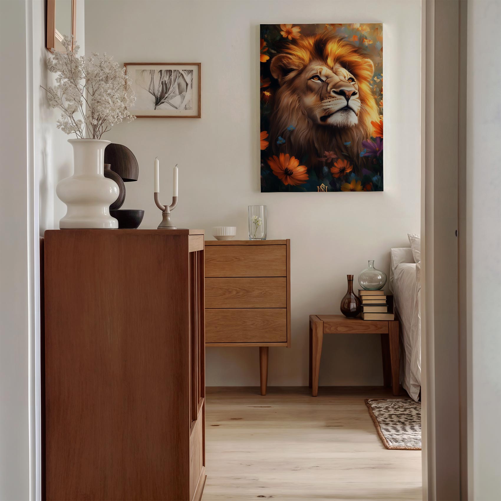 Terug naar collectie / Schilderijen / Bloemen Schilderij / Majestueuze leeuw tussen bloemen