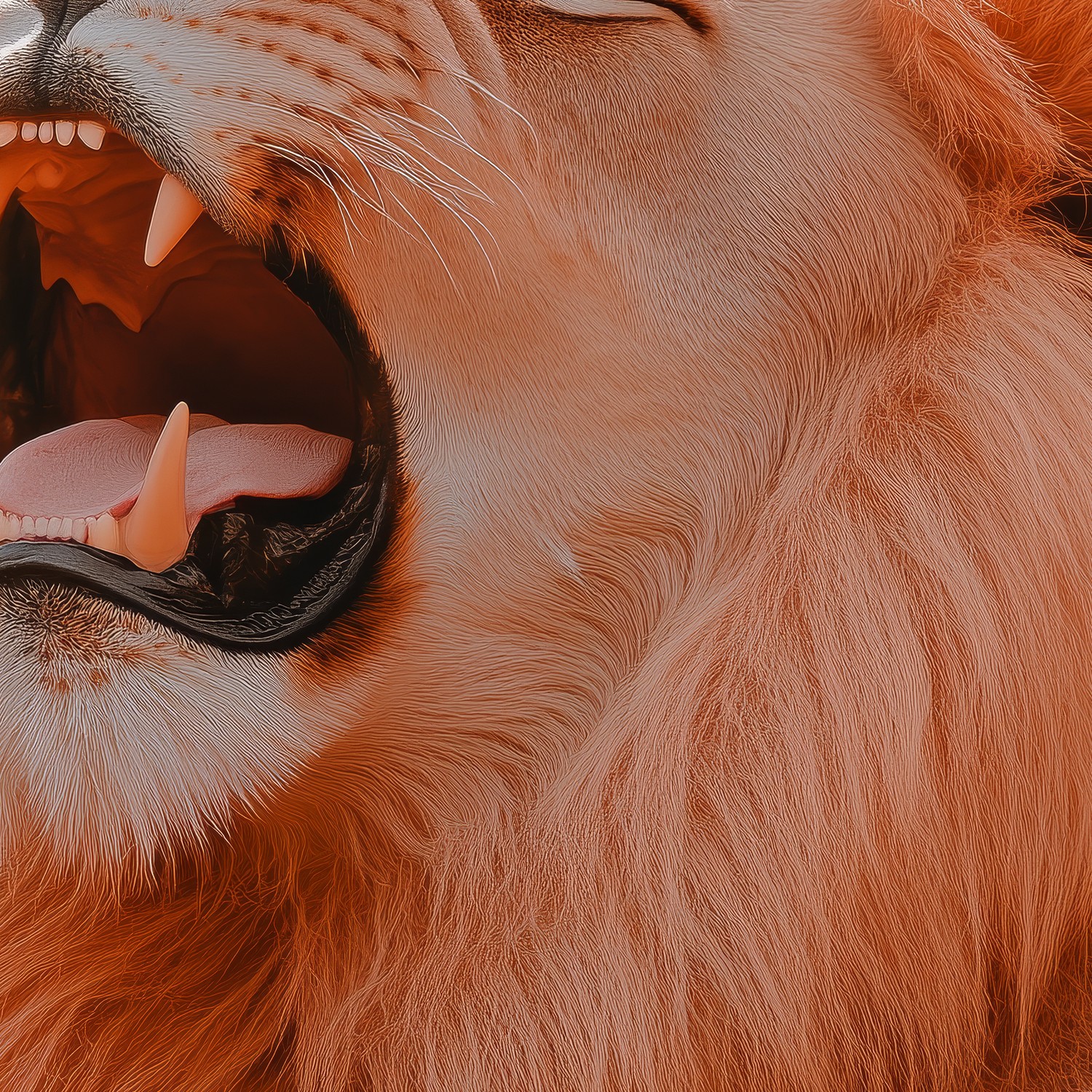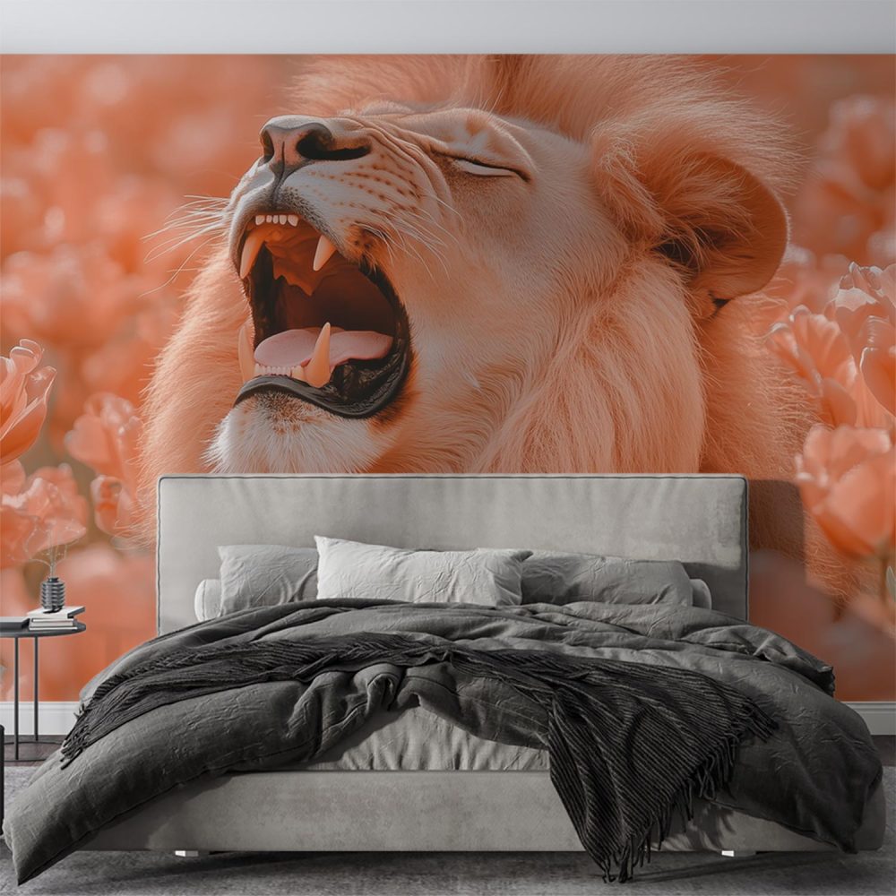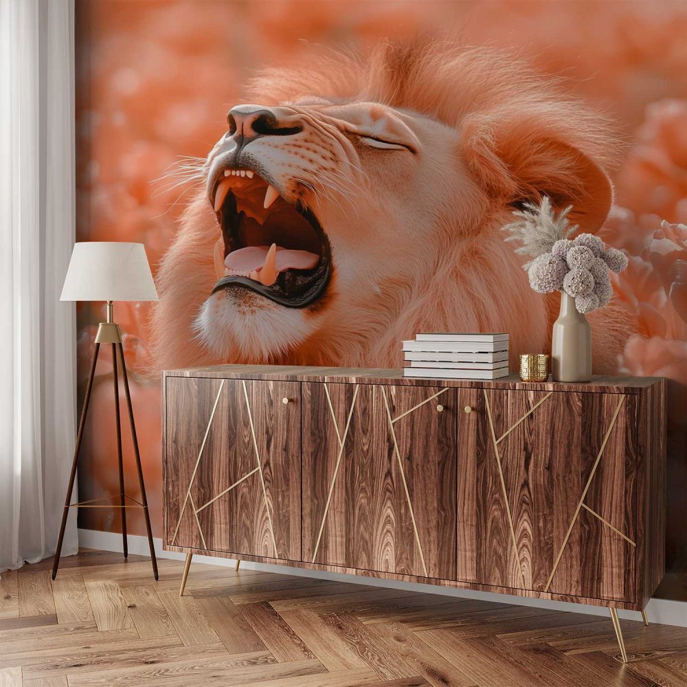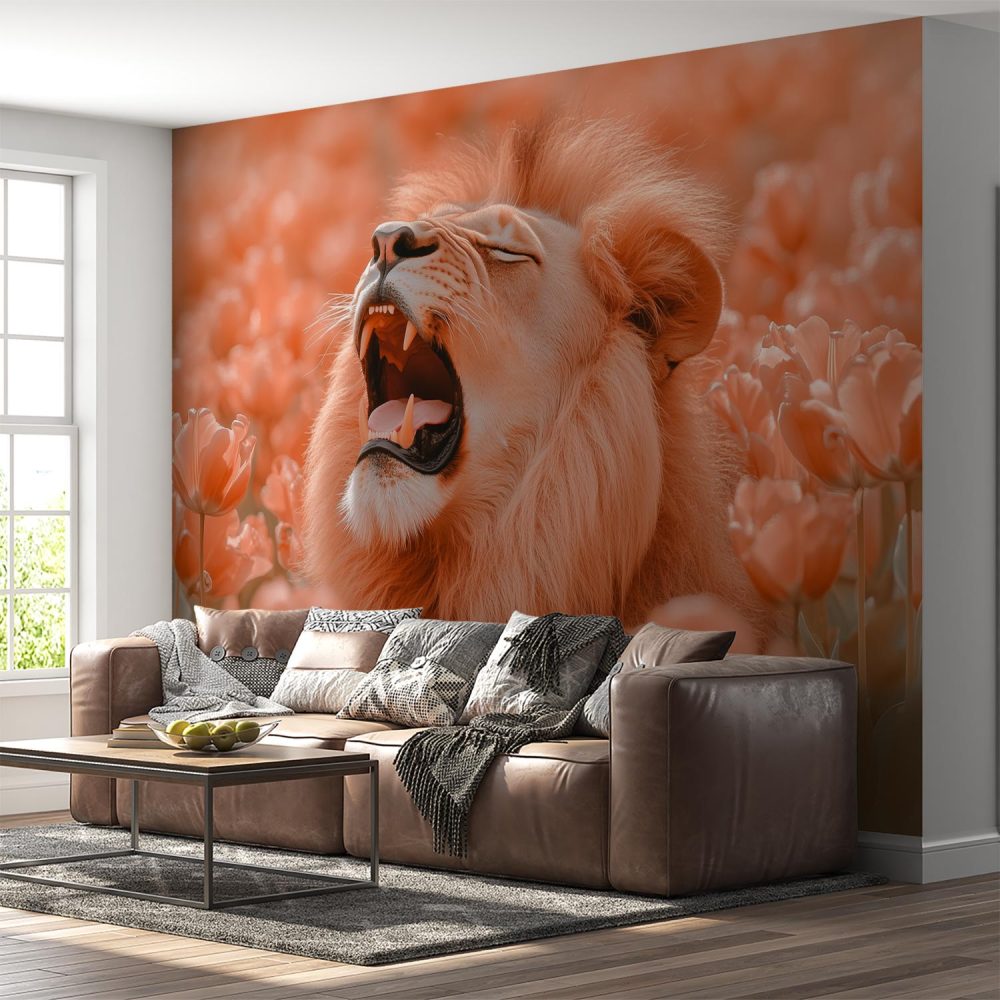 Terug naar collectie / Behang / Majestueuze leeuw tussen oranje bloemen behang