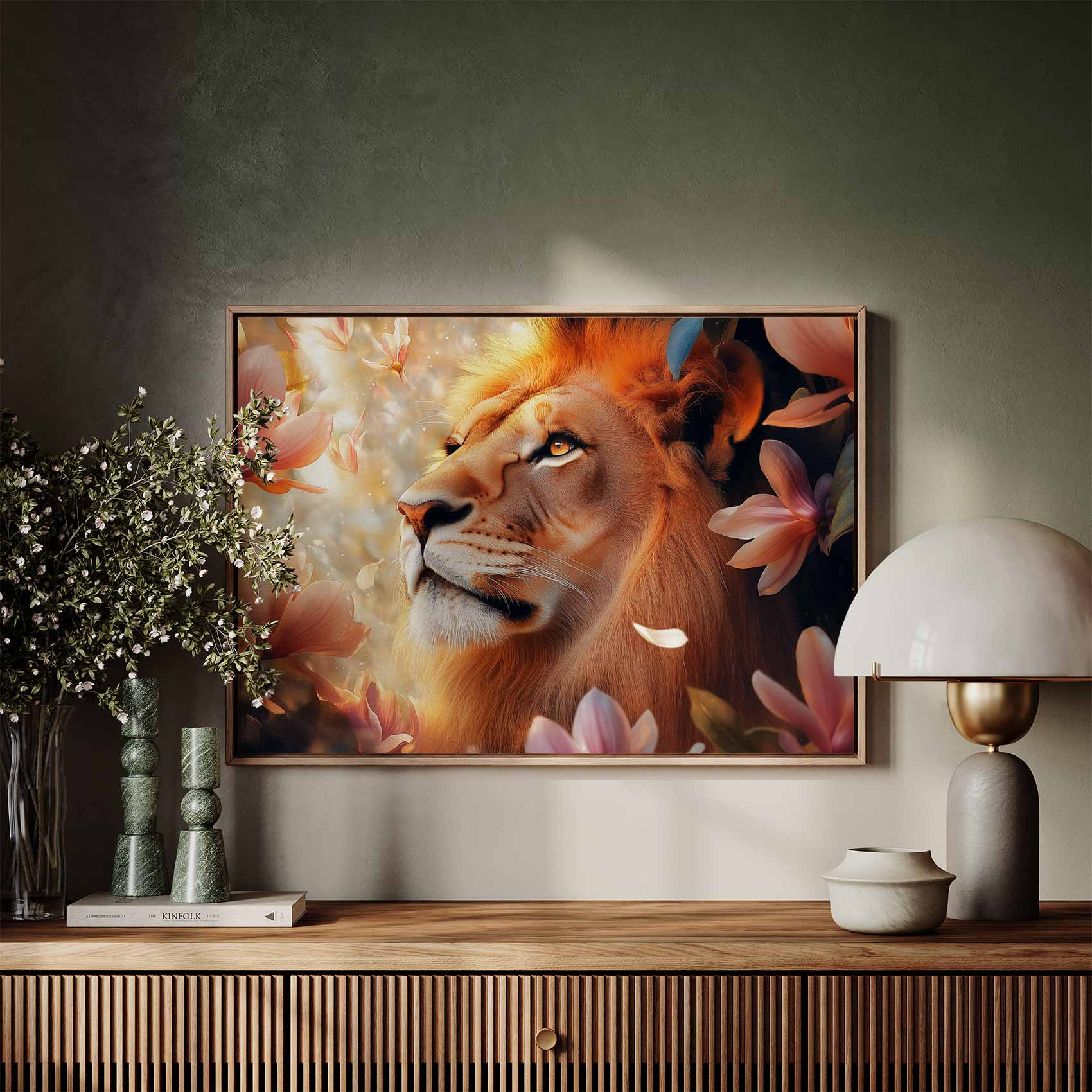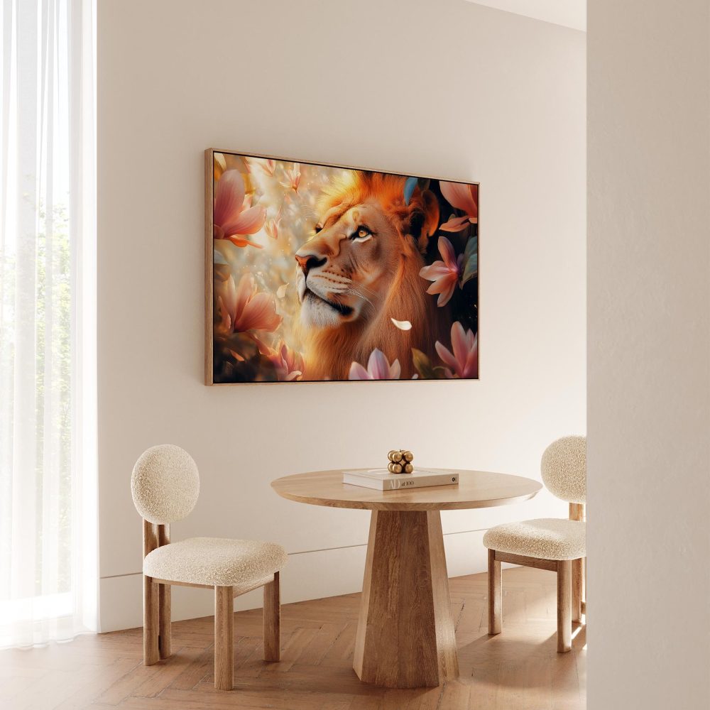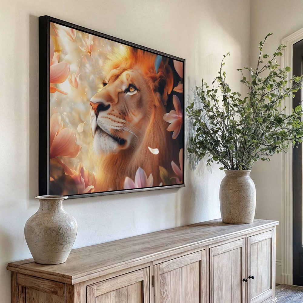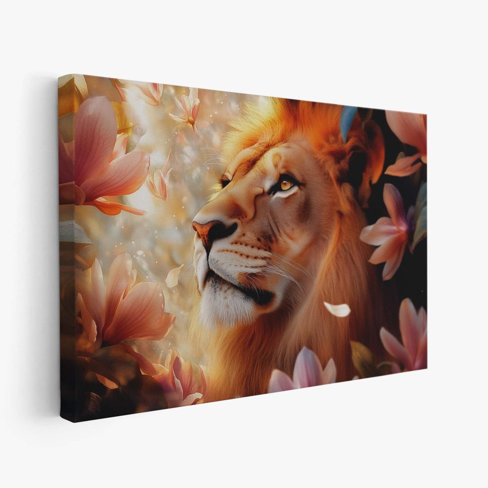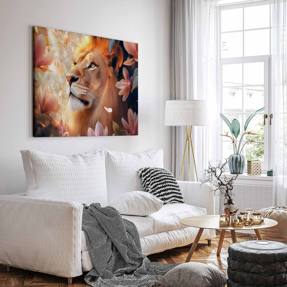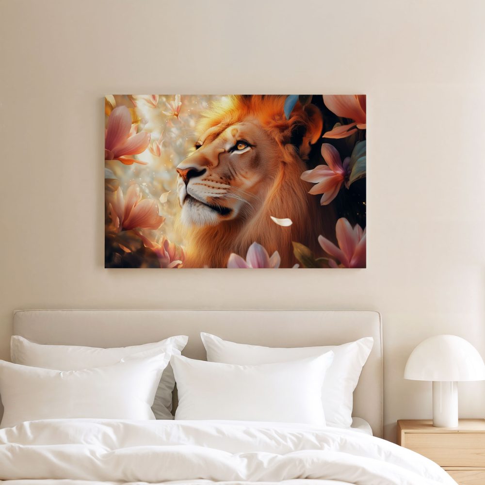 Terug naar collectie / Schilderijen / Bloemen Schilderij / Majestueuze leeuw tussen roze bloemen