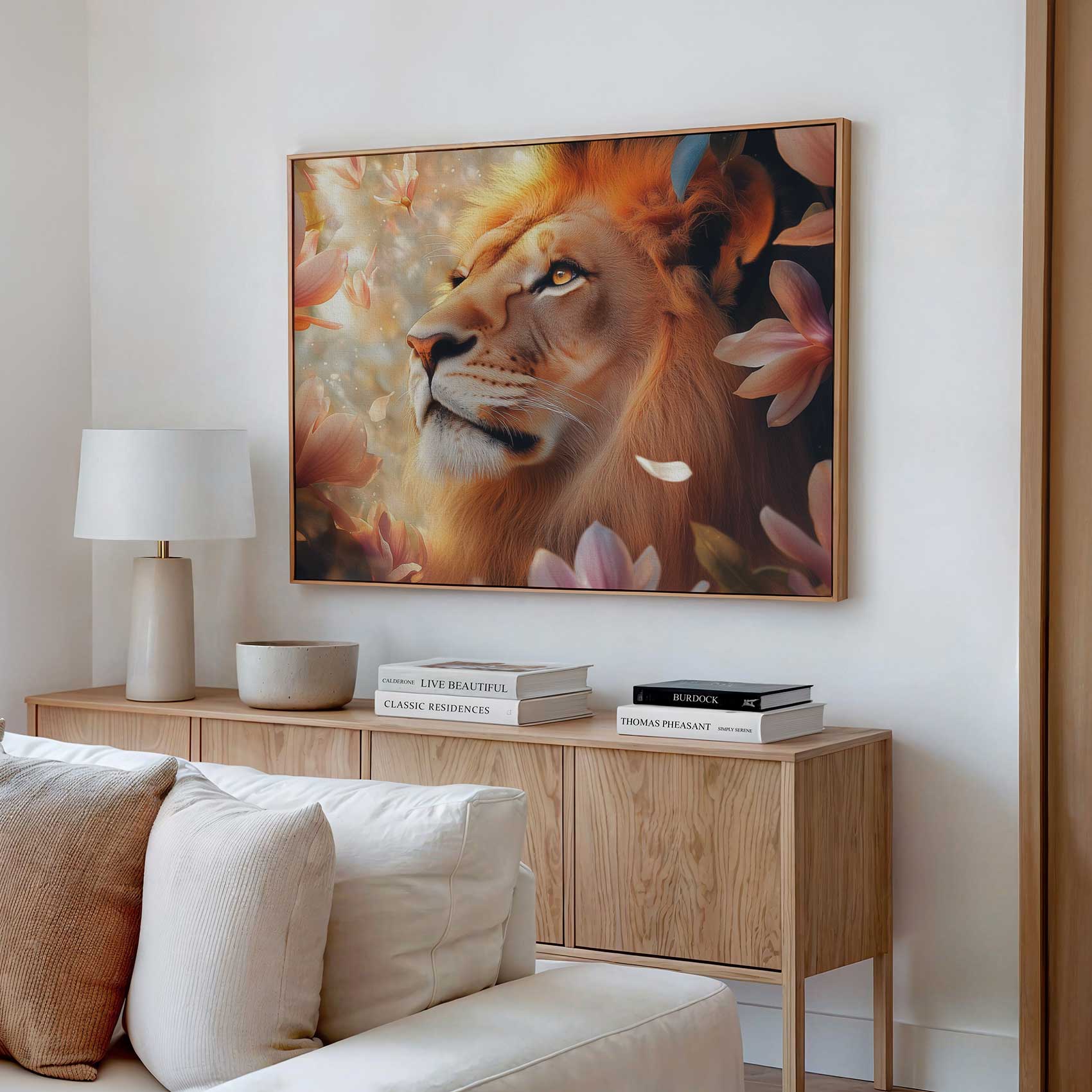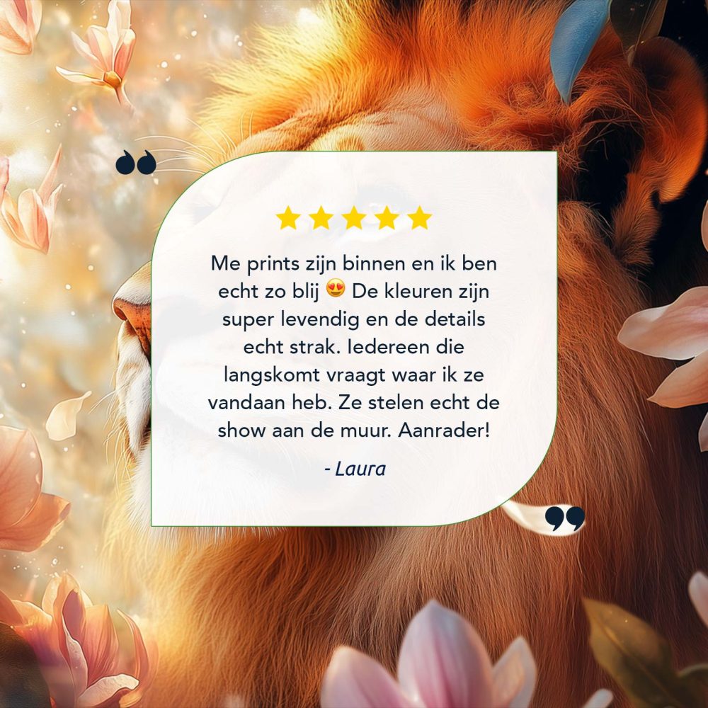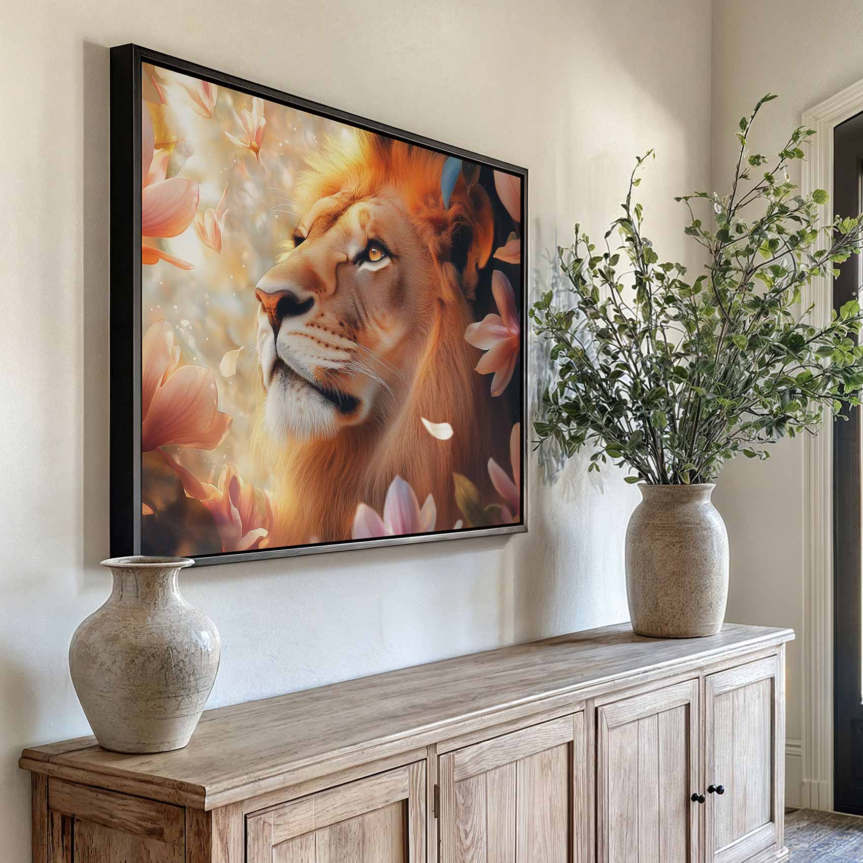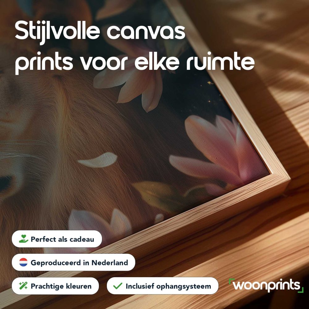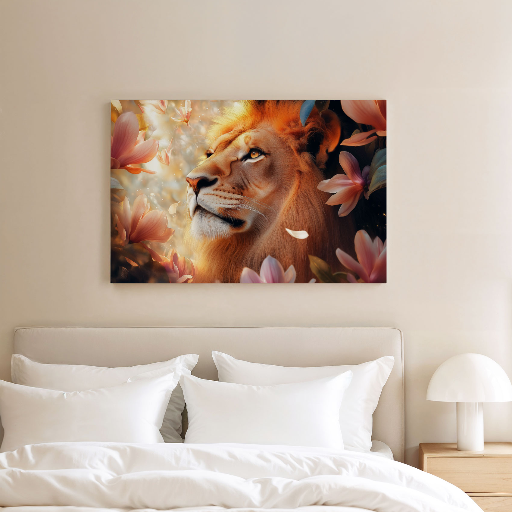 Terug naar collectie / Schilderijen / Bloemen Schilderij / Majestueuze leeuw tussen roze bloemen