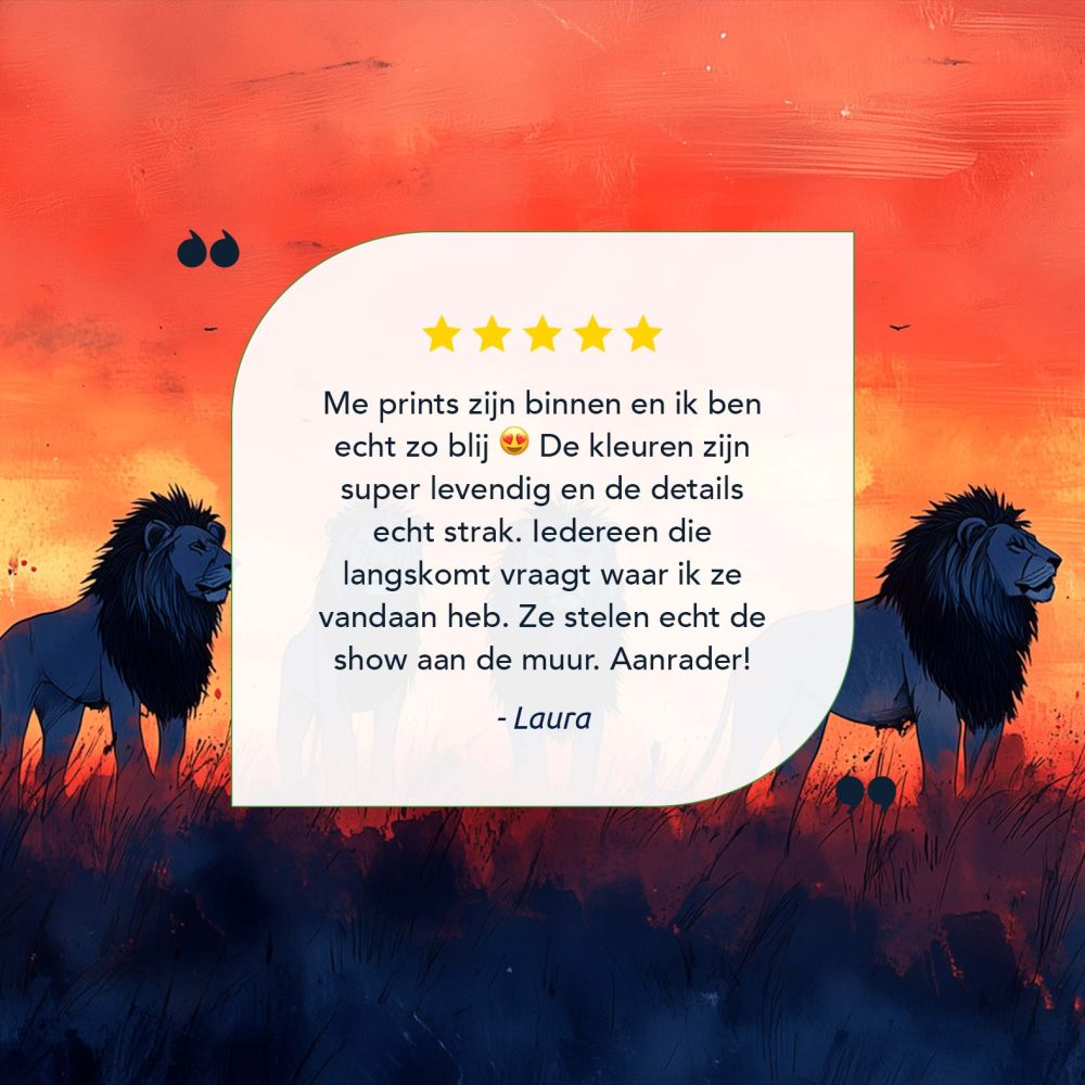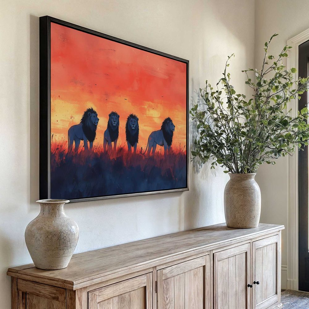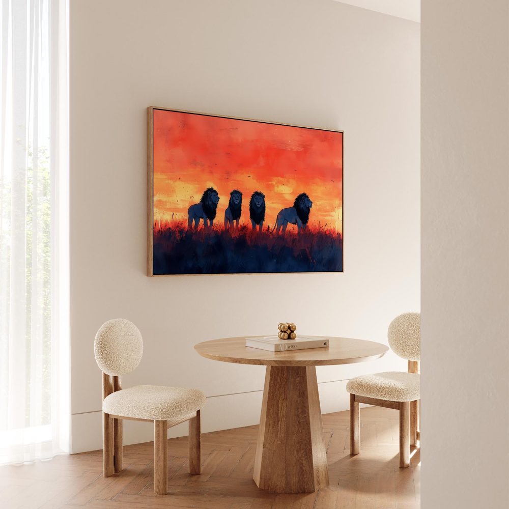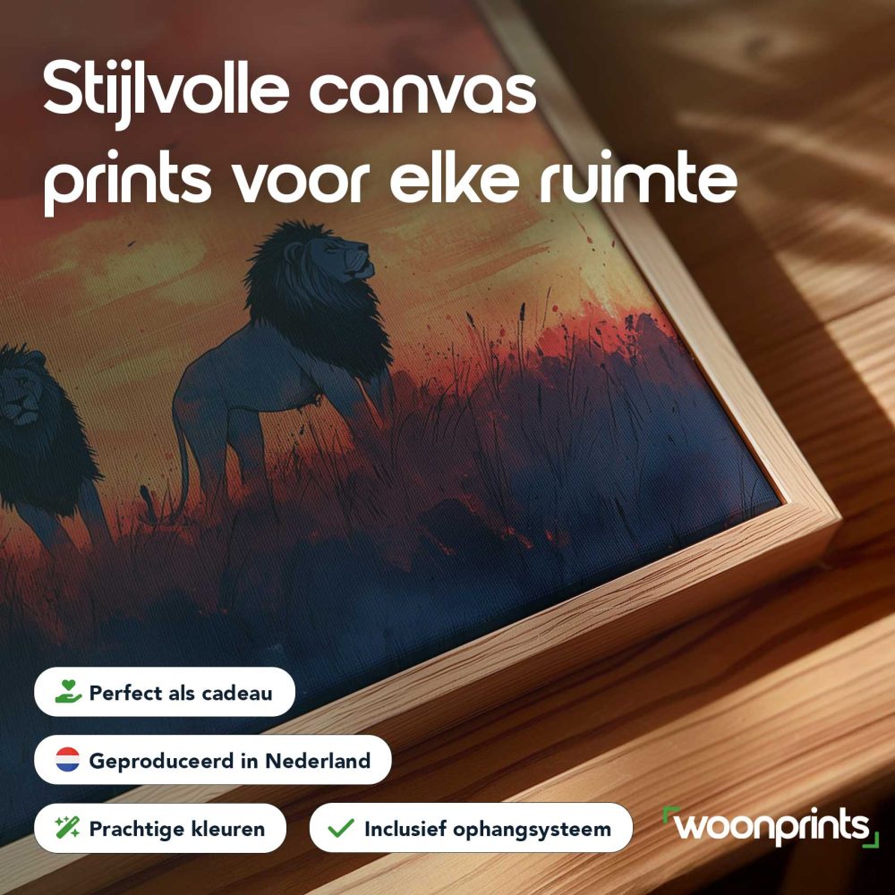 Terug naar collectie / Schilderijen / Dieren Schilderij / Majestueuze leeuwen in zonsondergang