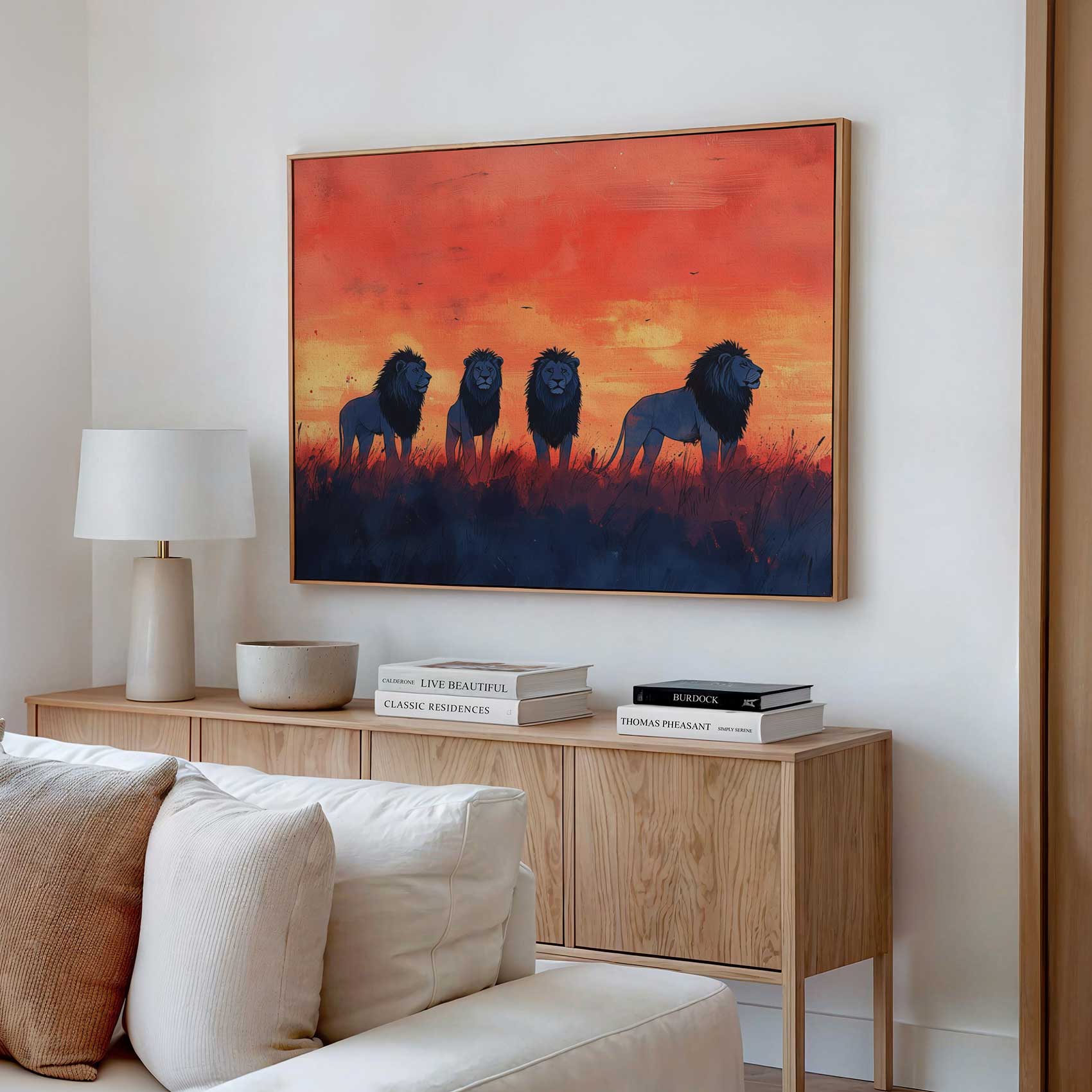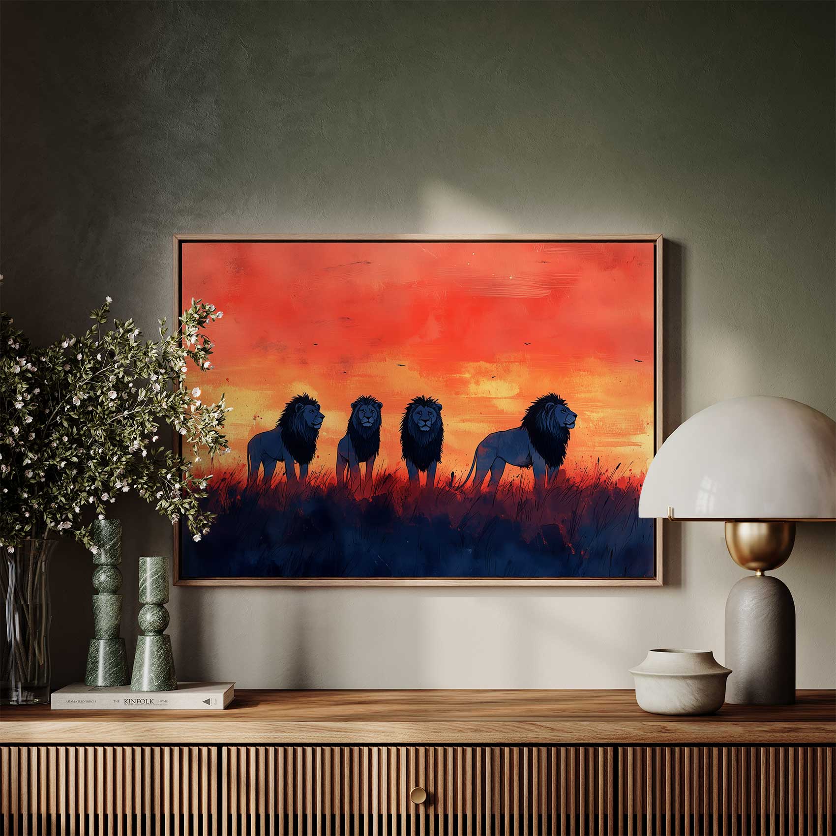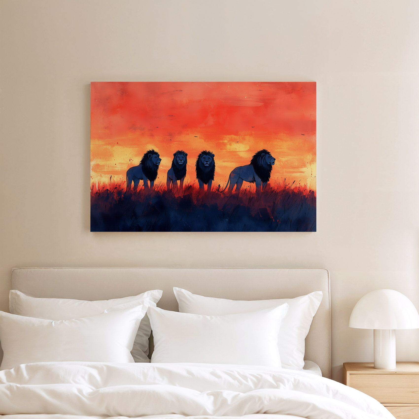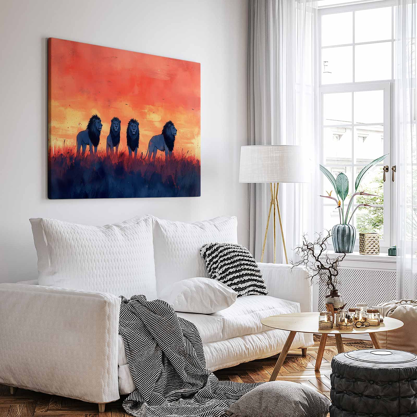 Terug naar collectie / Schilderijen / Dieren Schilderij / Majestueuze leeuwen in zonsondergang