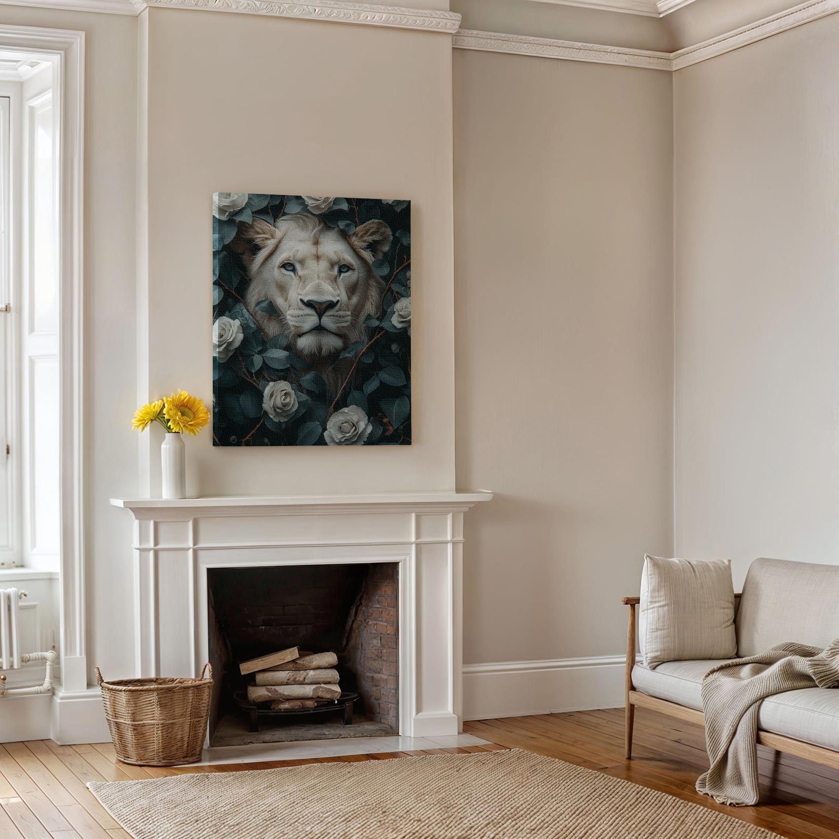 Terug naar collectie / Schilderijen / Bloemen Schilderij / Majestueuze leeuwenkop tussen rozen