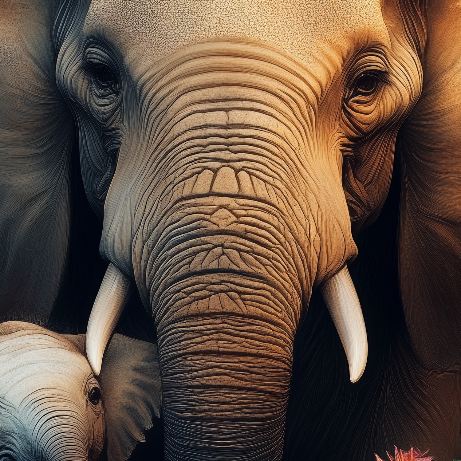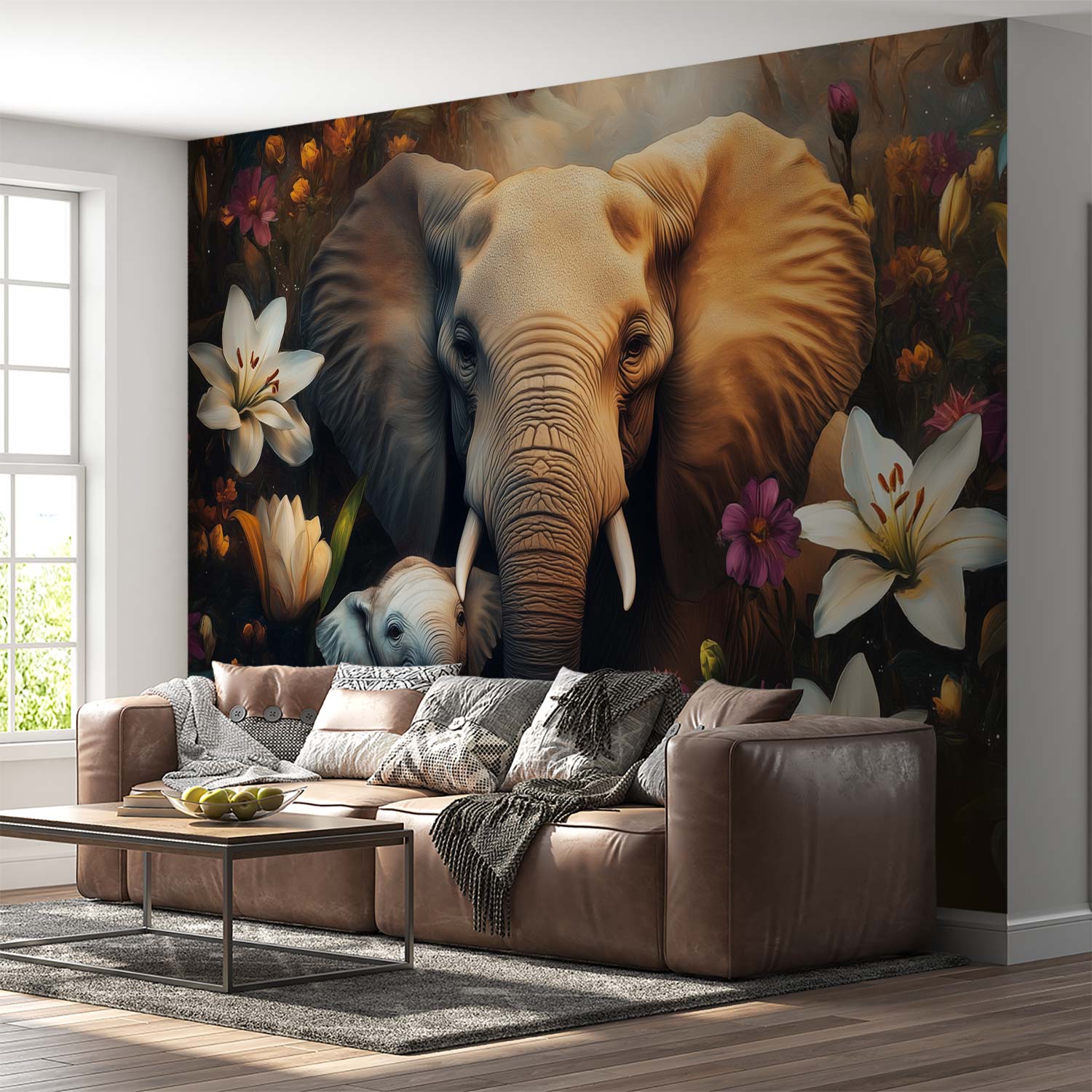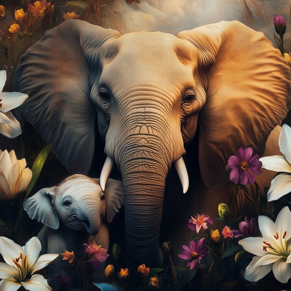 Terug naar collectie / Behang / Majestueuze olifant in bloemenzee behang