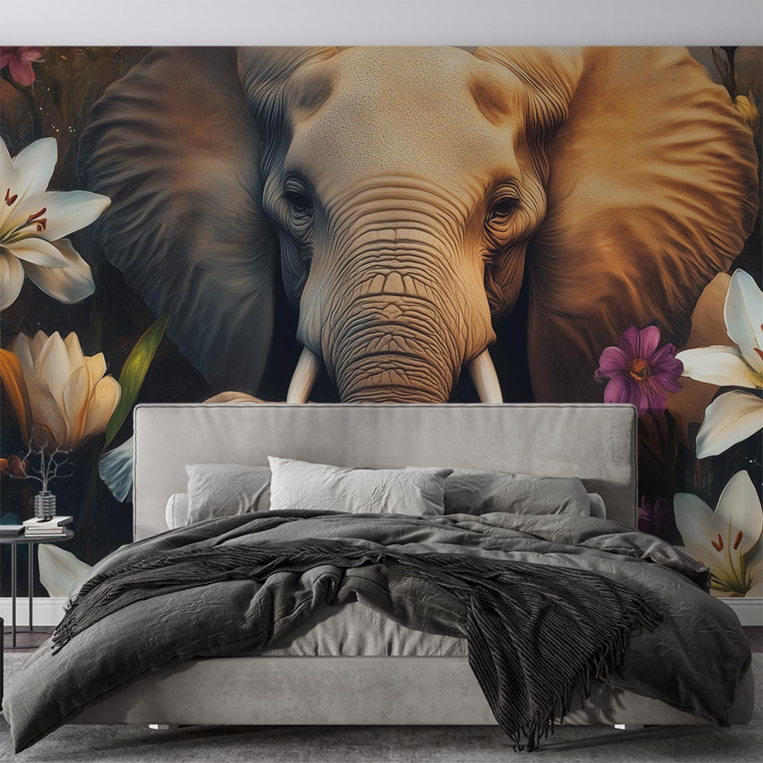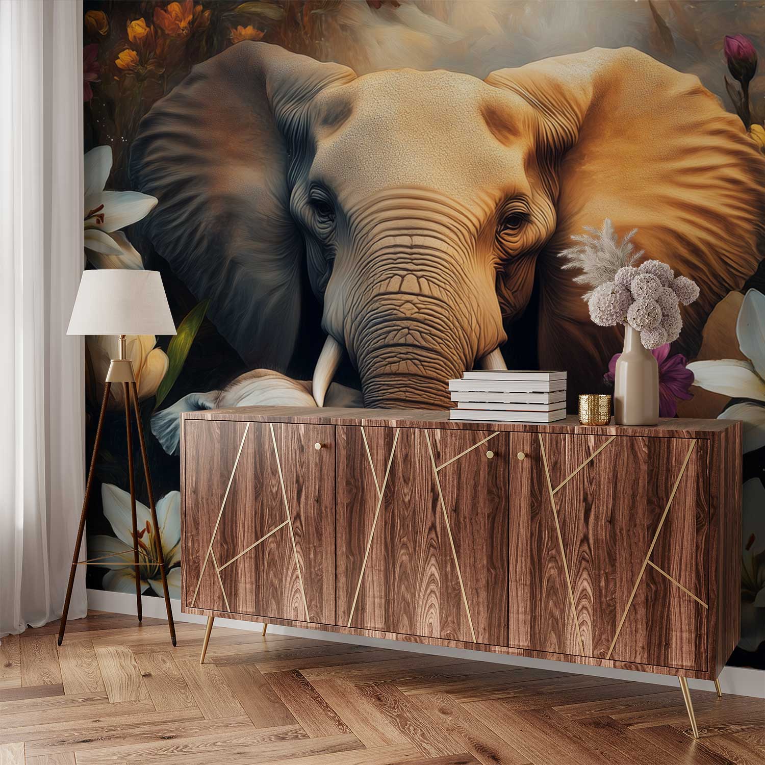 Majestueuze olifant in bloemenzee behang