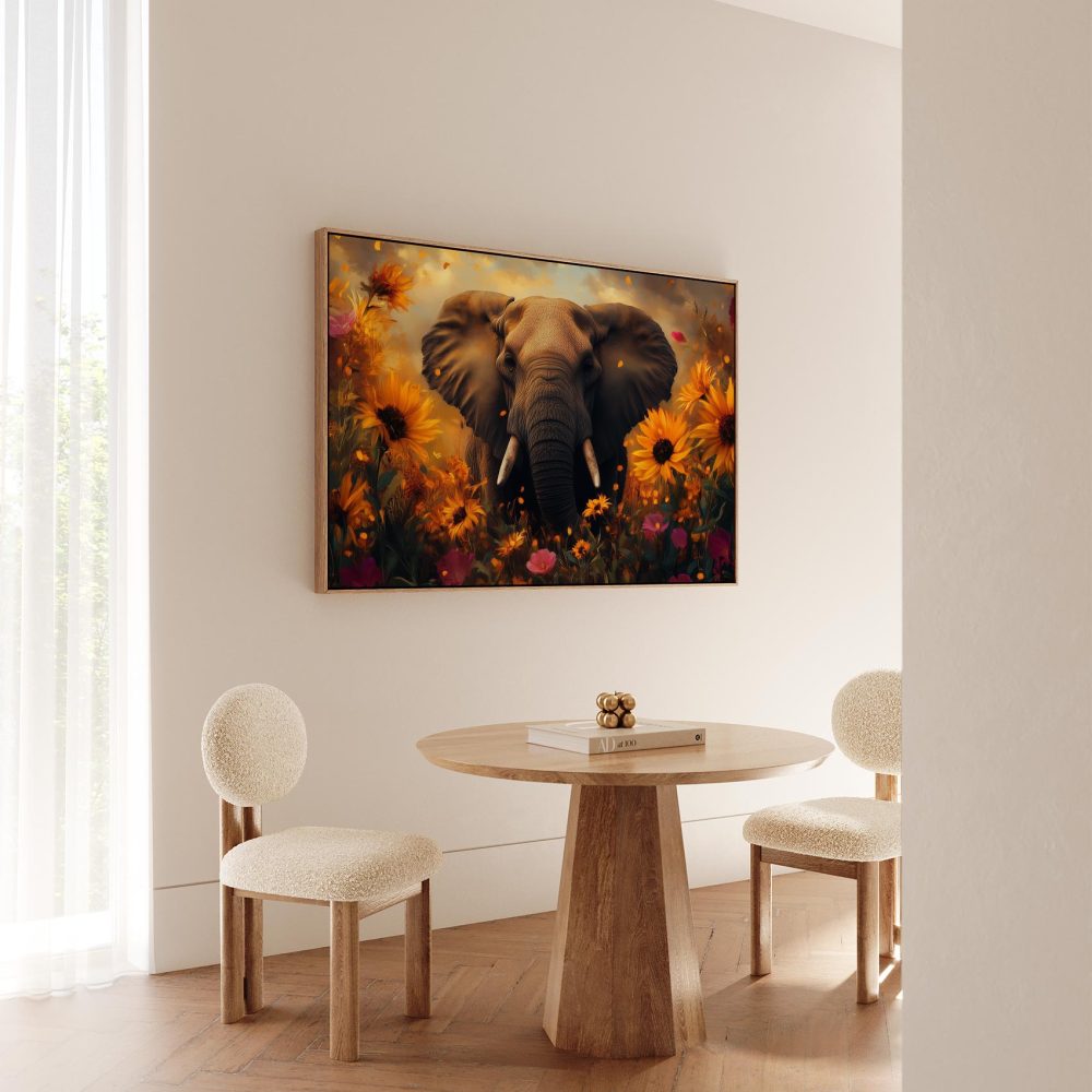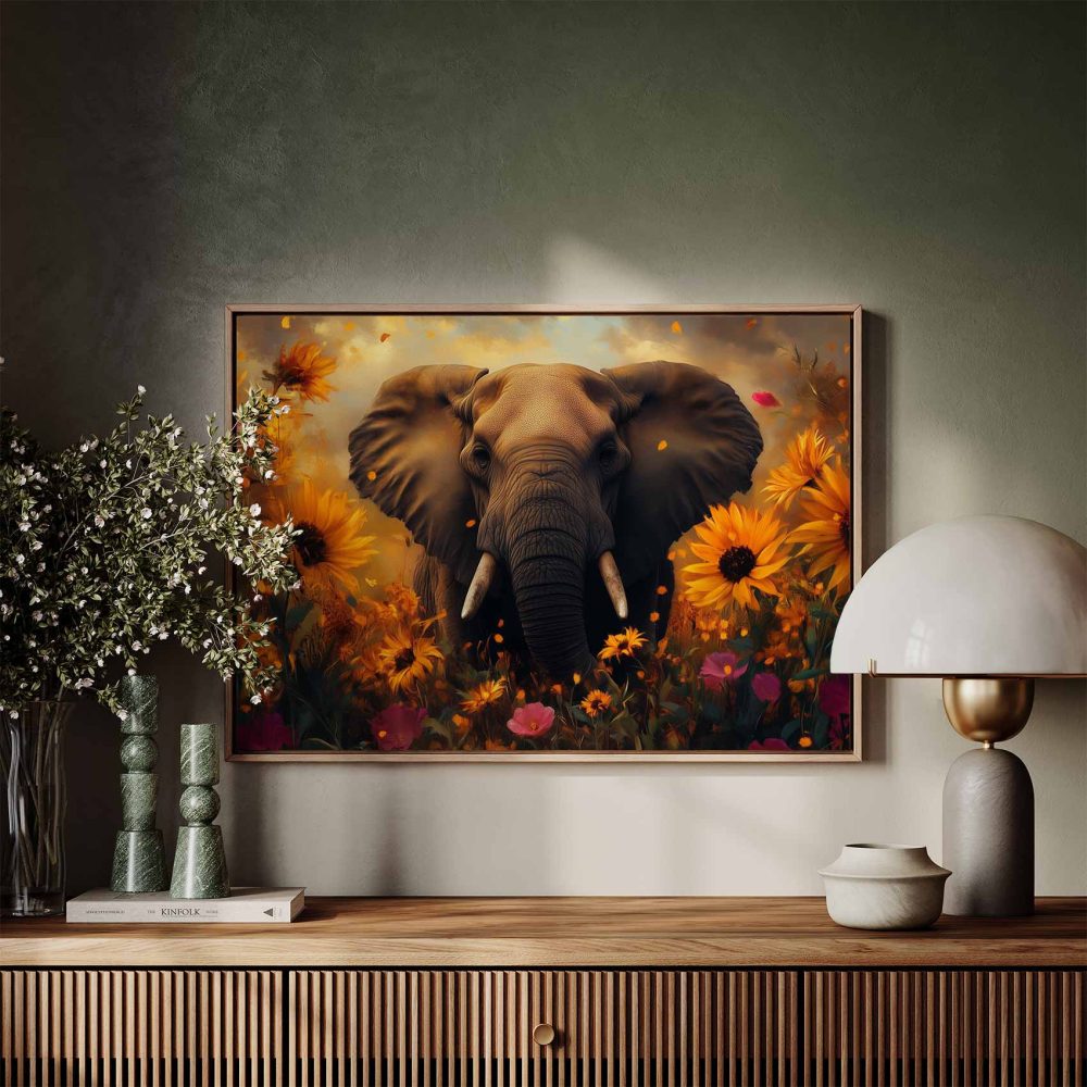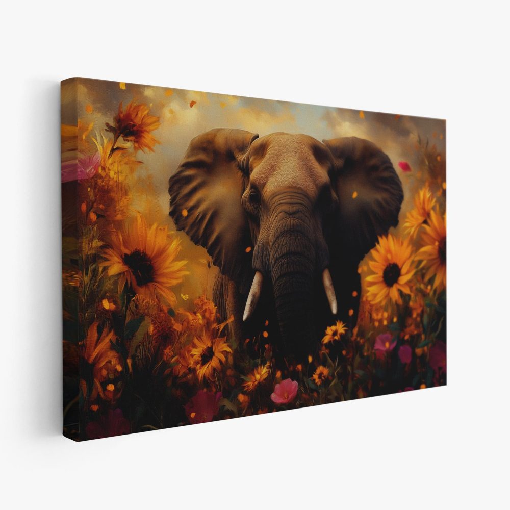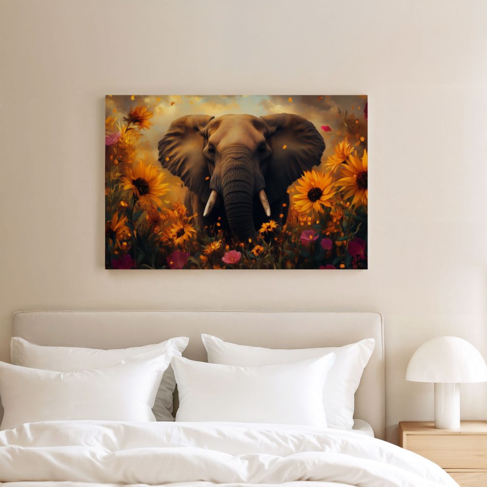 Terug naar collectie / Schilderijen / Bloemen Schilderij / Majestueuze olifant in bloemenzee