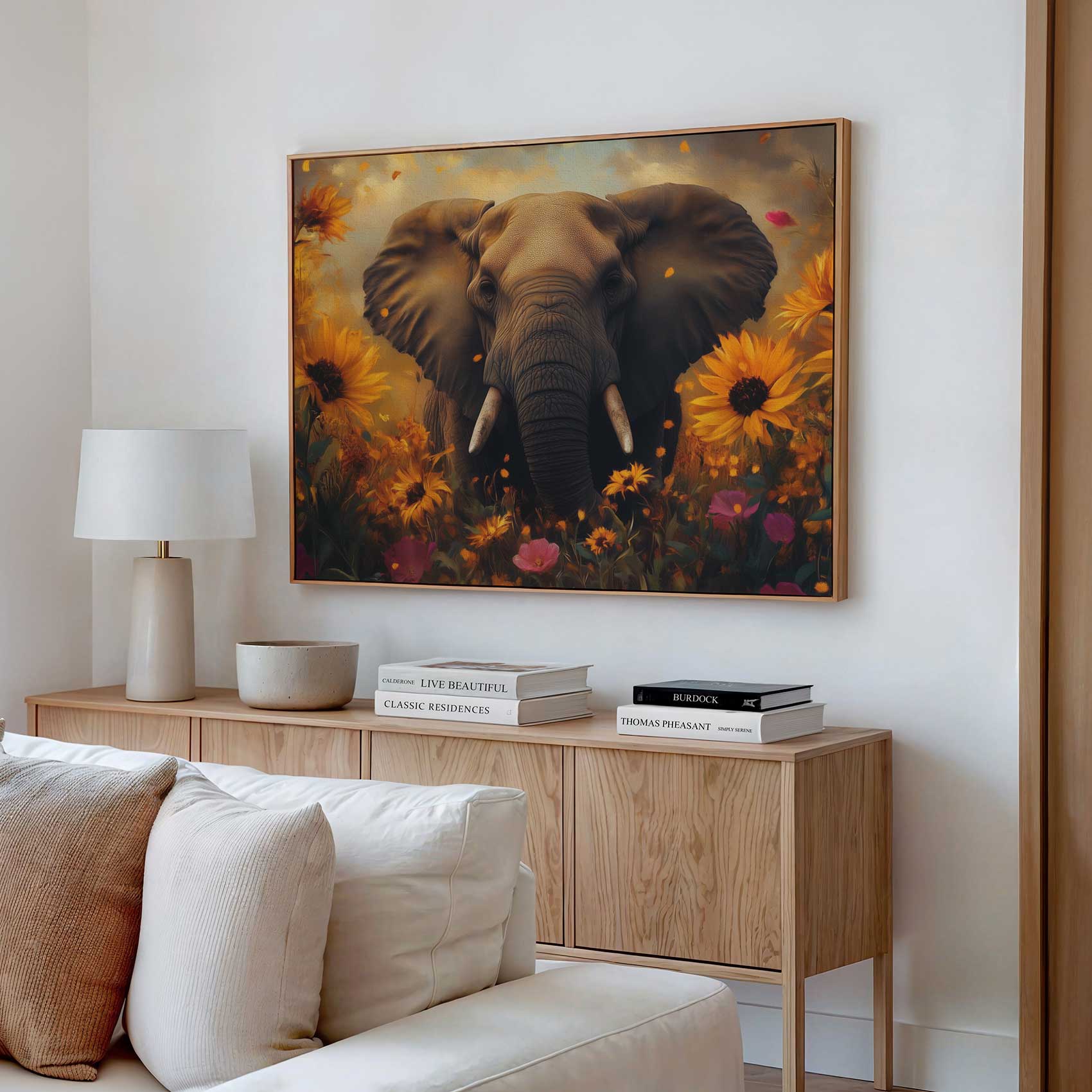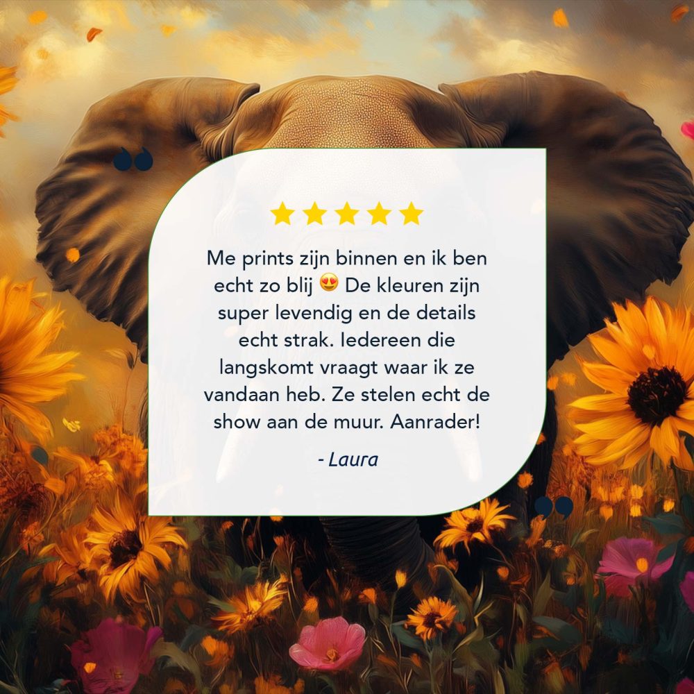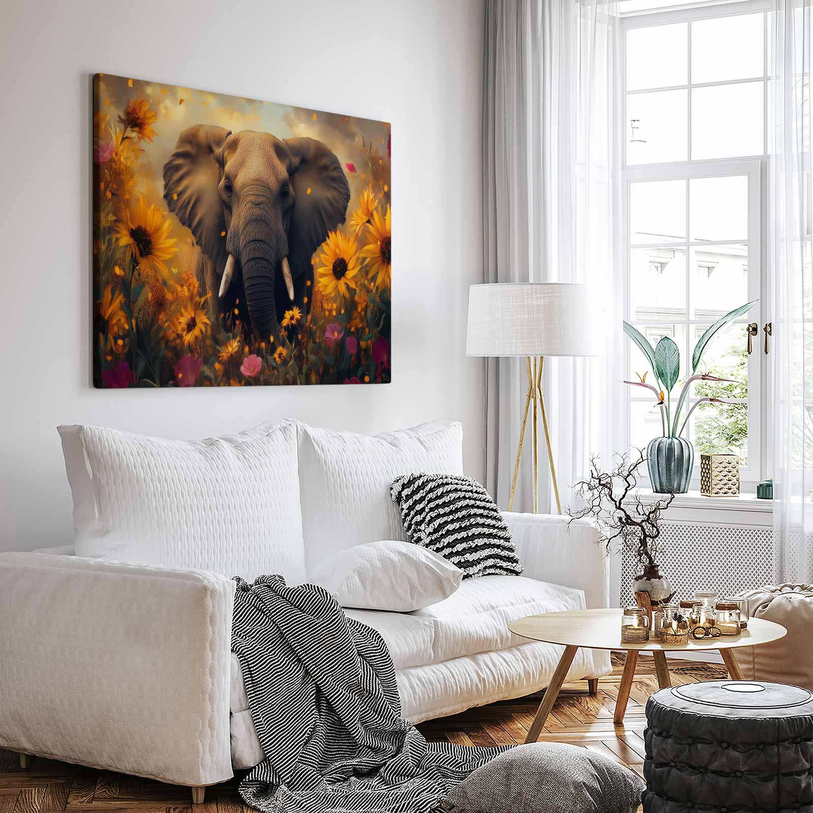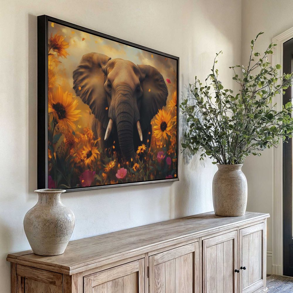 Terug naar collectie / Schilderijen / Bloemen Schilderij / Majestueuze olifant in bloemenzee