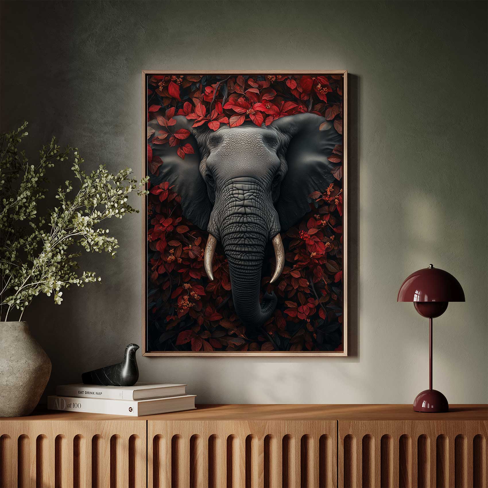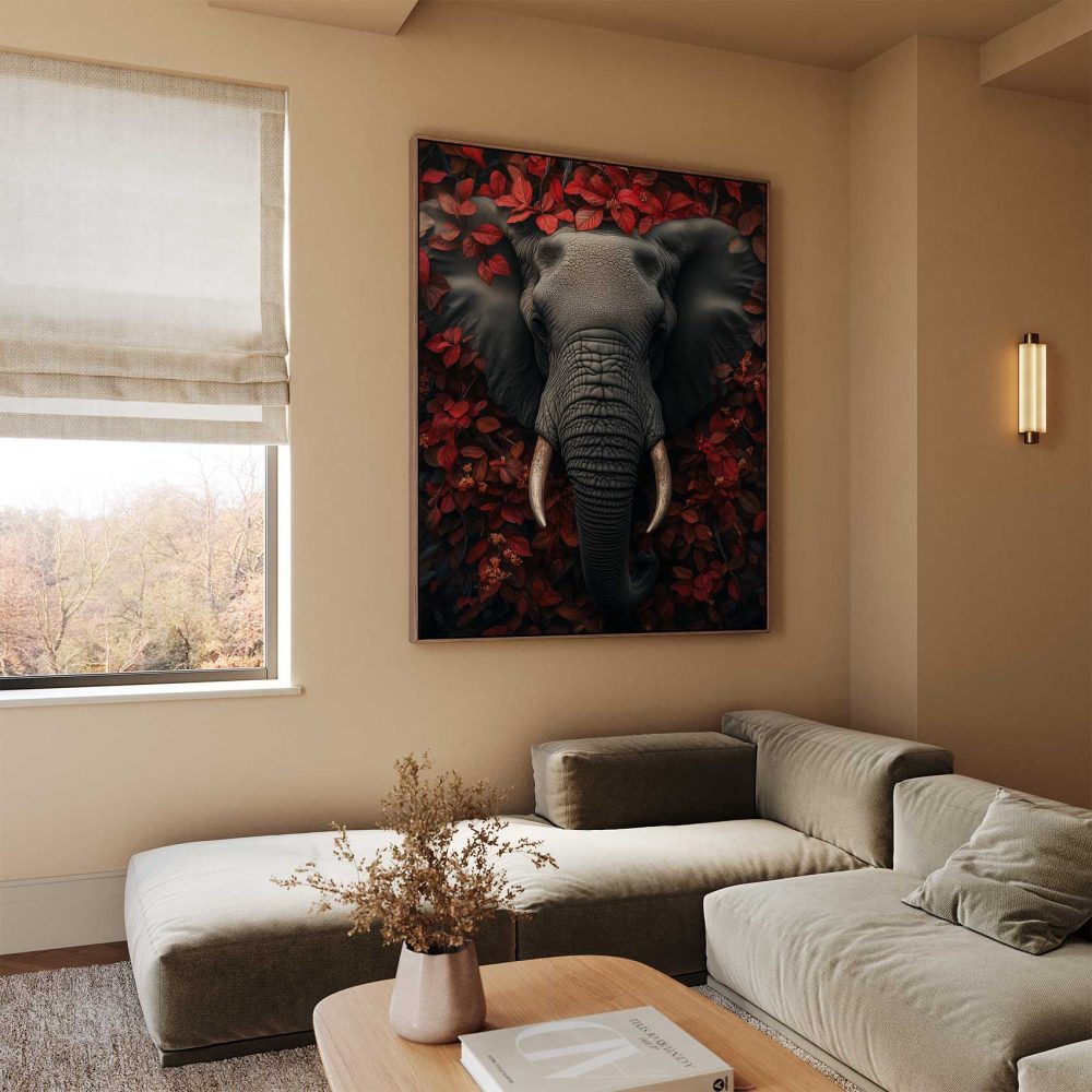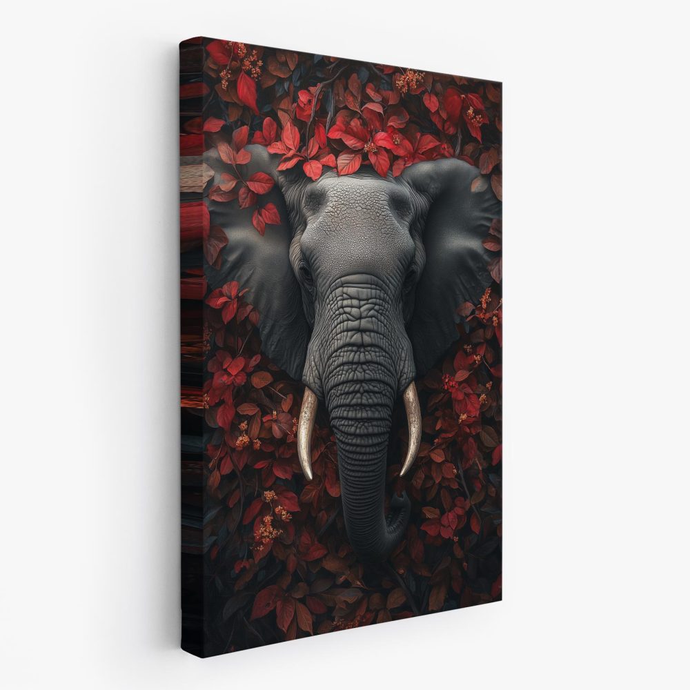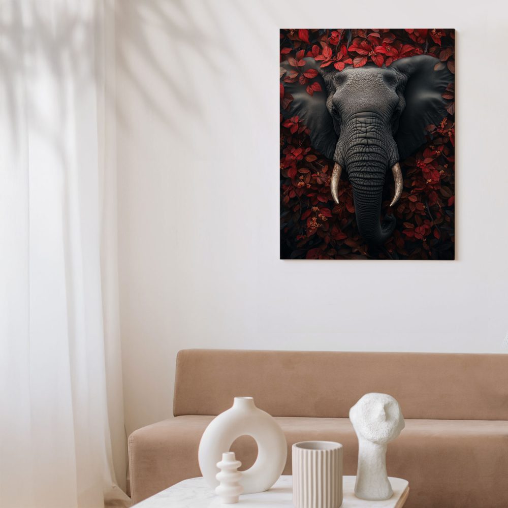 Terug naar collectie / Schilderijen / Bloemen Schilderij / Majestueuze olifant in rood bos