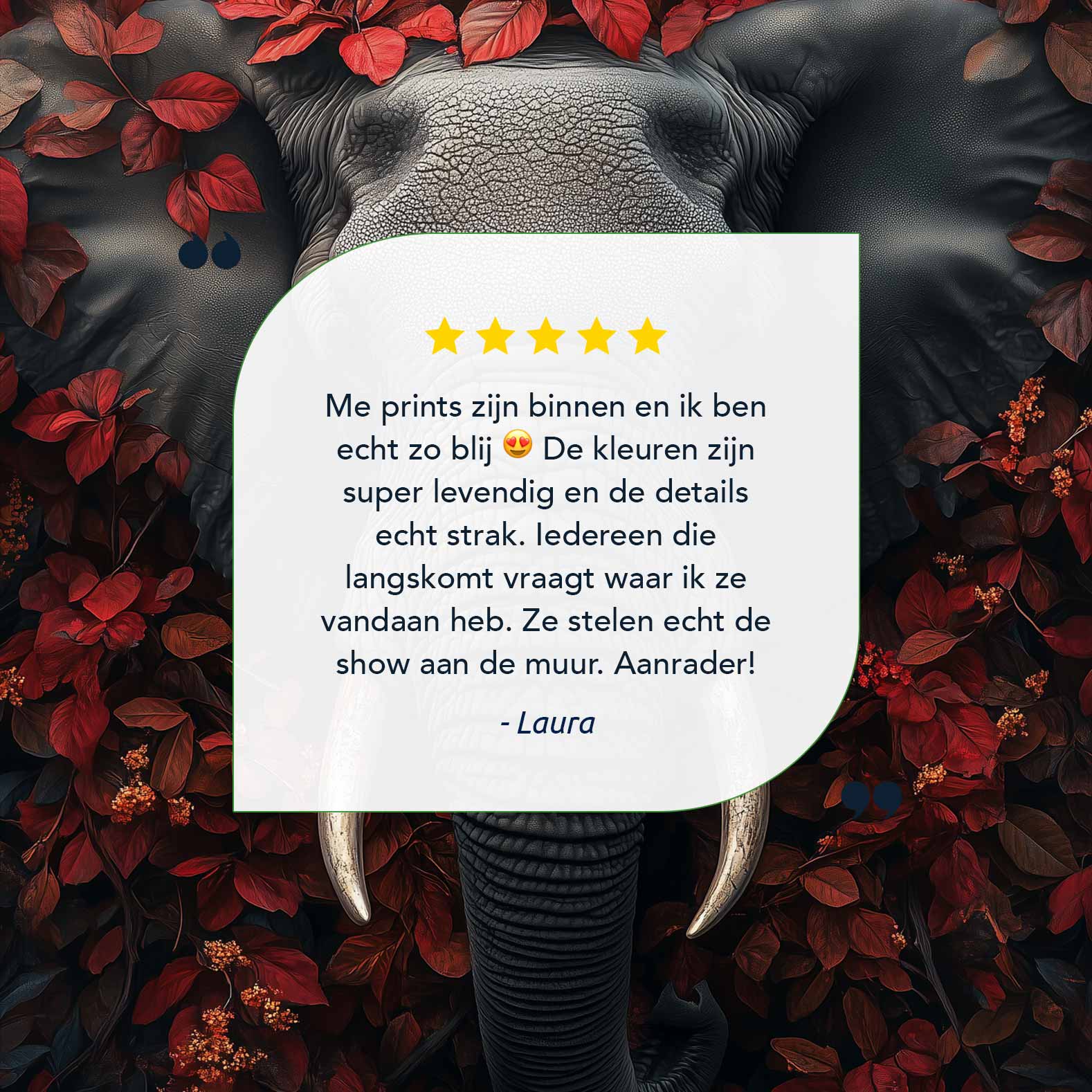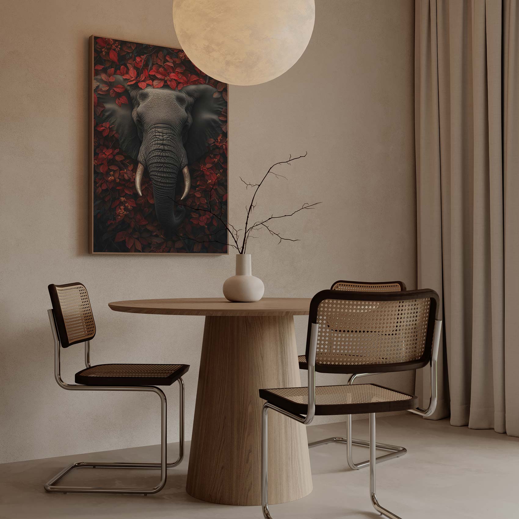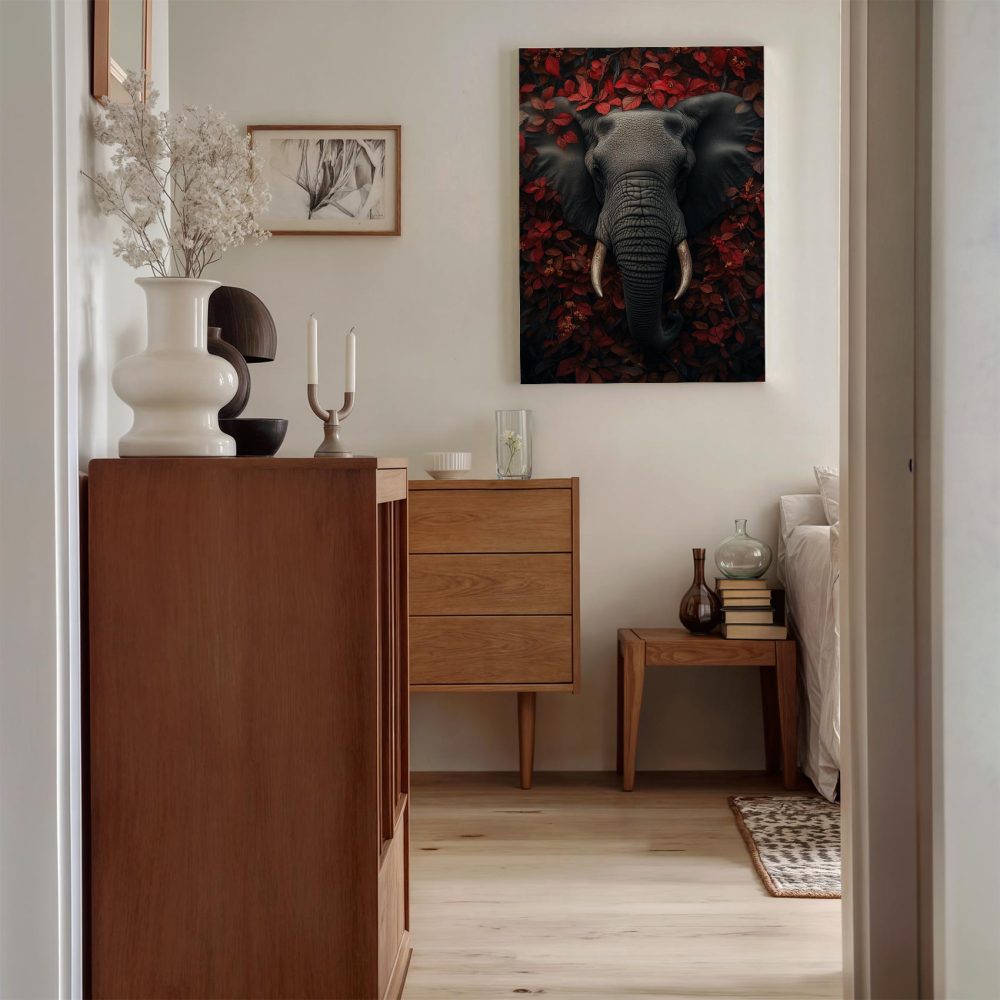 Terug naar collectie / Schilderijen / Bloemen Schilderij / Majestueuze olifant in rood bos