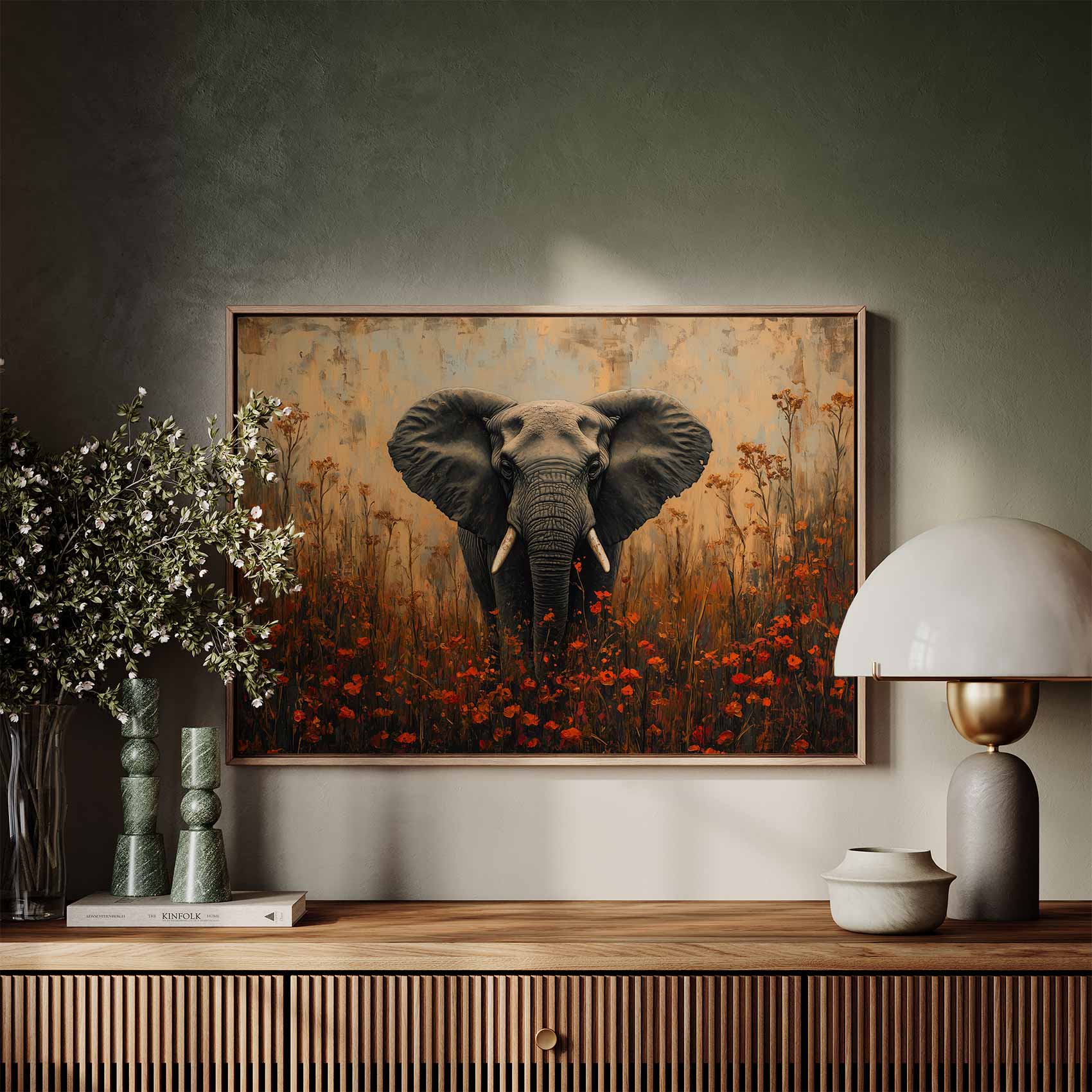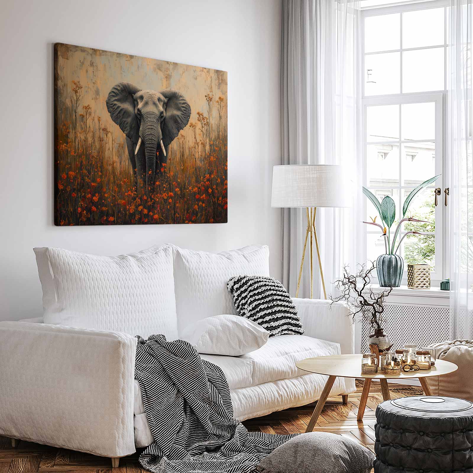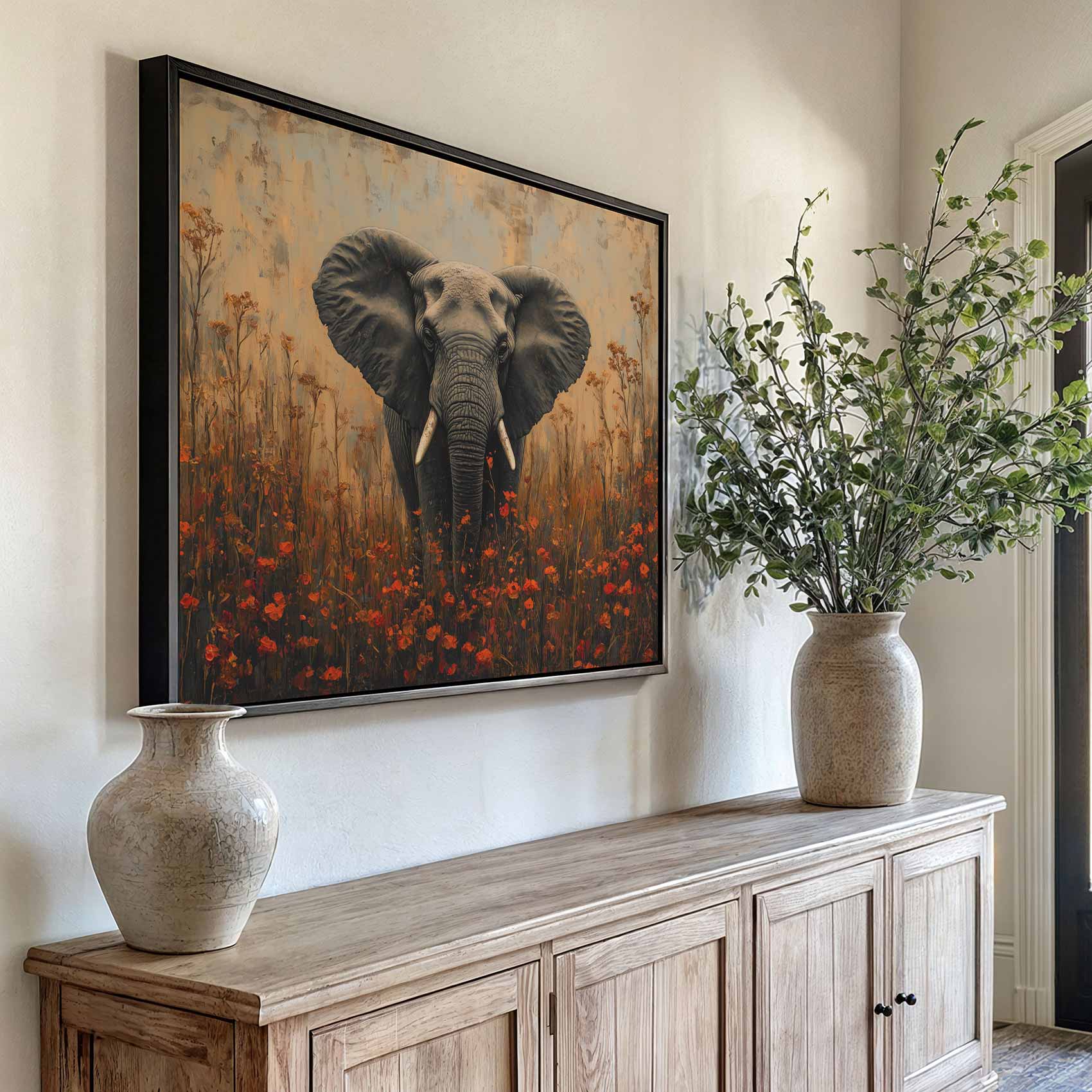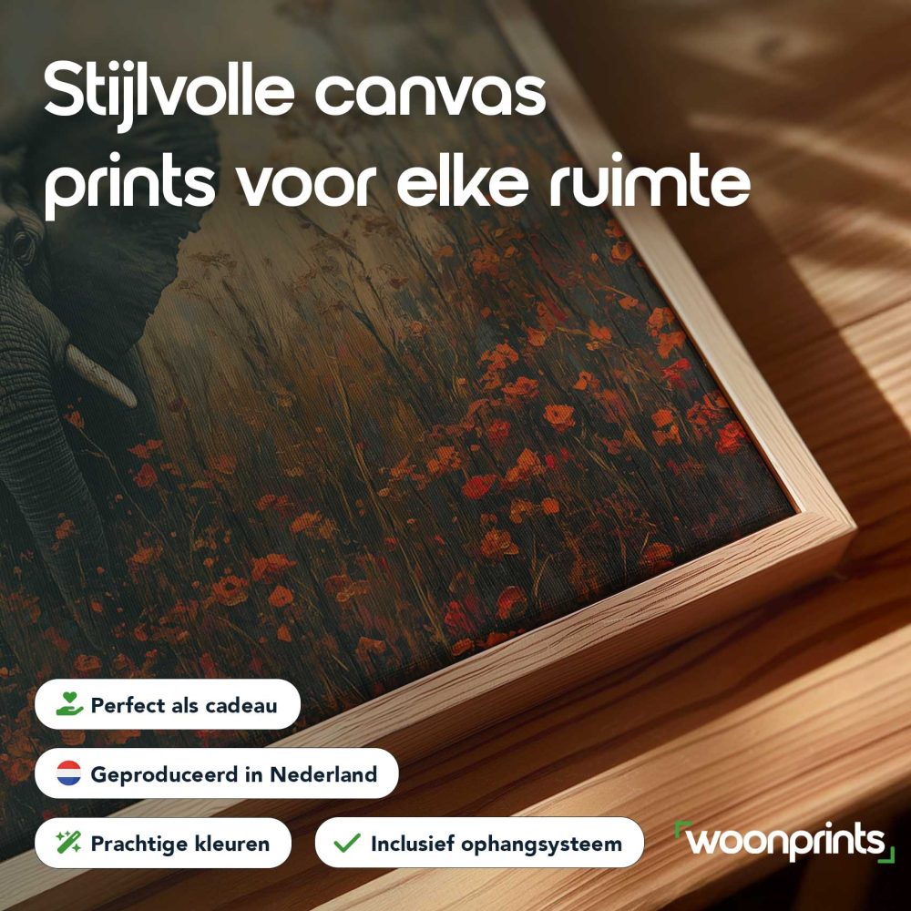 Terug naar collectie / Schilderijen / Bloemen Schilderij / Majestueuze olifant tussen bloemen