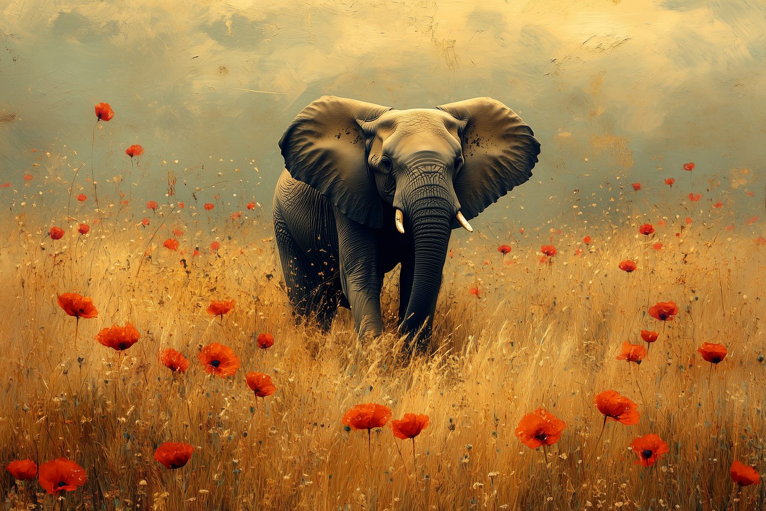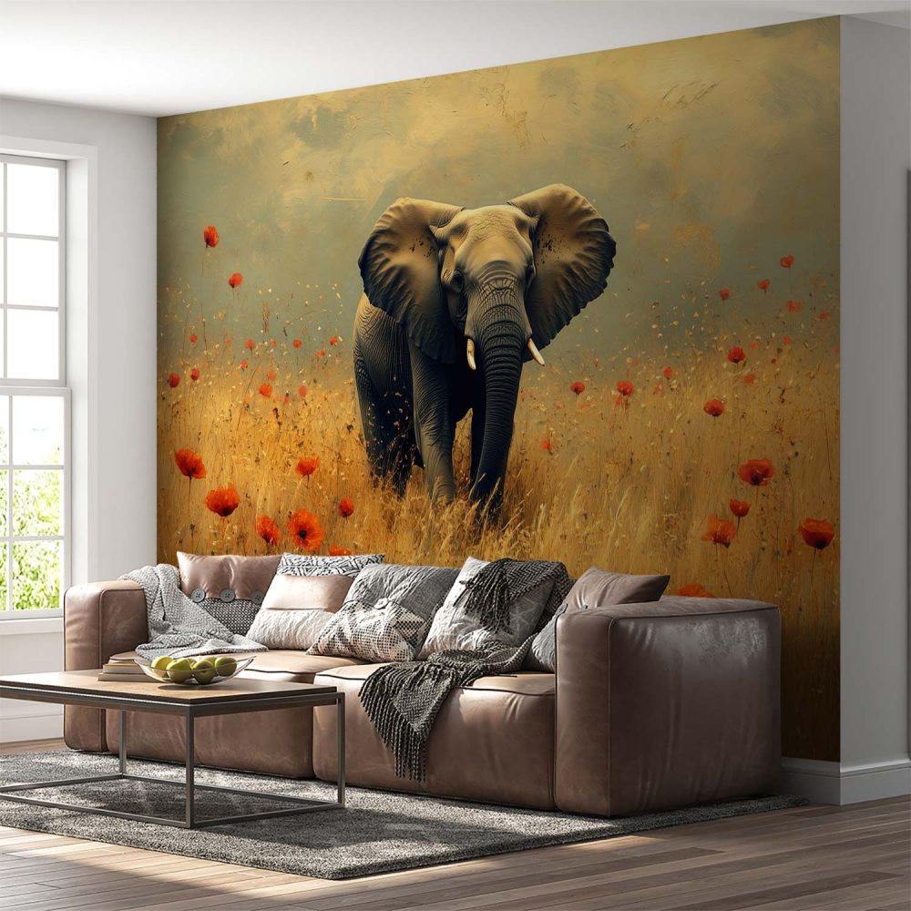 Terug naar collectie / Behang / Majestueuze olifant tussen klaprozen behang