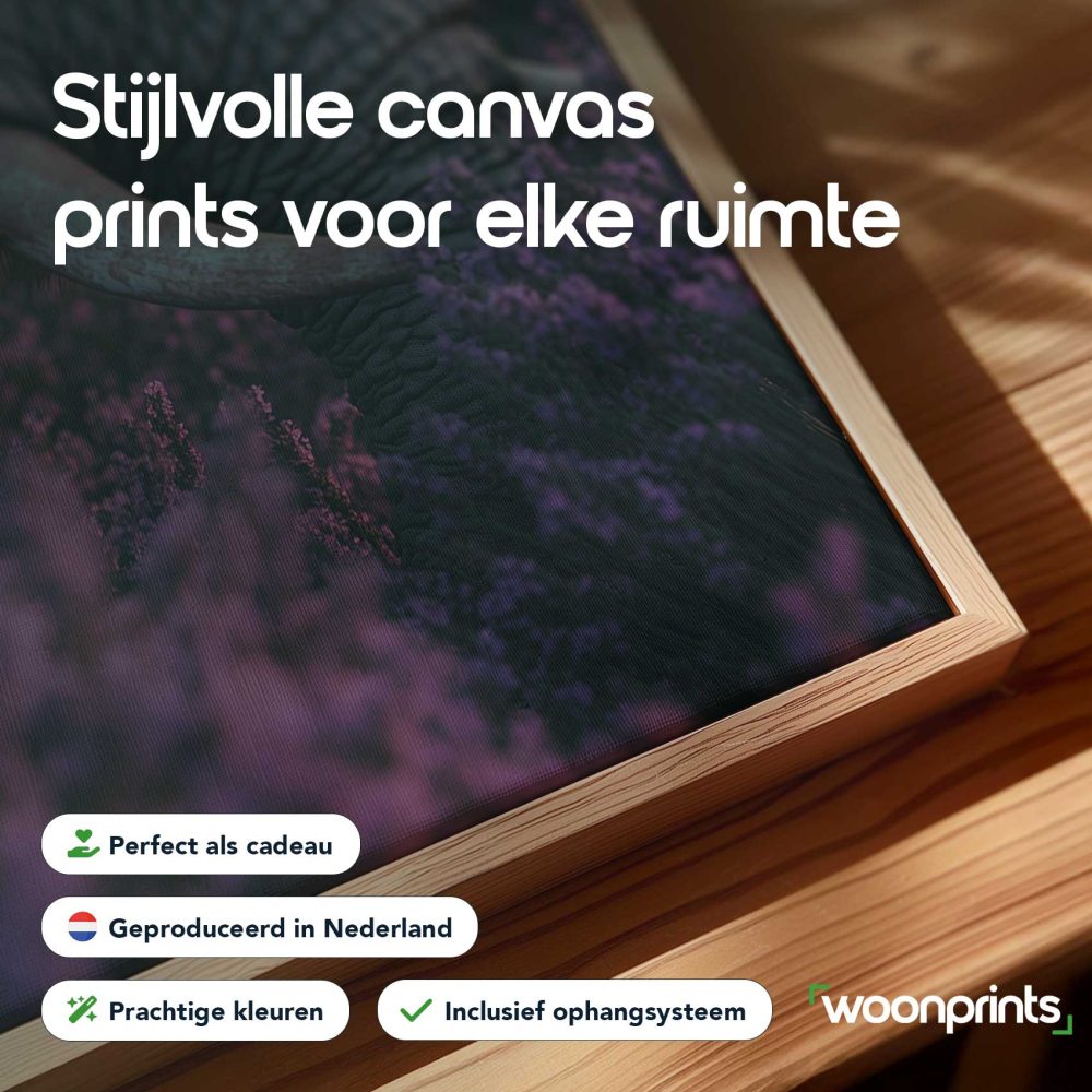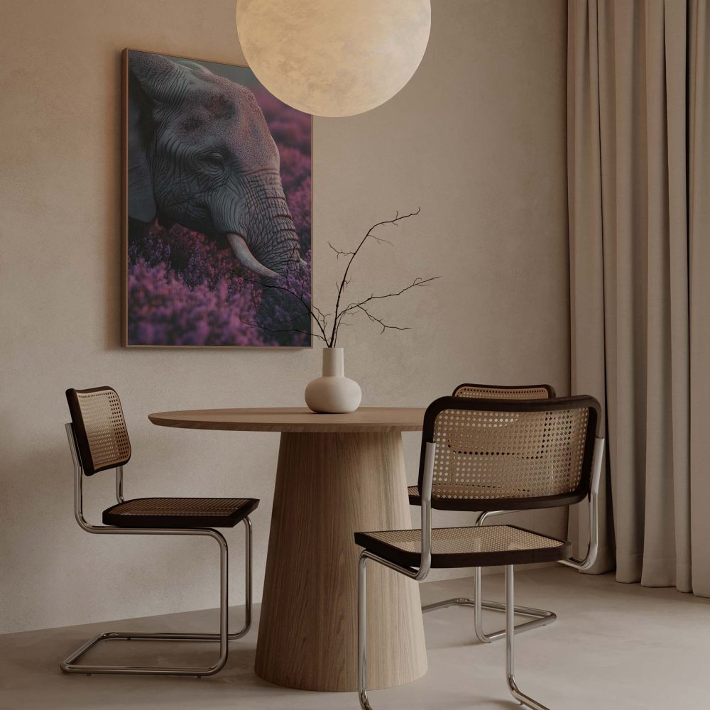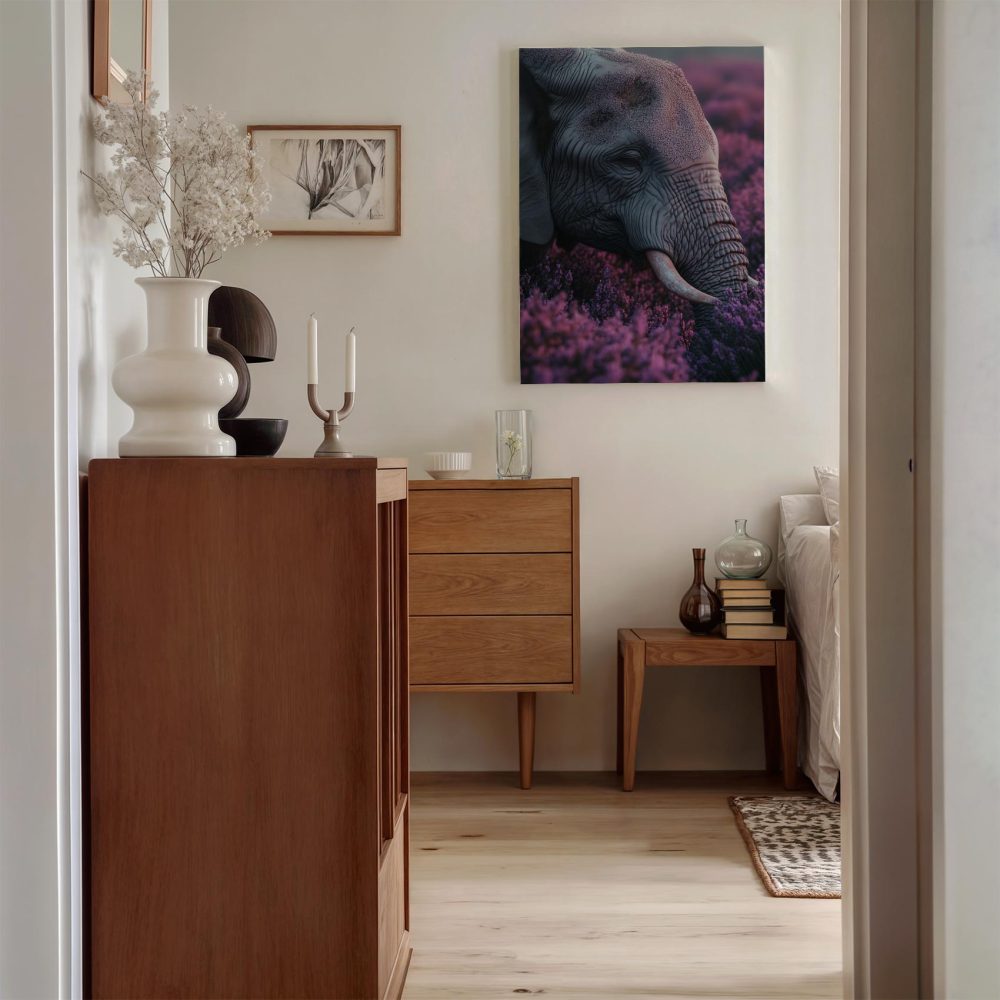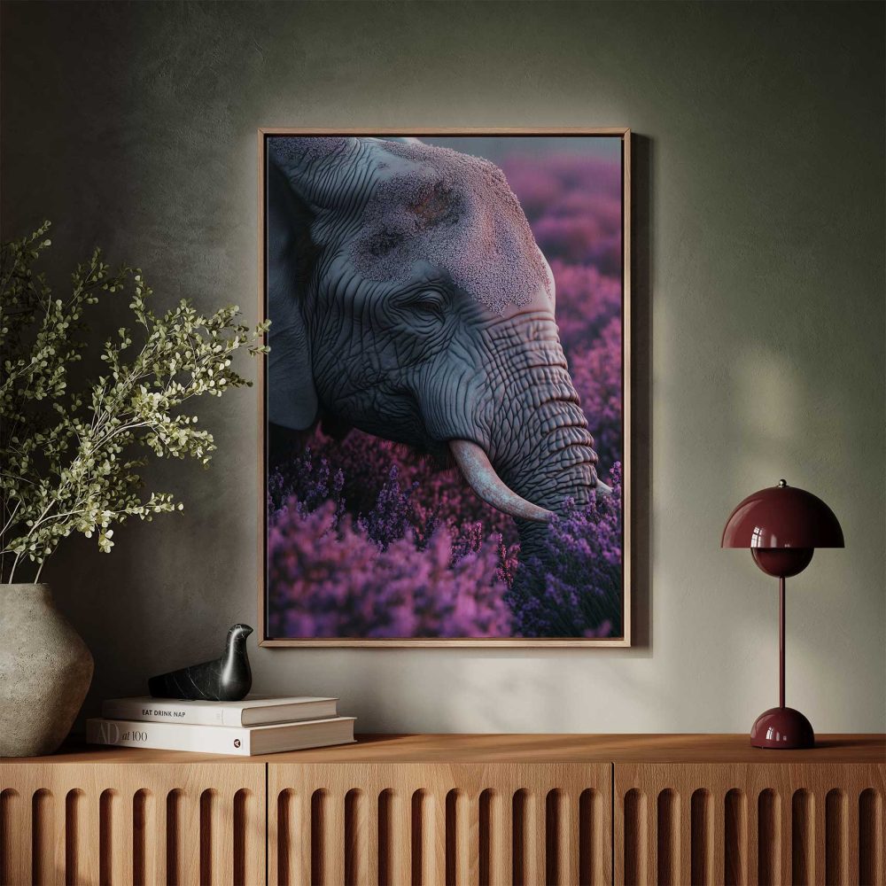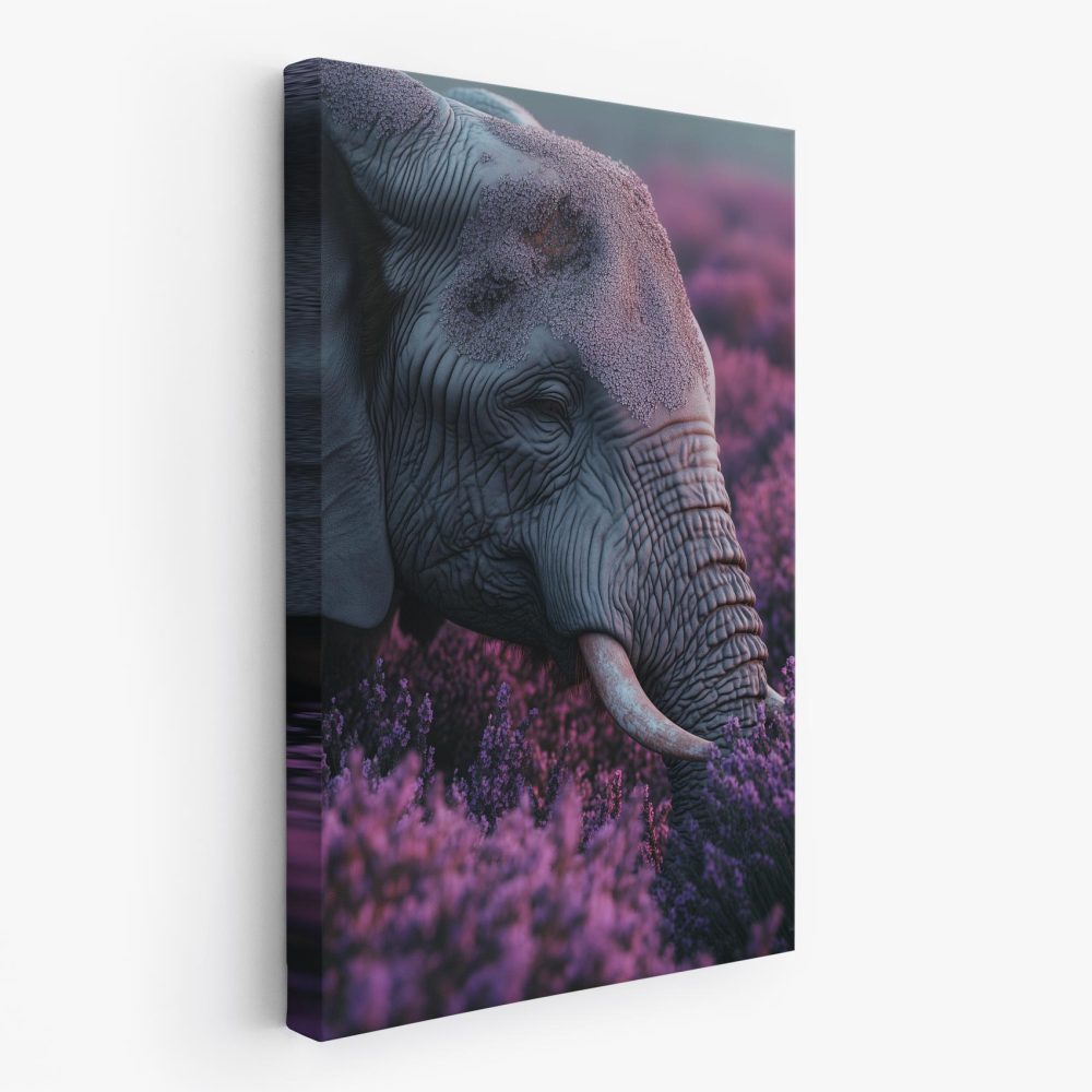 Terug naar collectie / Schilderijen / Bloemen Schilderij / Majestueuze olifant tussen paarse bloemen