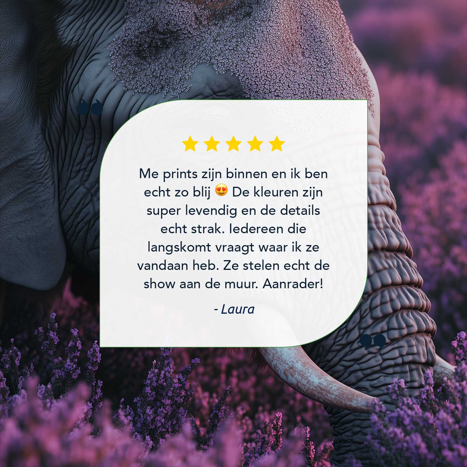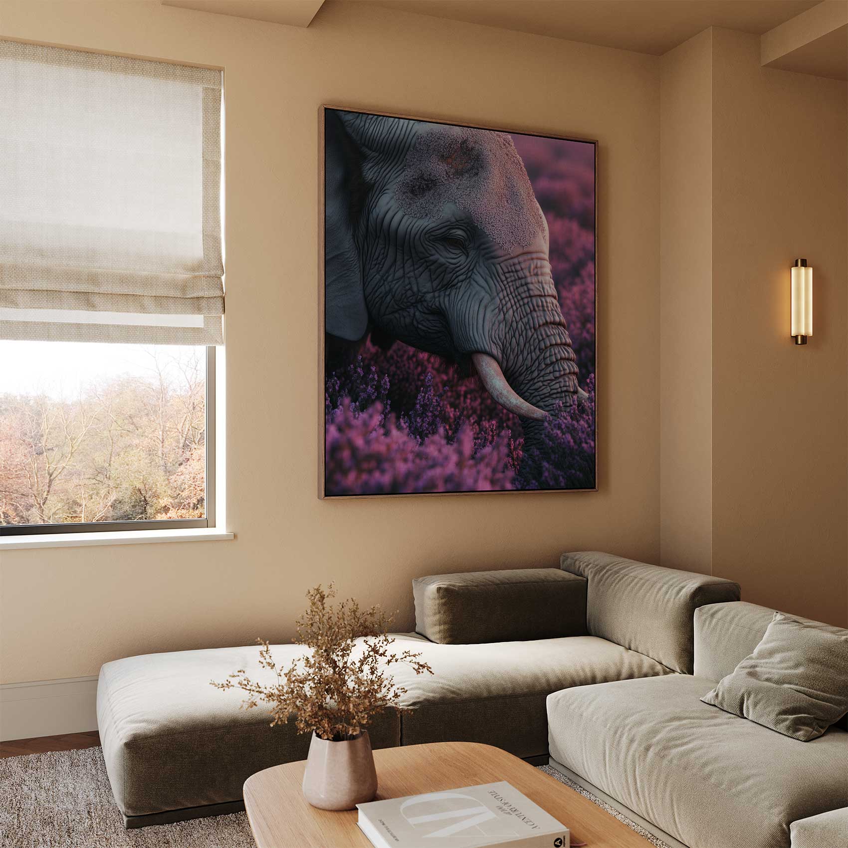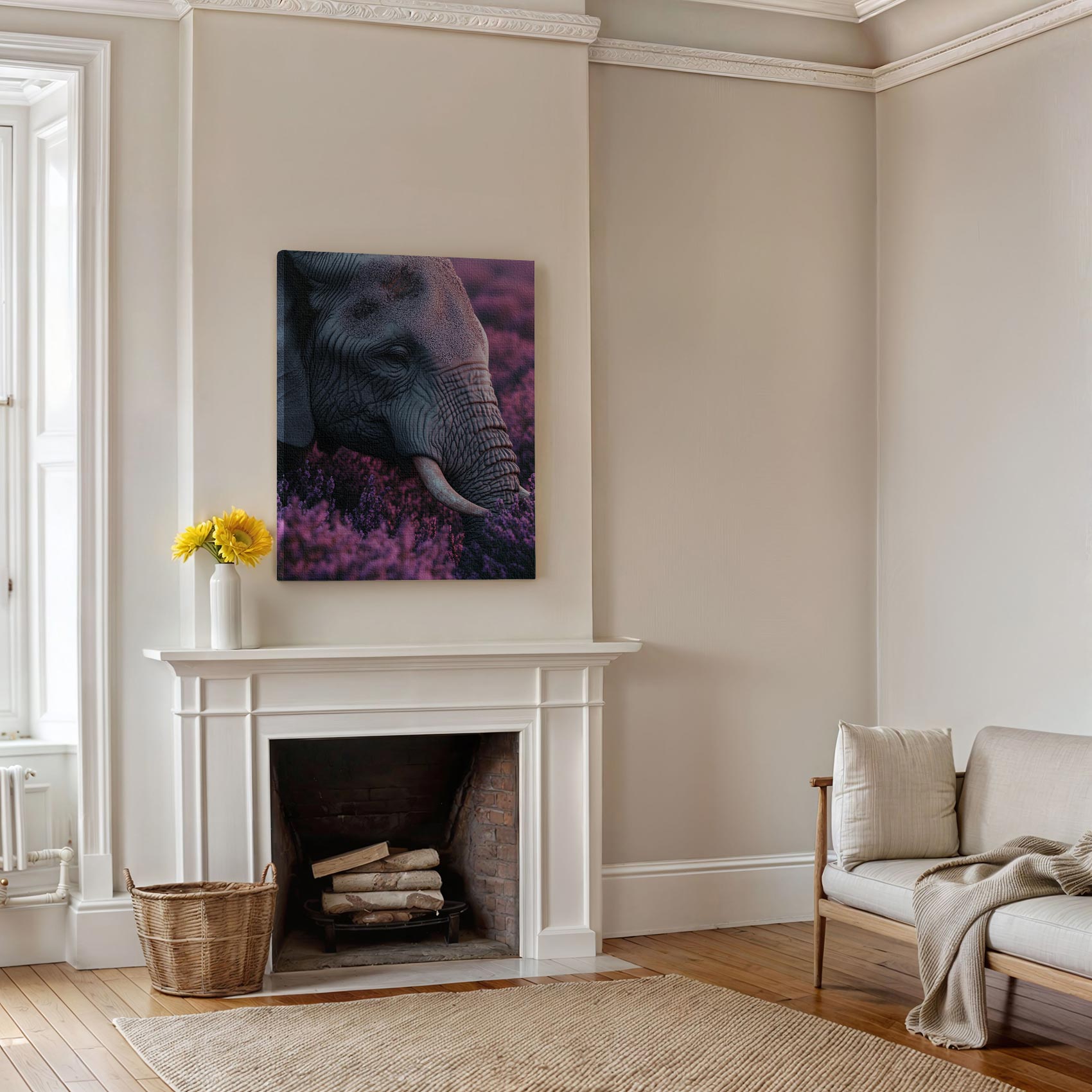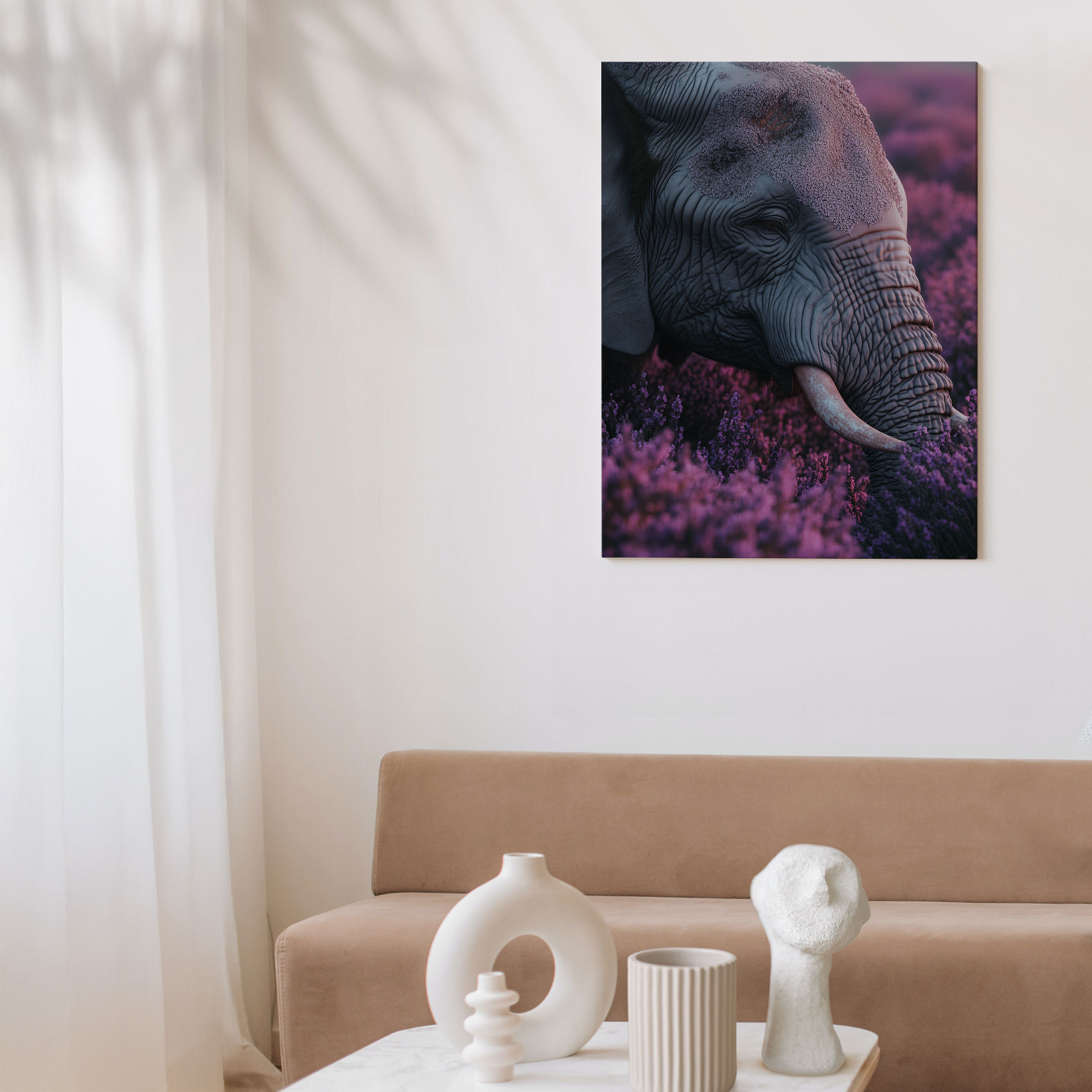 Terug naar collectie / Schilderijen / Bloemen Schilderij / Majestueuze olifant tussen paarse bloemen