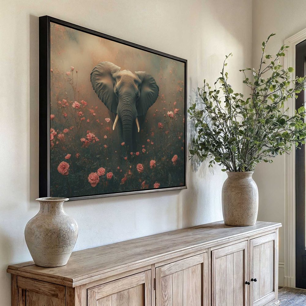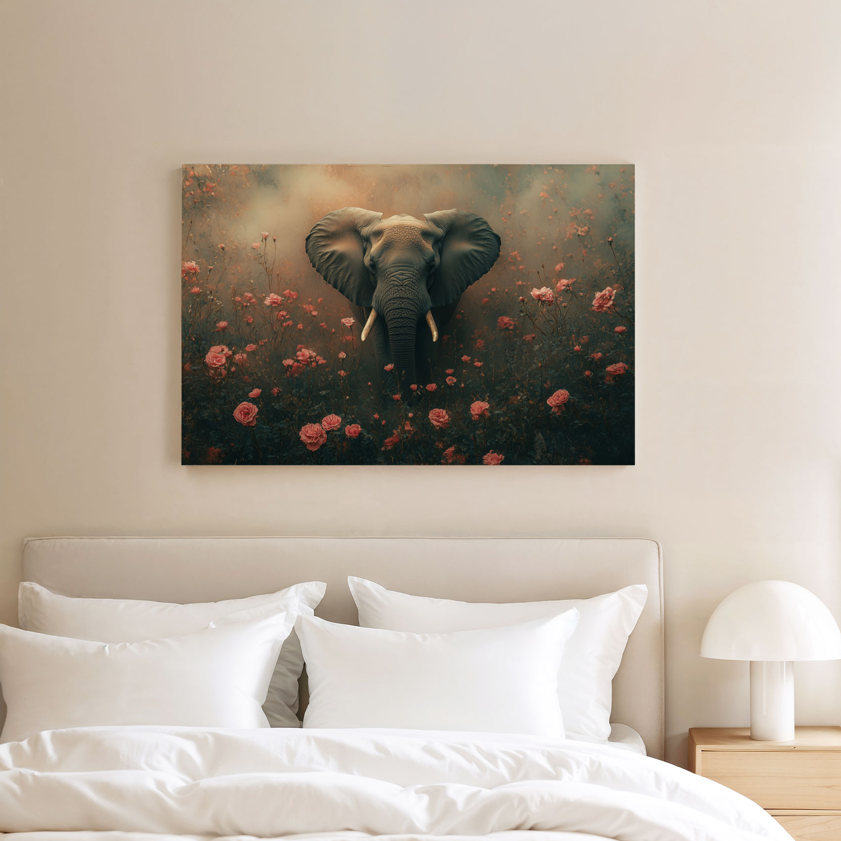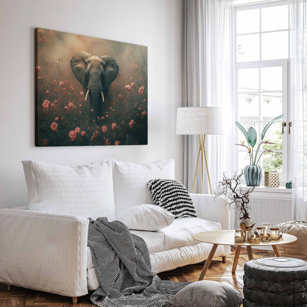 Terug naar collectie / Schilderijen / Bloemen Schilderij / Majestueuze olifant tussen roze bloemen