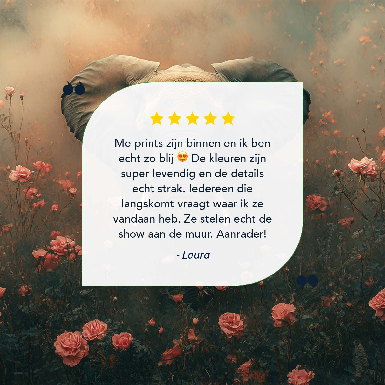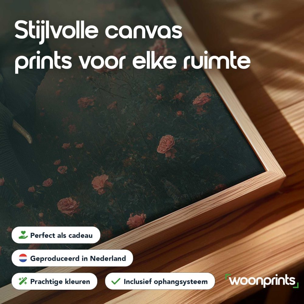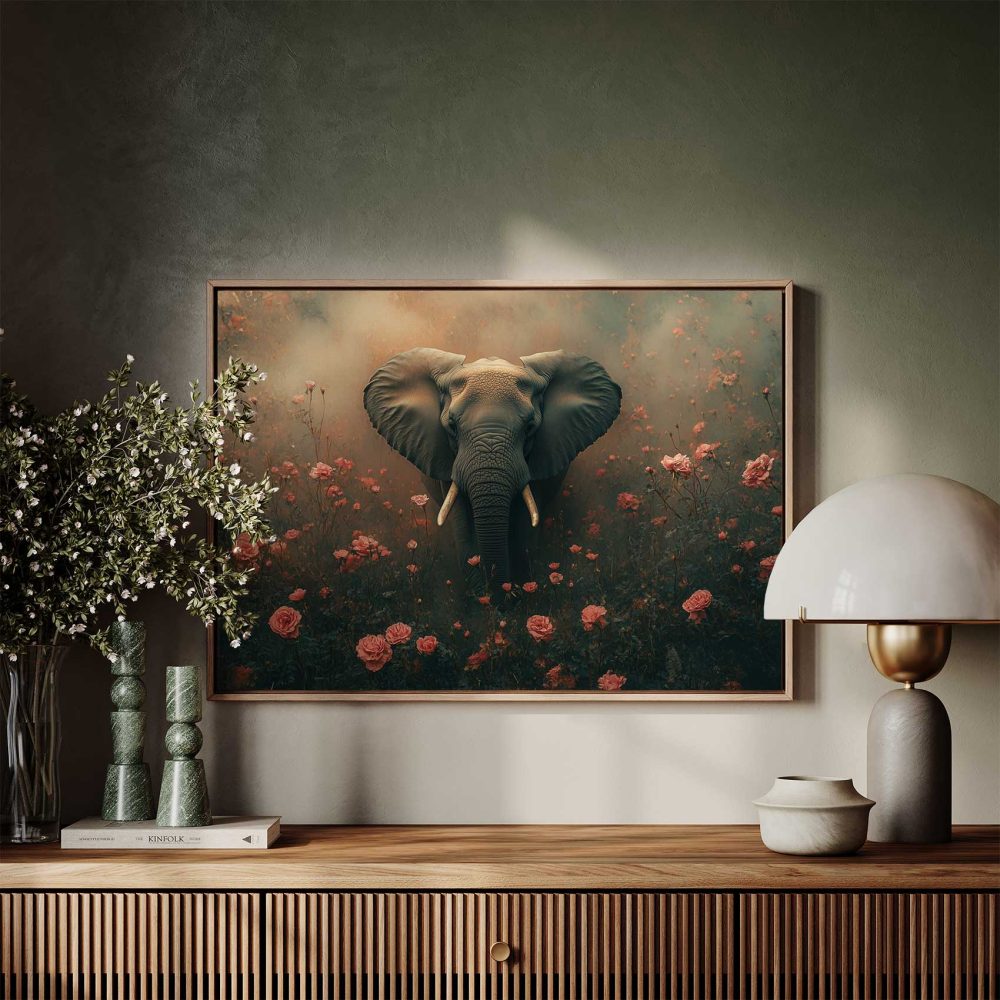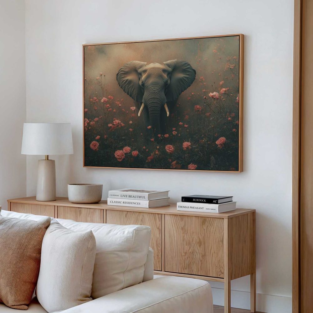 Terug naar collectie / Schilderijen / Bloemen Schilderij / Majestueuze olifant tussen roze bloemen