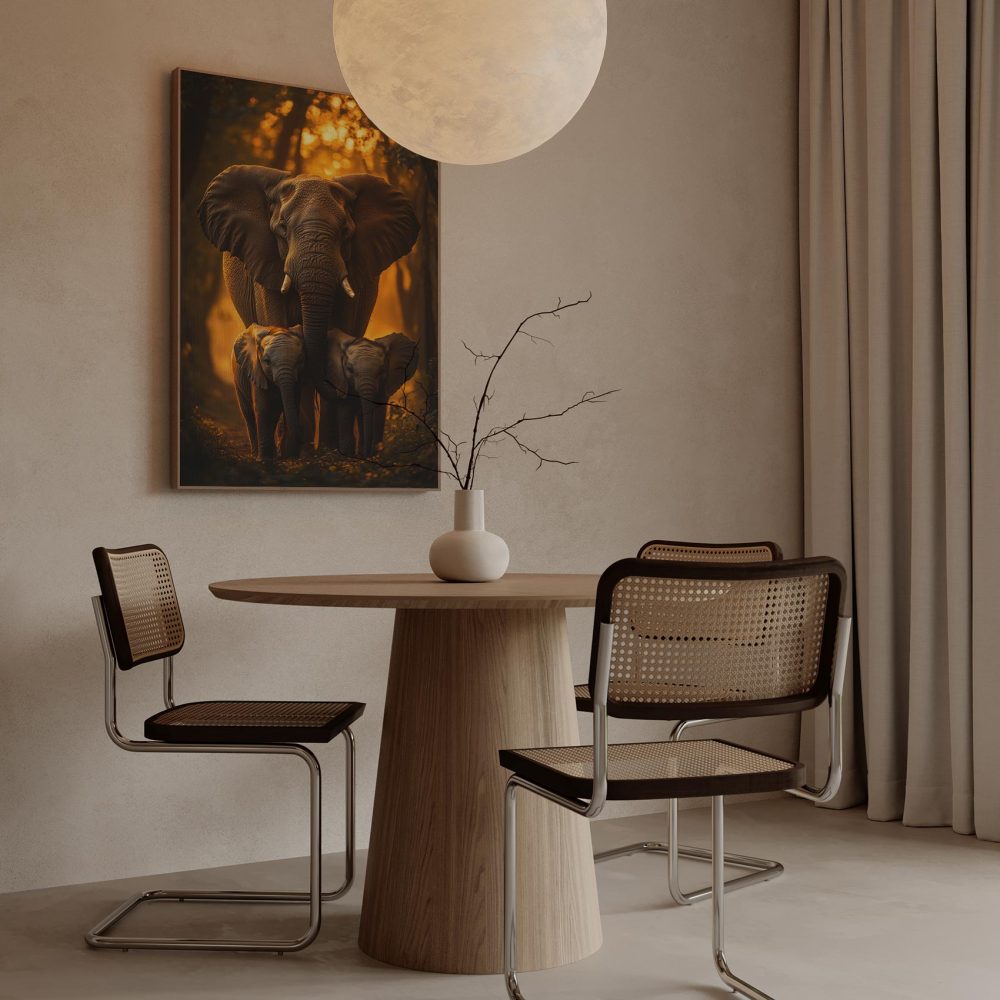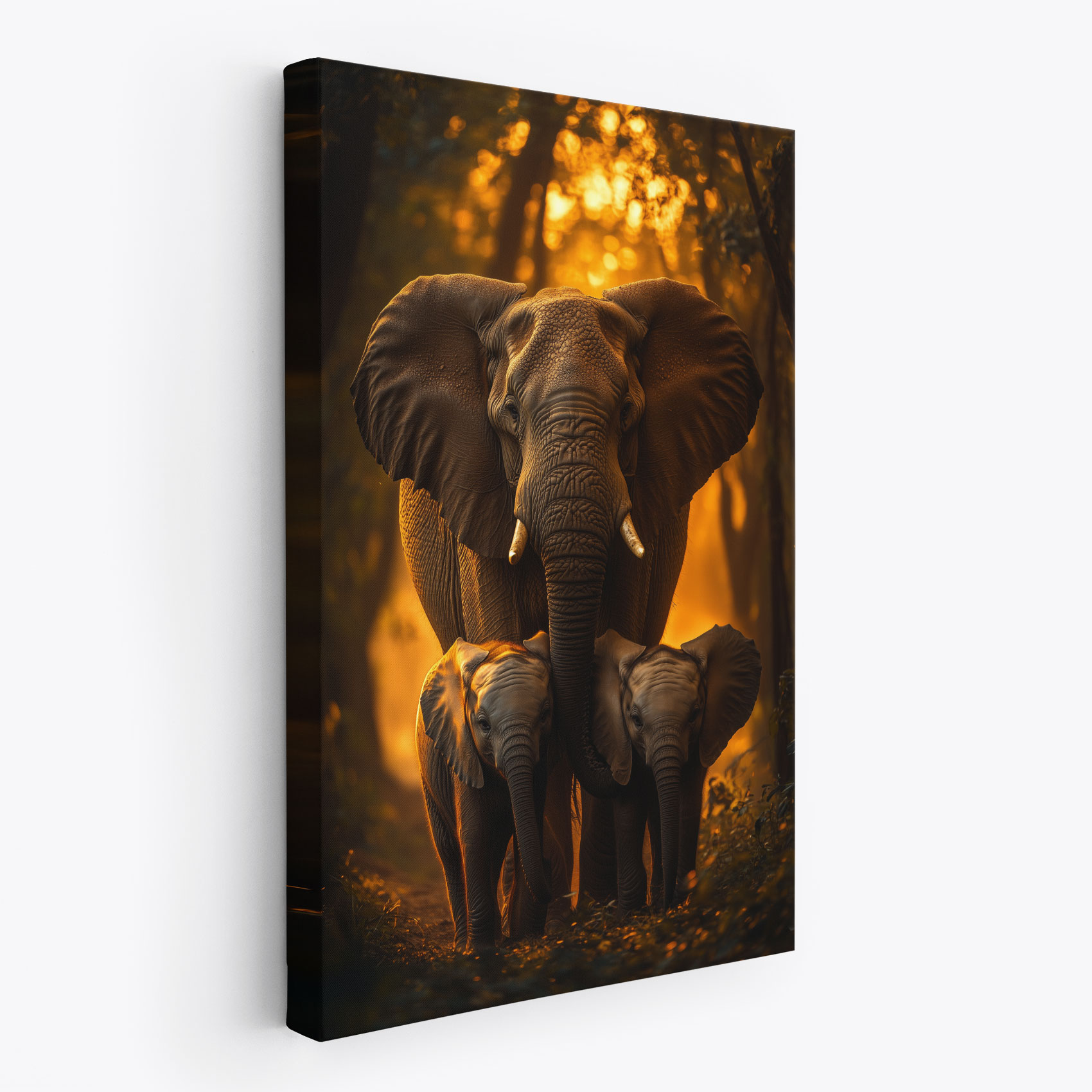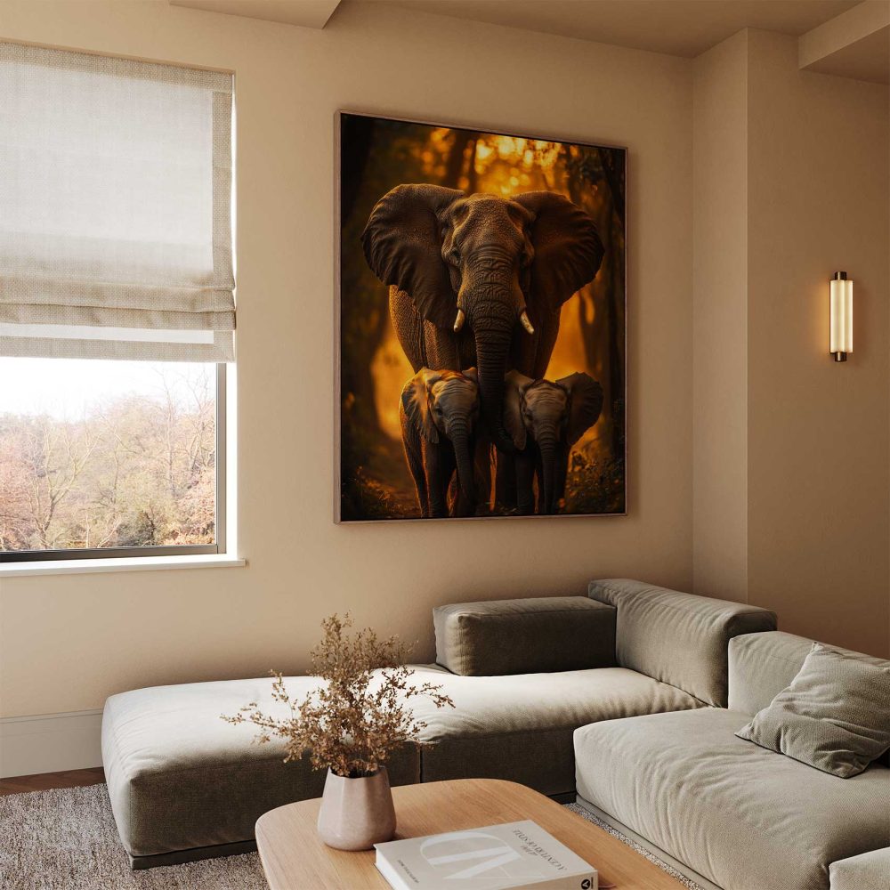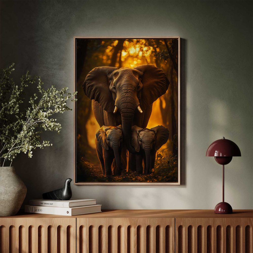 Terug naar collectie / Schilderijen / Bossen Schilderij / Majestueuze olifantenfamilie bij zonsondergang