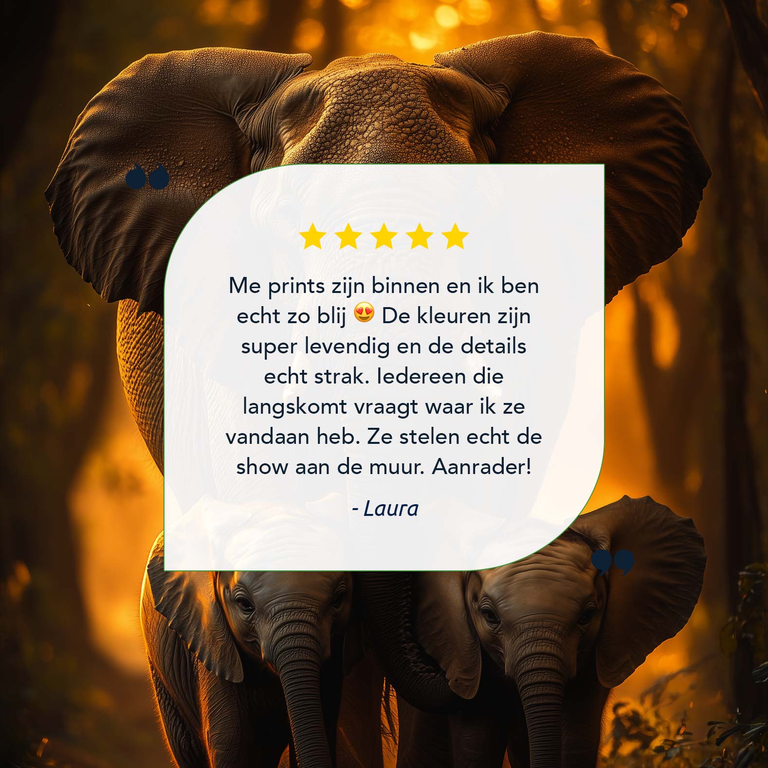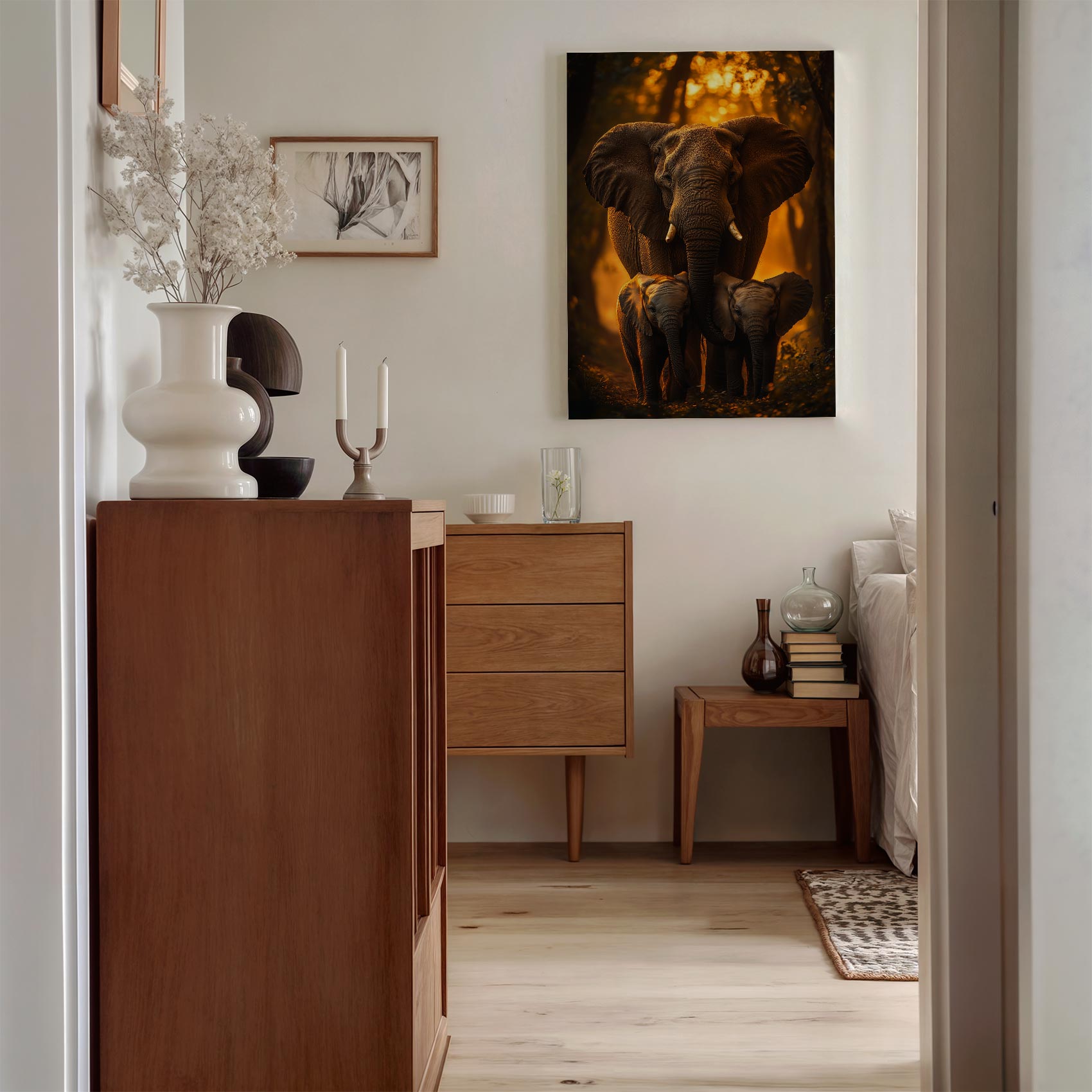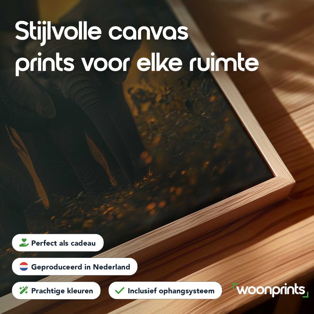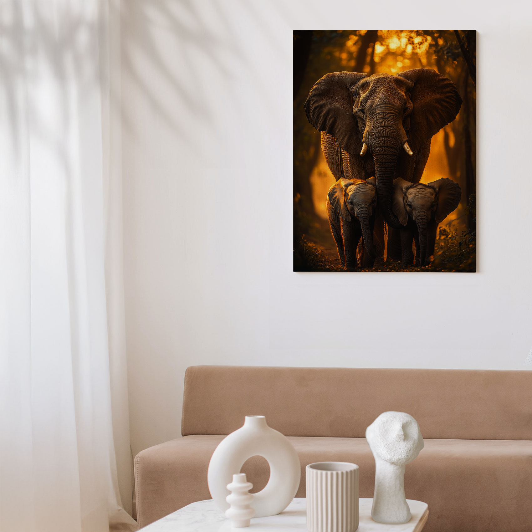 Terug naar collectie / Schilderijen / Bossen Schilderij / Majestueuze olifantenfamilie bij zonsondergang