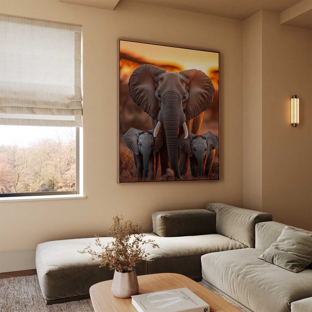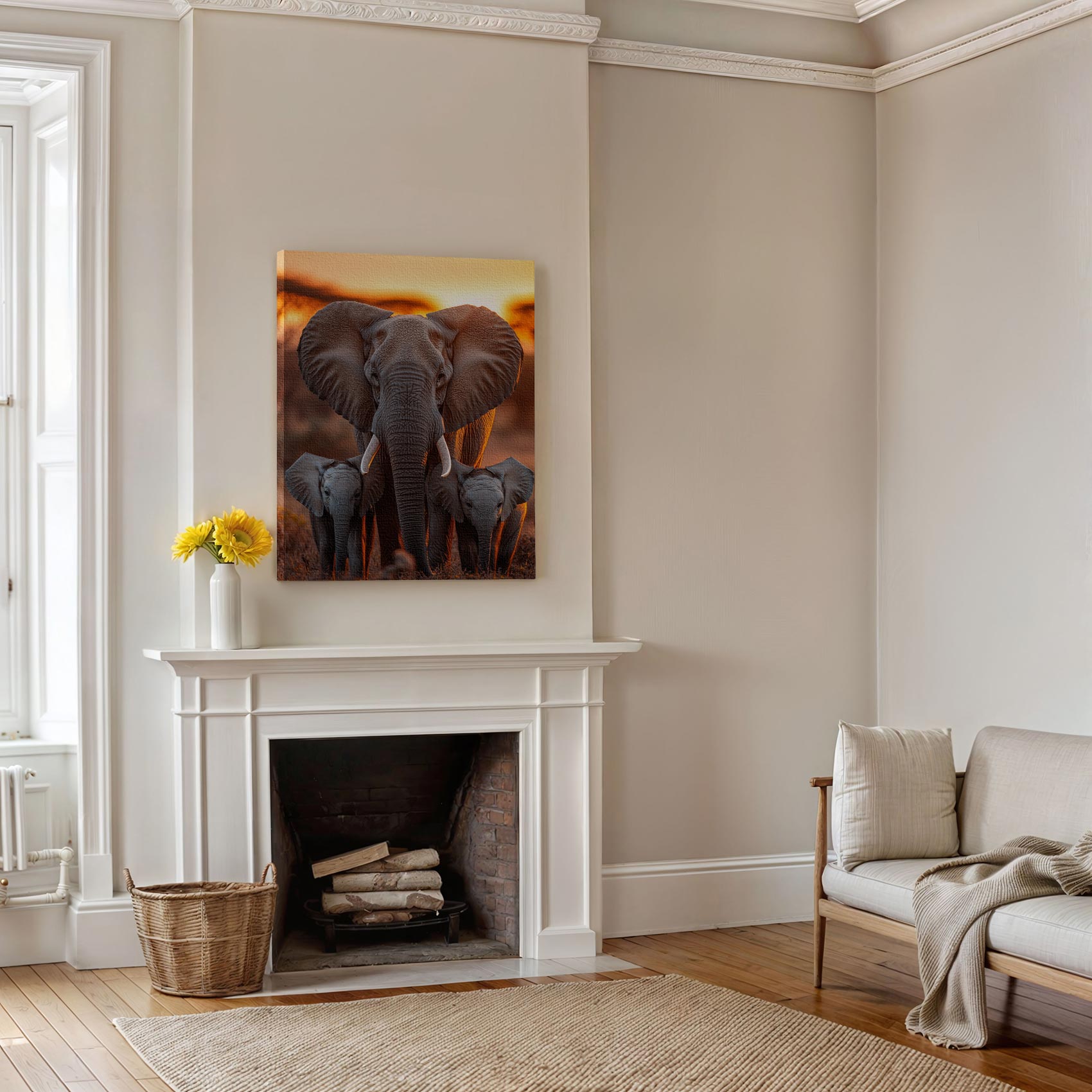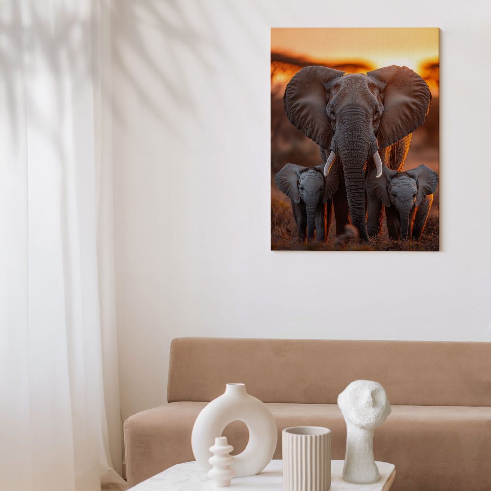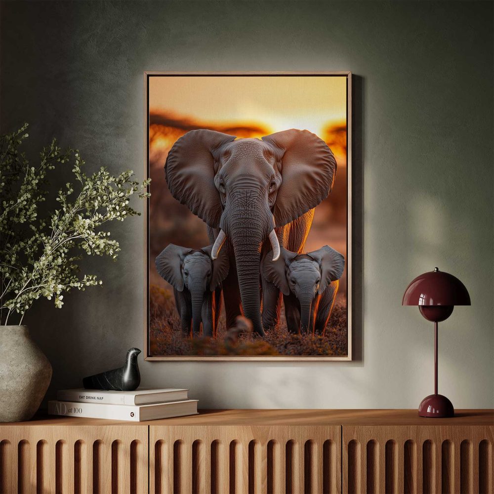 Terug naar collectie / Schilderijen / Dieren Schilderij / Majestueuze olifantenfamilie bij zonsondergang