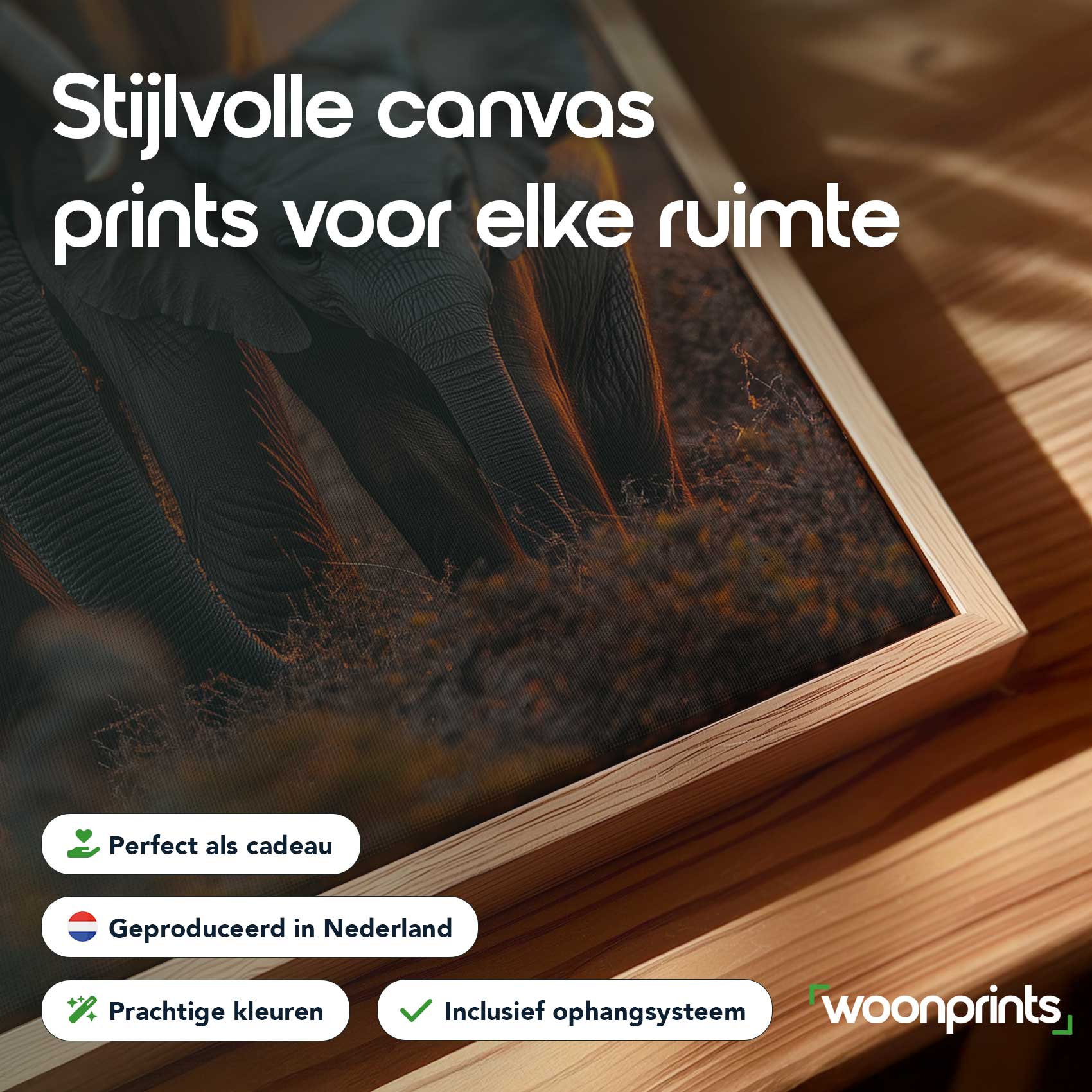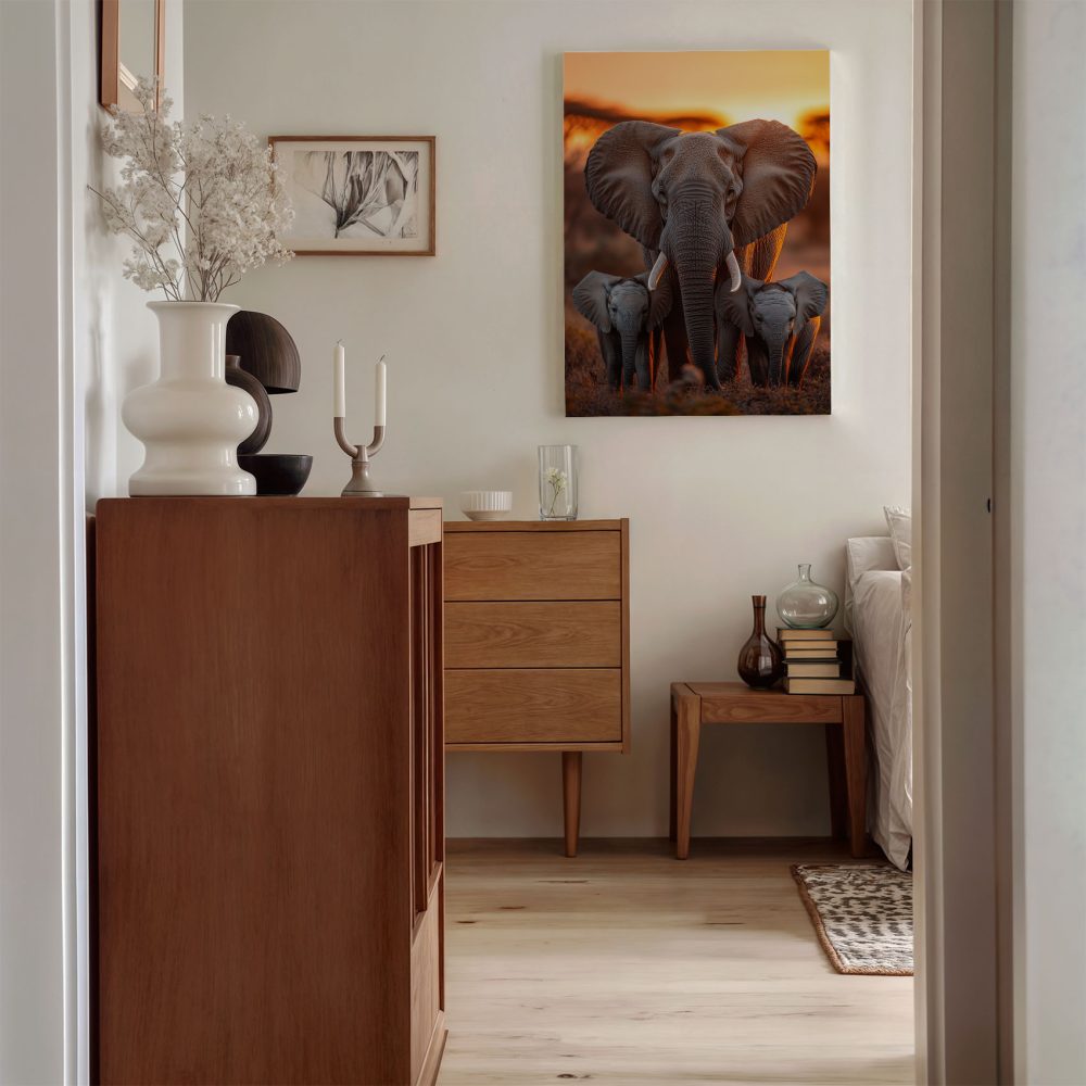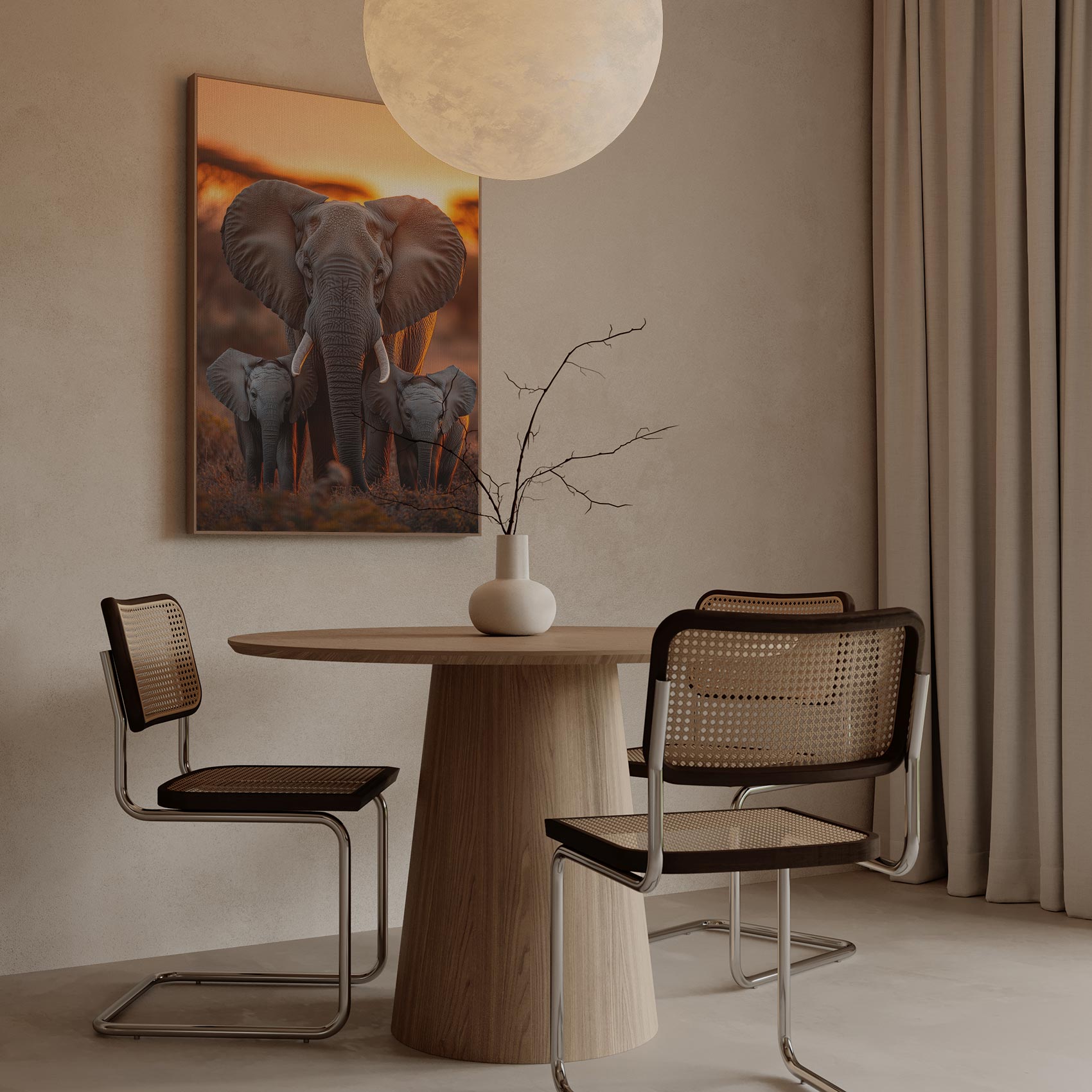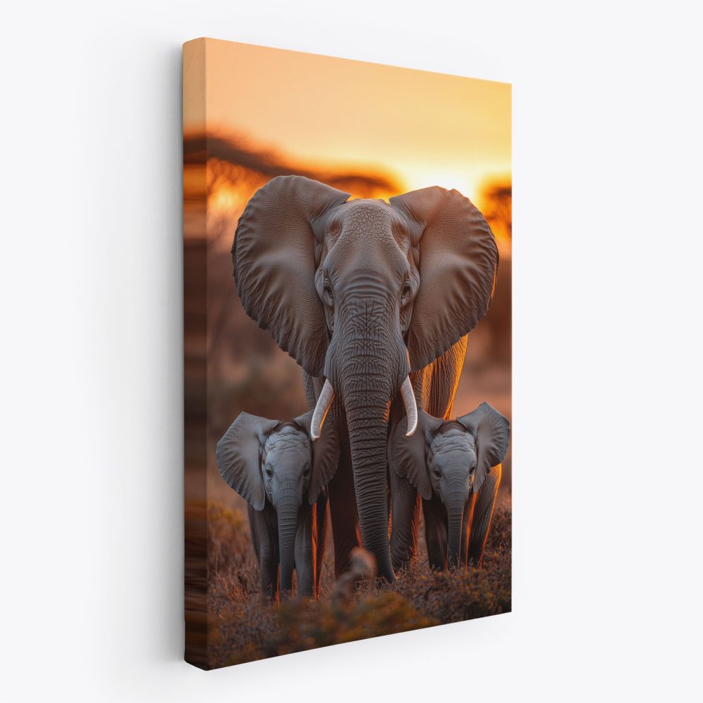 Terug naar collectie / Schilderijen / Dieren Schilderij / Majestueuze olifantenfamilie bij zonsondergang