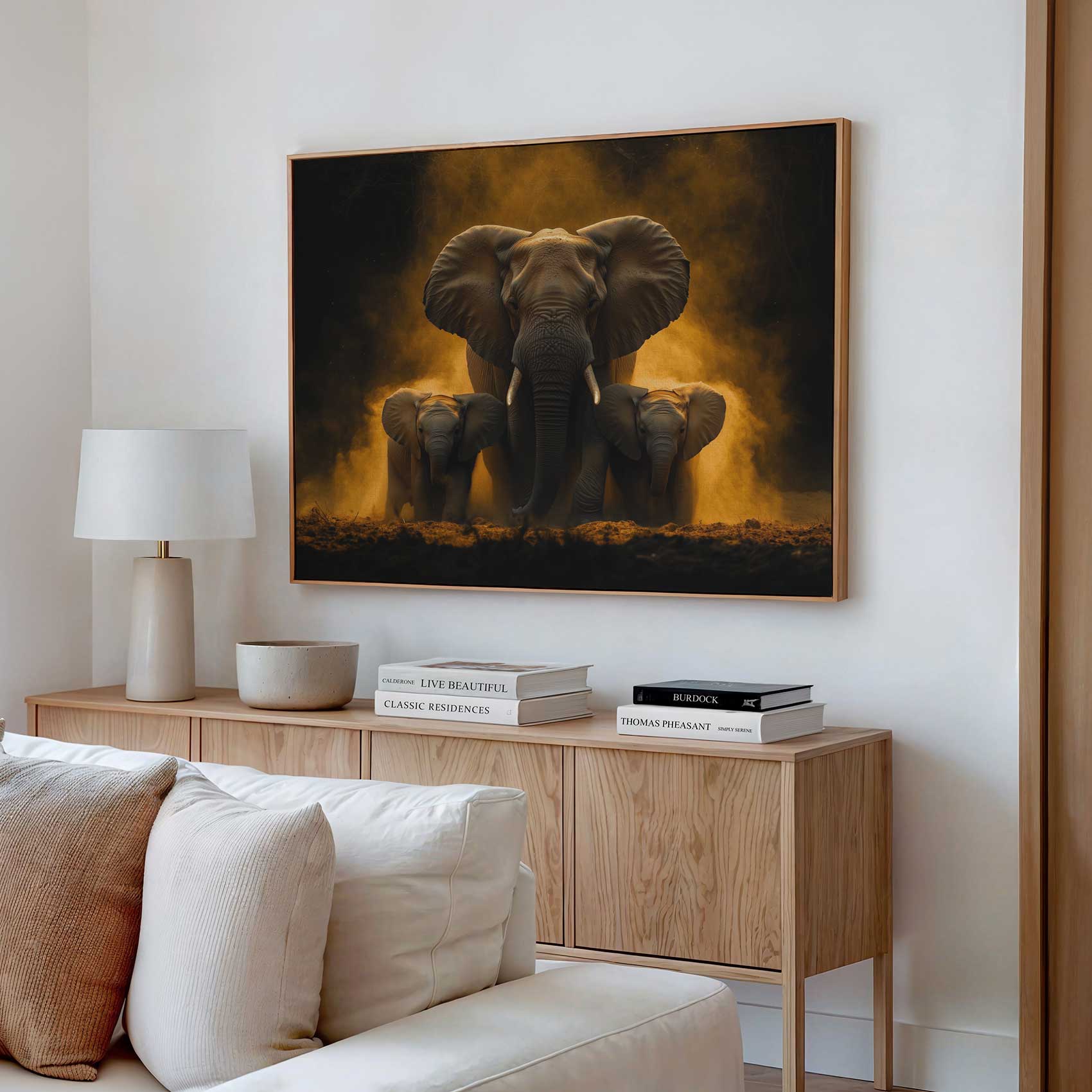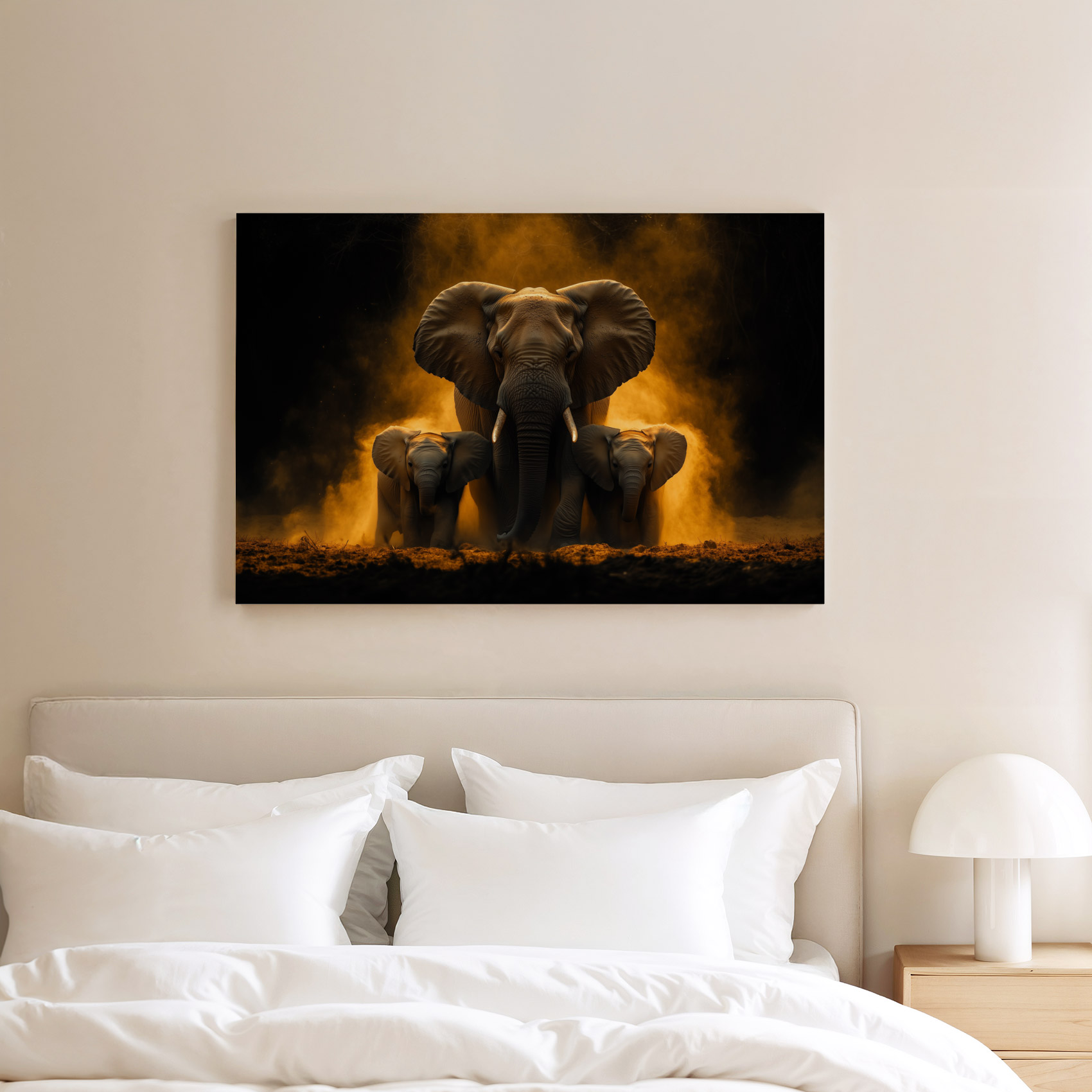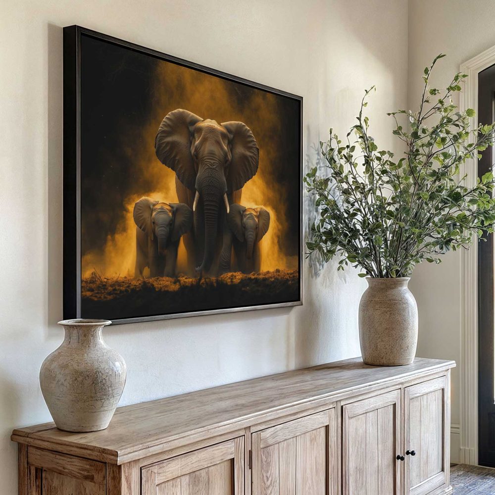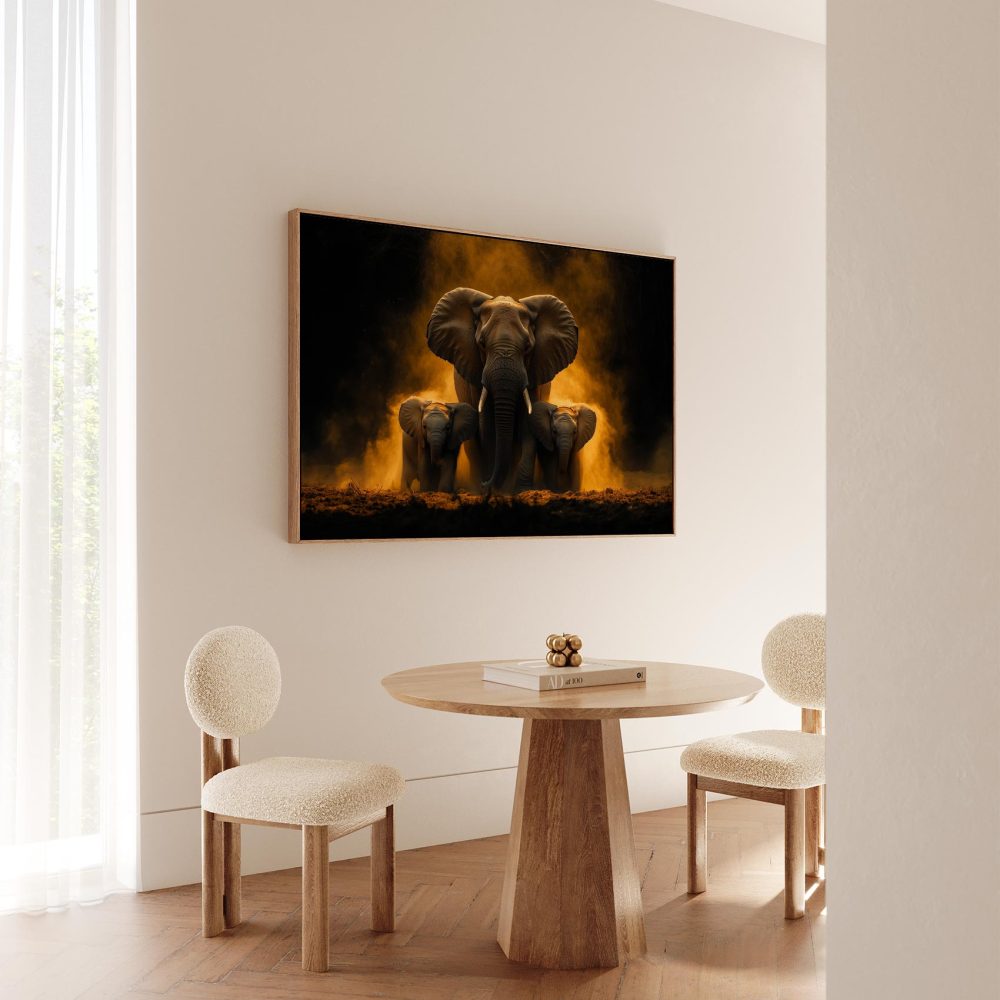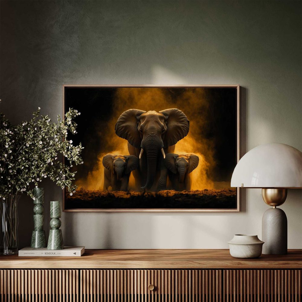 Terug naar collectie / Schilderijen / Dieren Schilderij / Majestueuze olifantenfamilie in vlammen