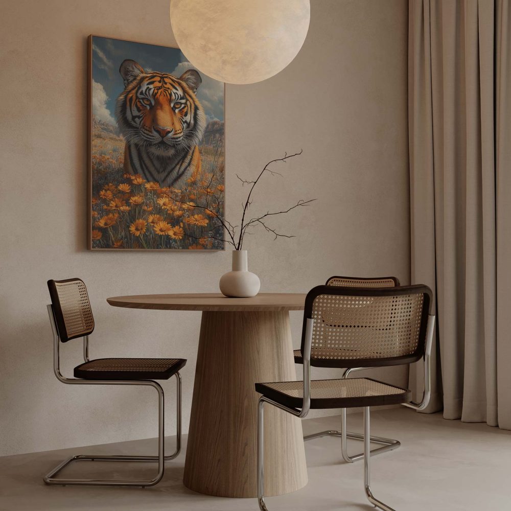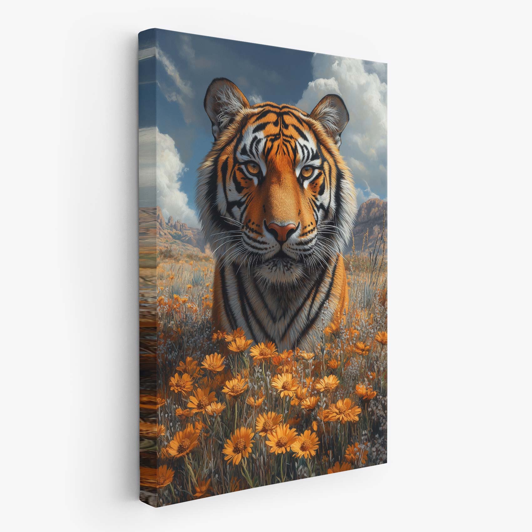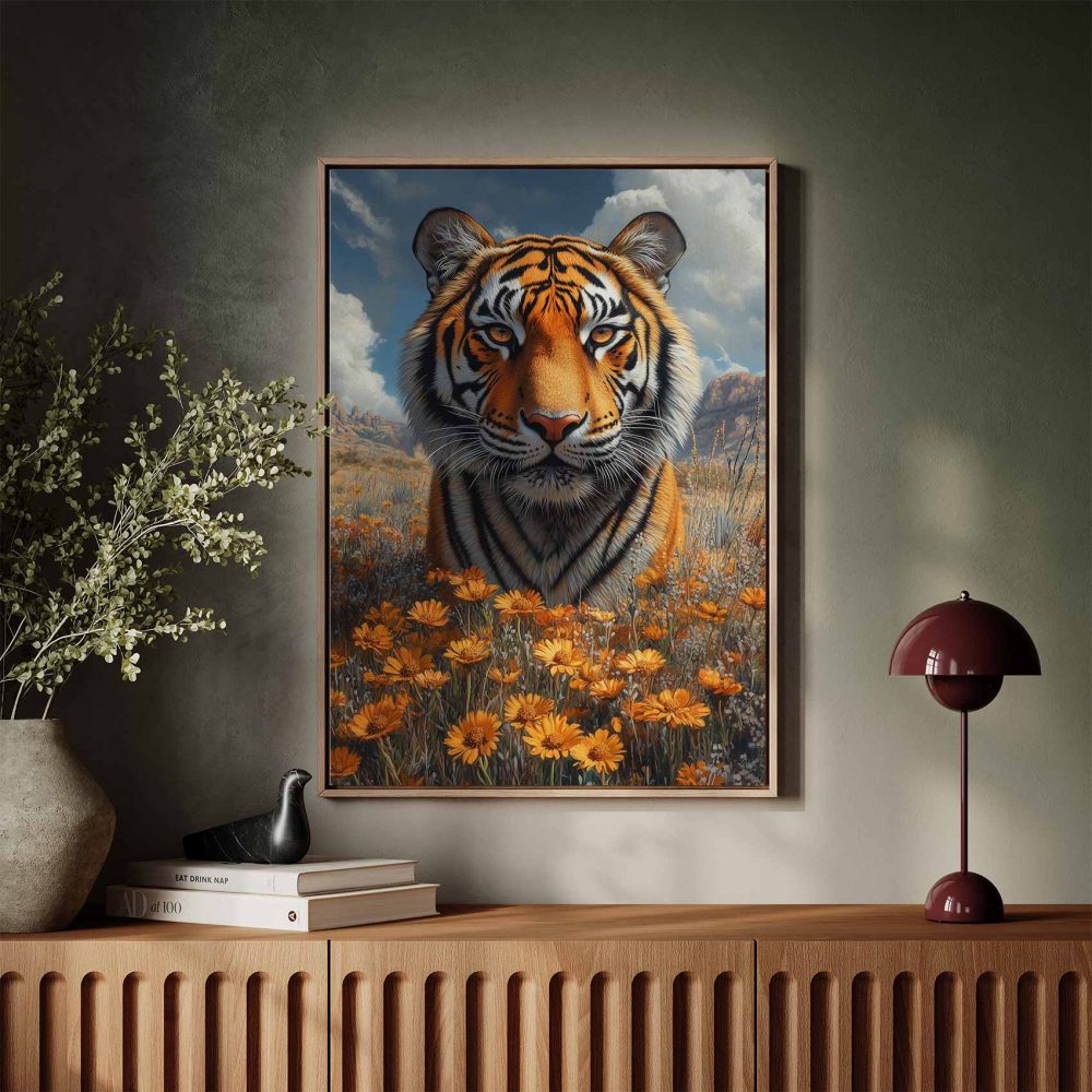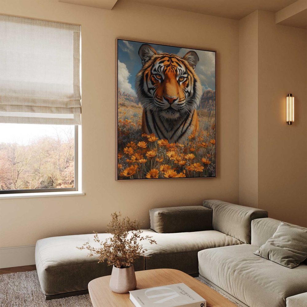 Terug naar collectie / Schilderijen / Bergen Schilderij / Majestueuze tijger in bloemenveld