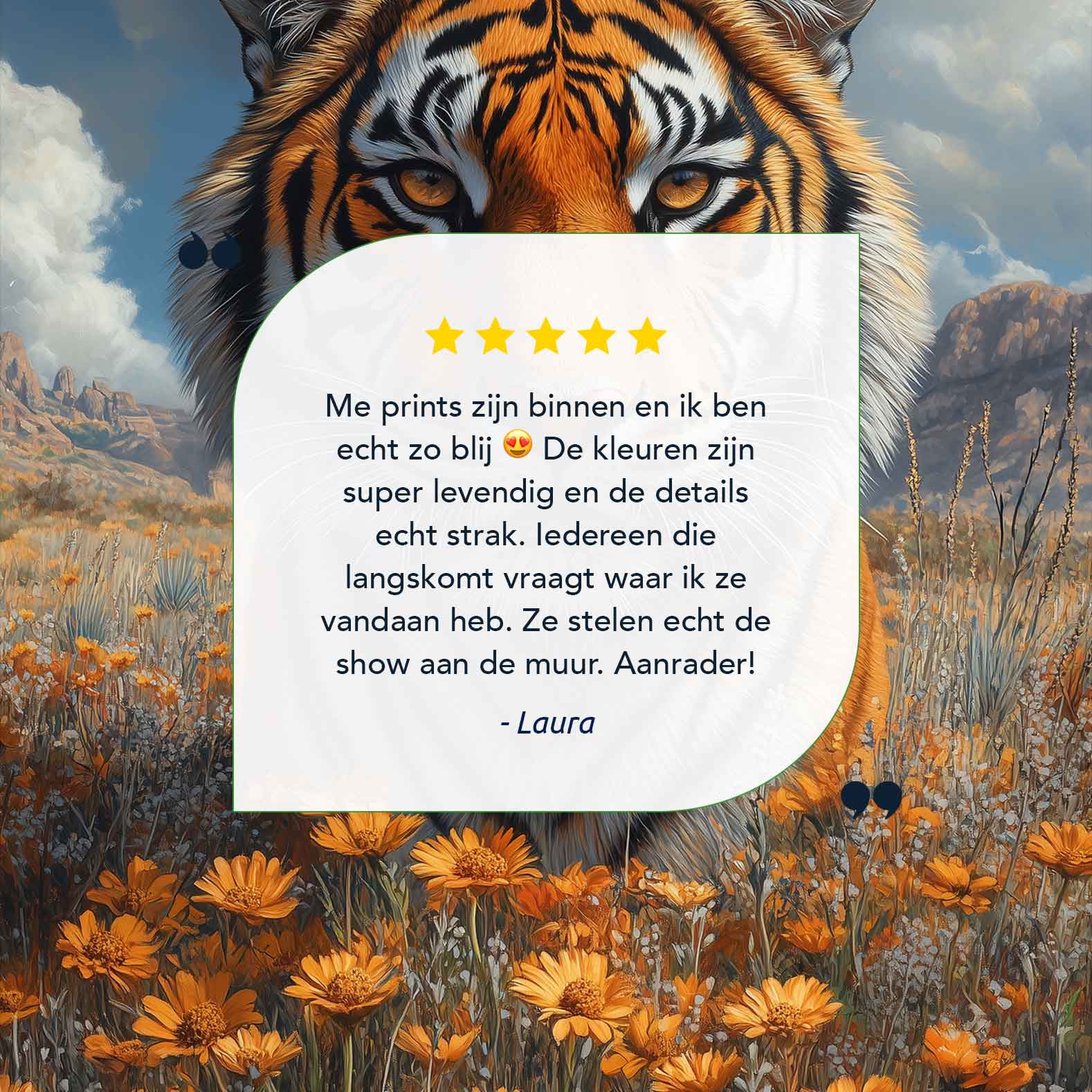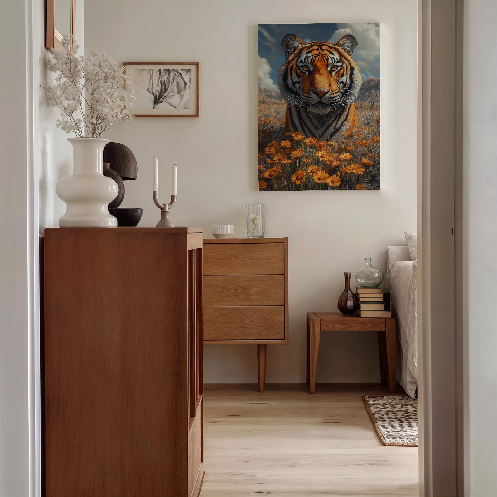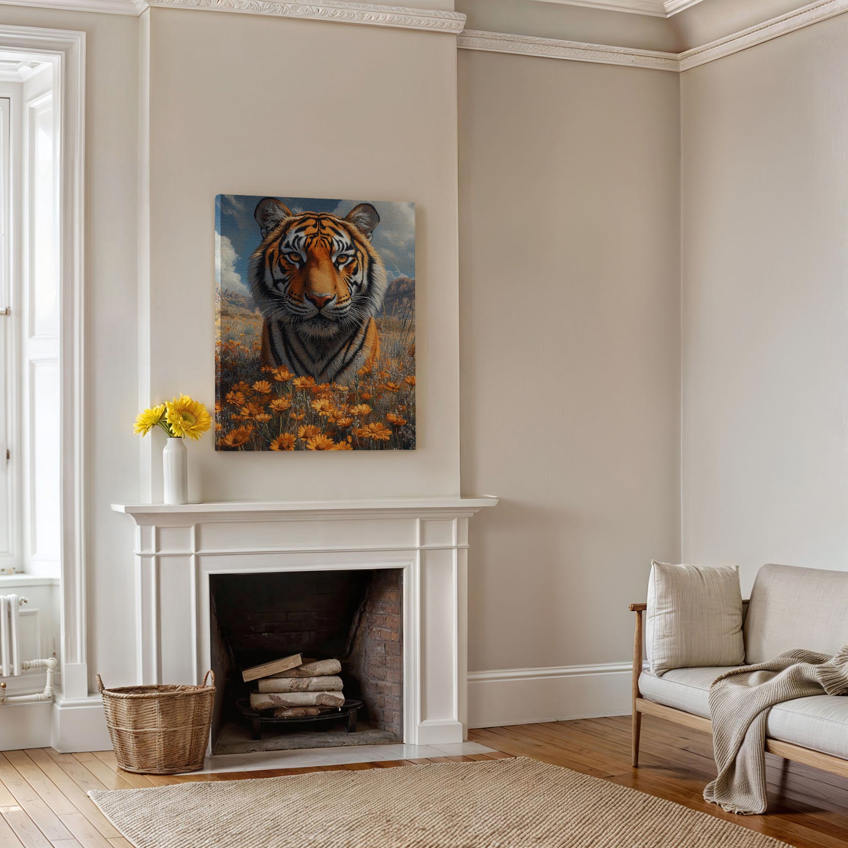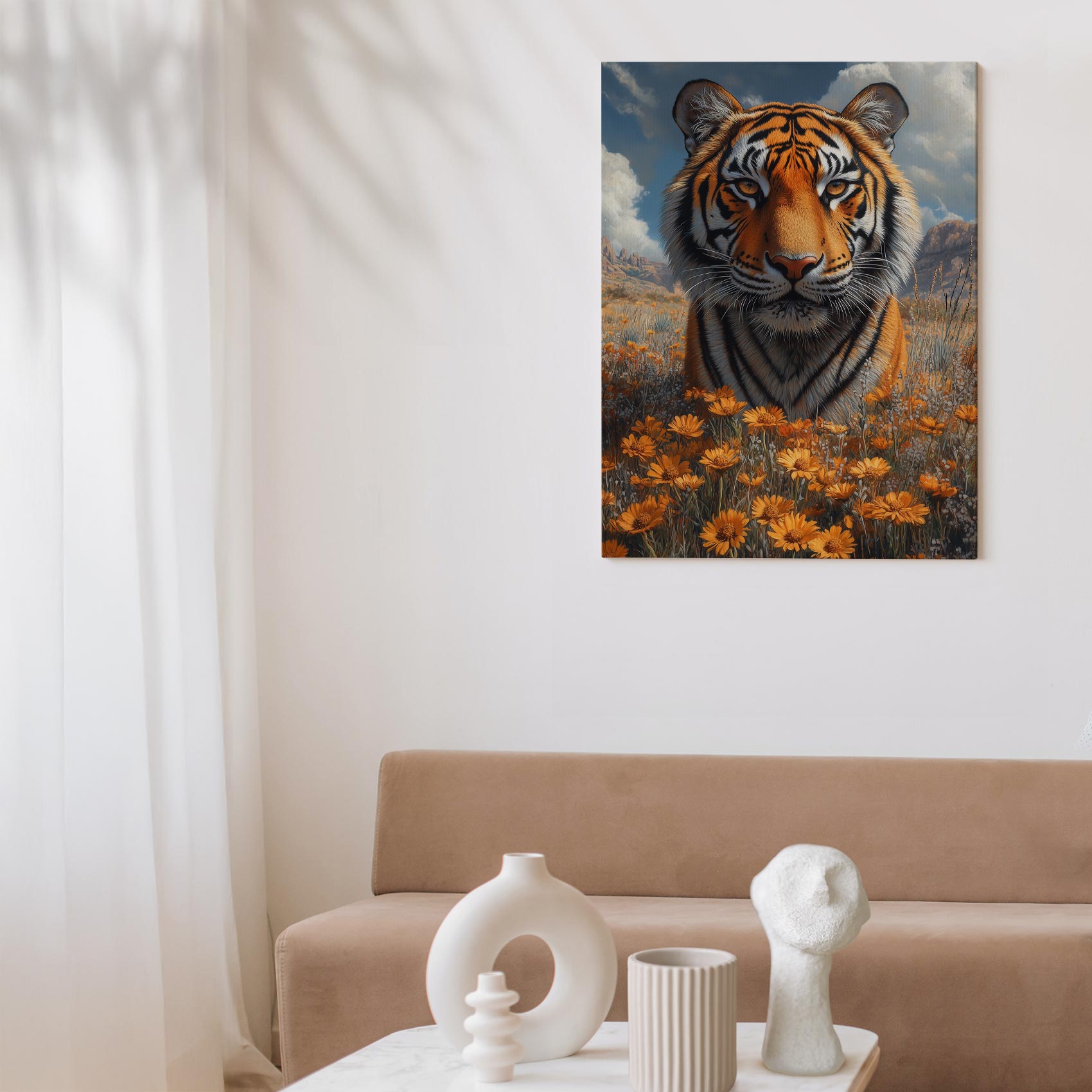Terug naar collectie / Schilderijen / Bergen Schilderij / Majestueuze tijger in bloemenveld