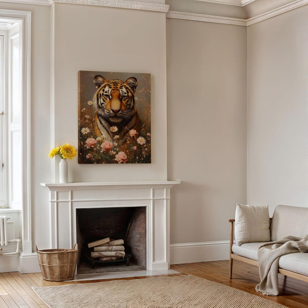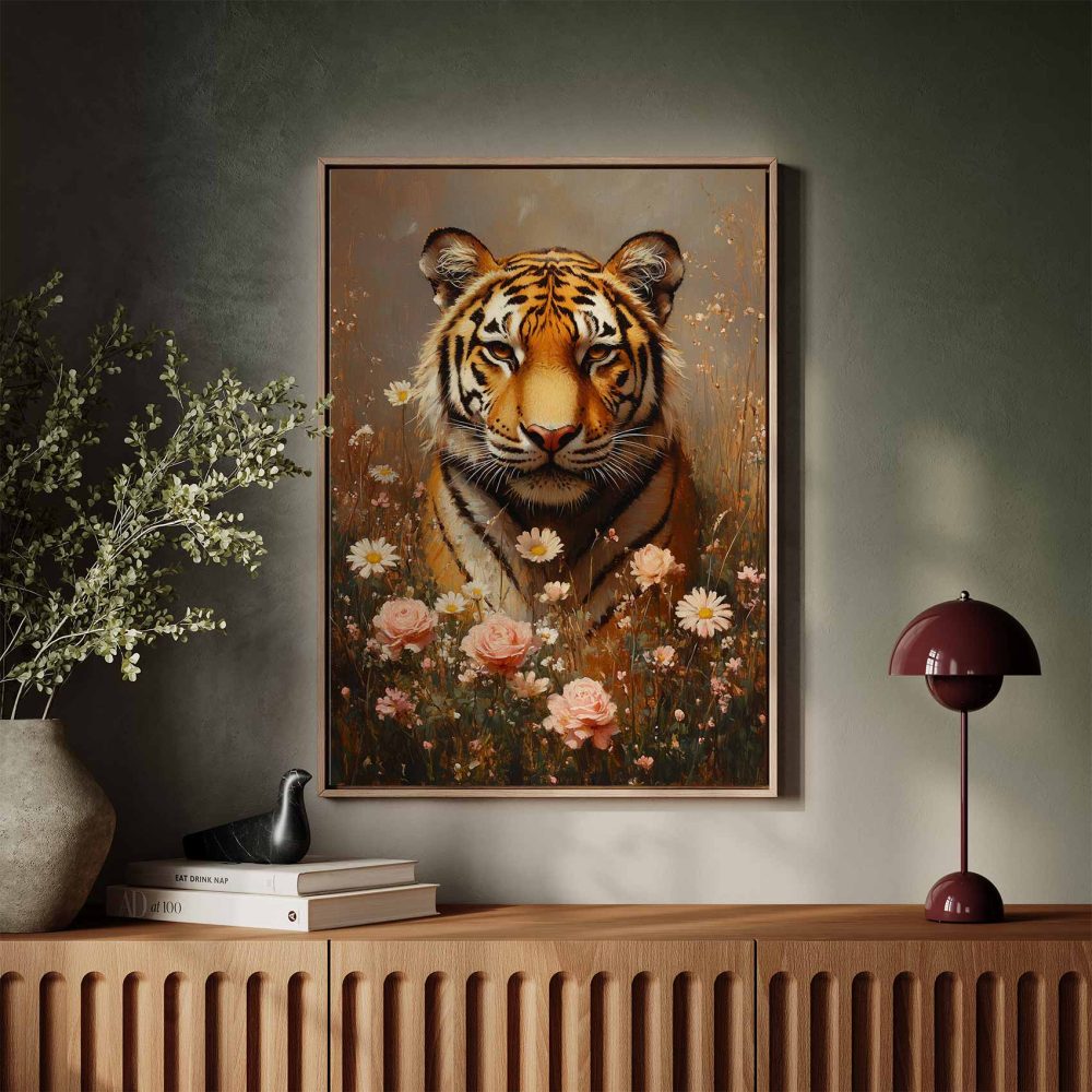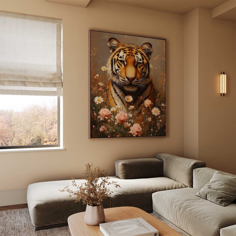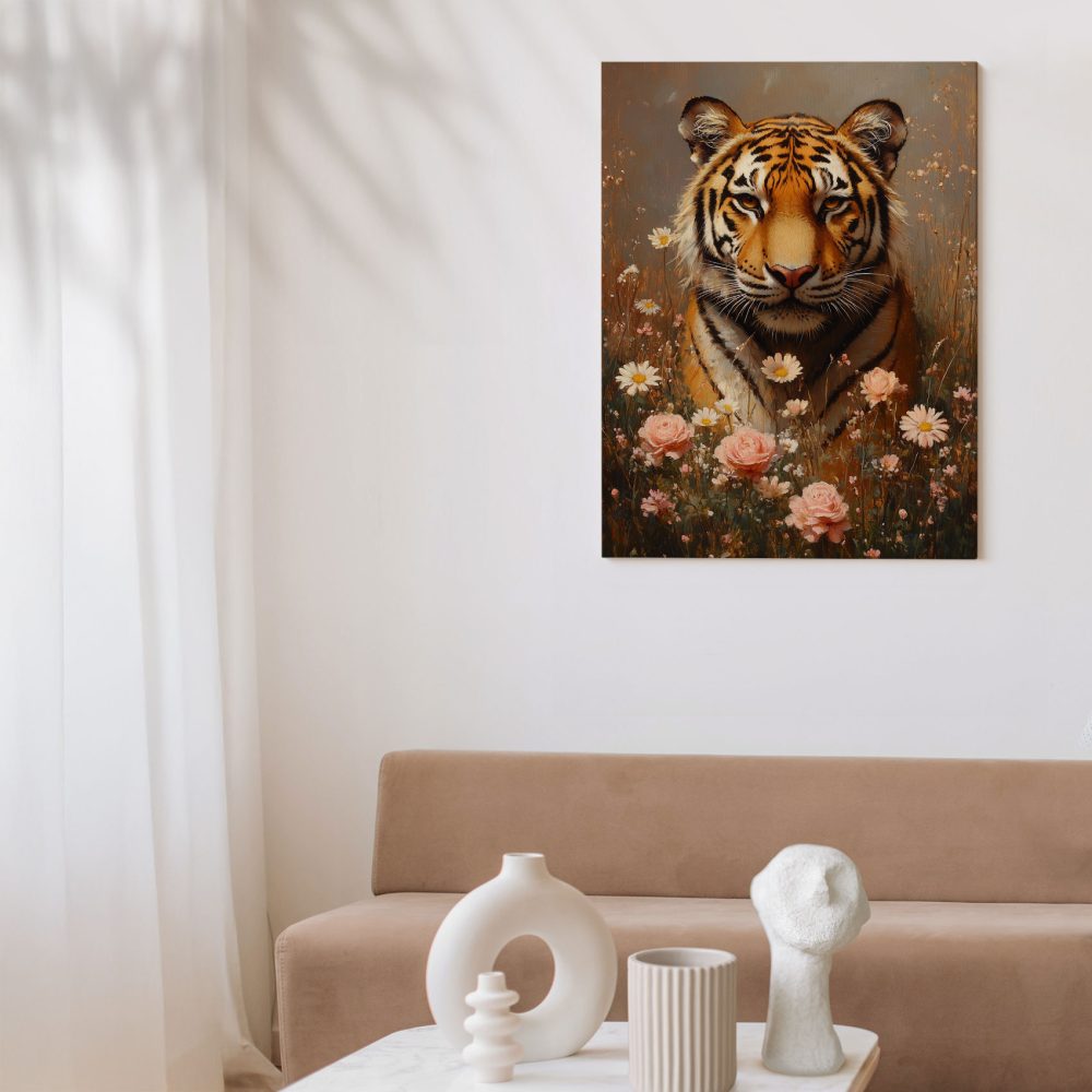 Terug naar collectie / Schilderijen / Bloemen Schilderij / Majestueuze tijger tussen bloemen