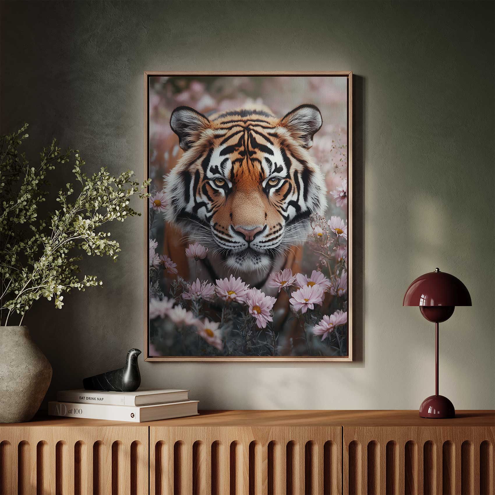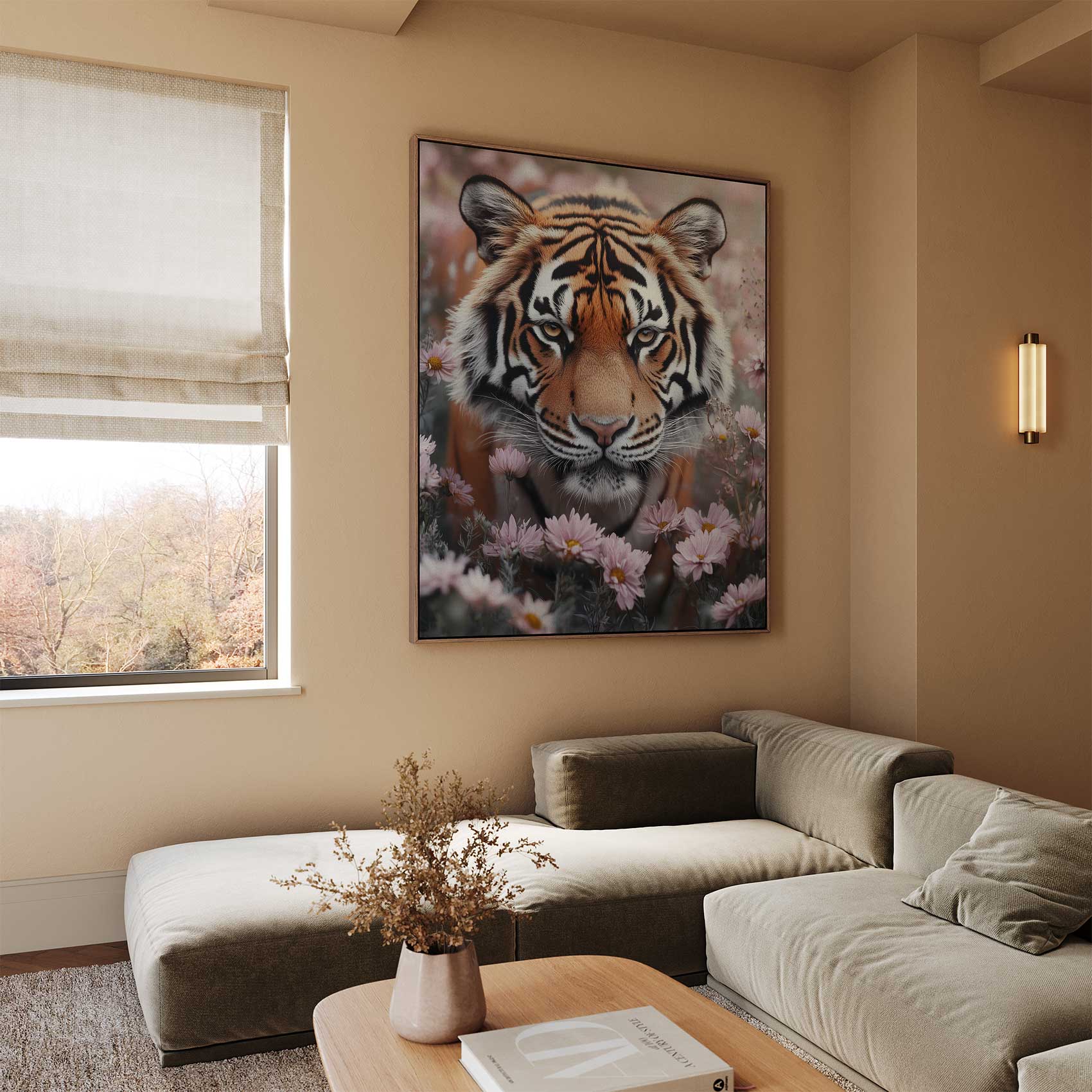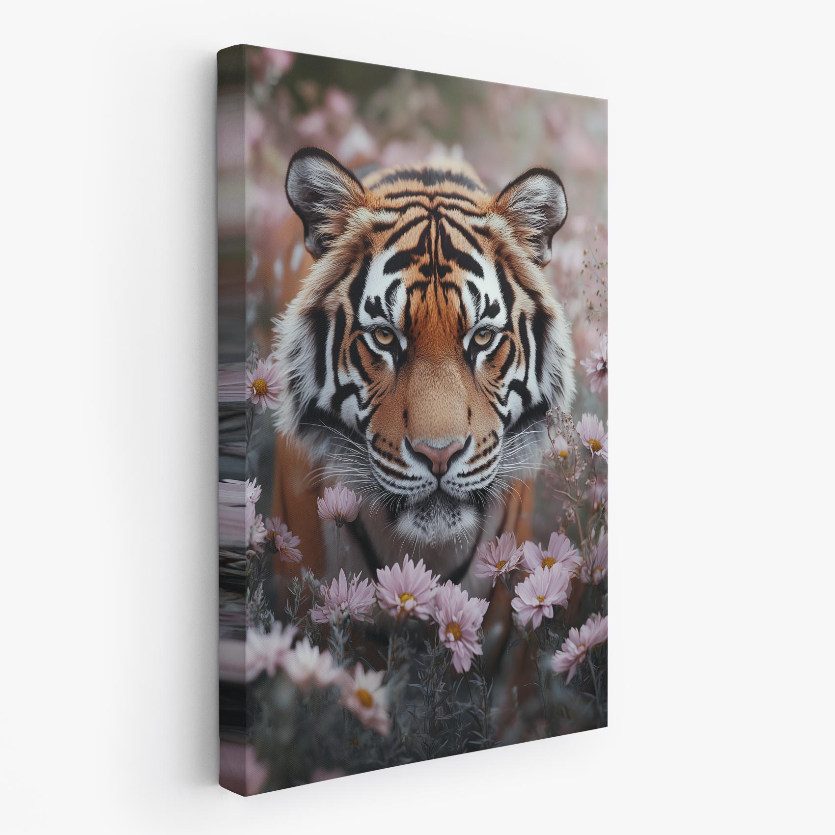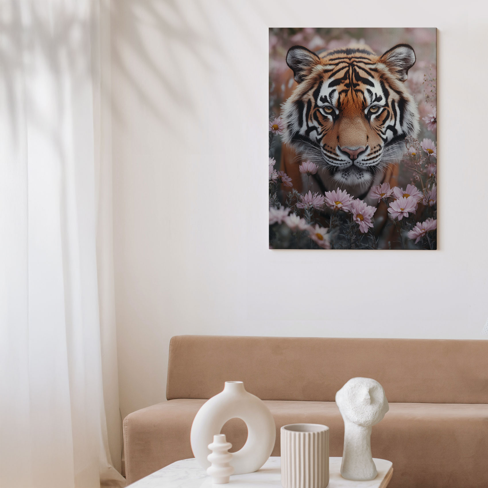 Terug naar collectie / Schilderijen / Bloemen Schilderij / Majestueuze tijger tussen roze bloemen