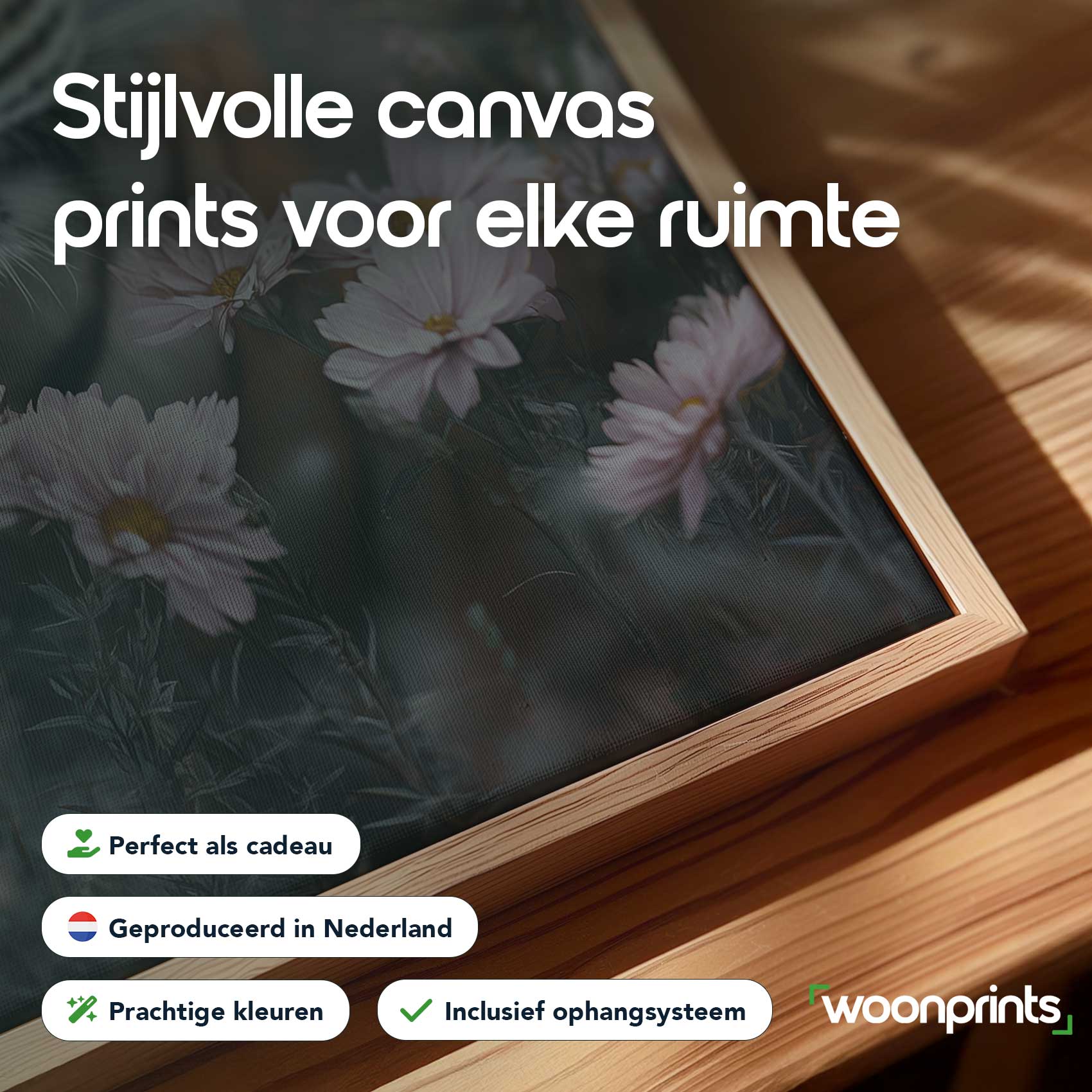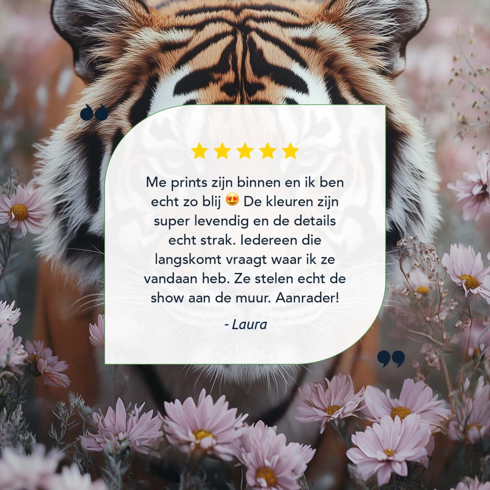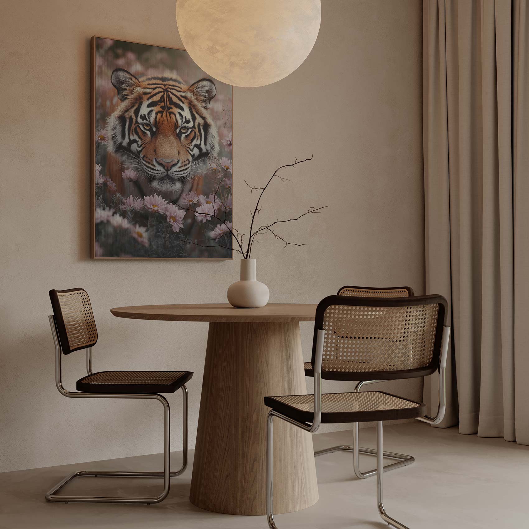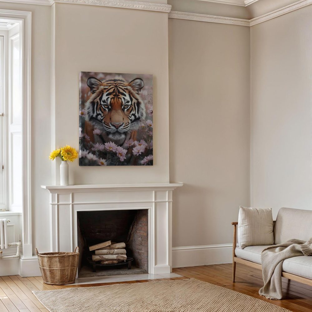 Terug naar collectie / Schilderijen / Bloemen Schilderij / Majestueuze tijger tussen roze bloemen